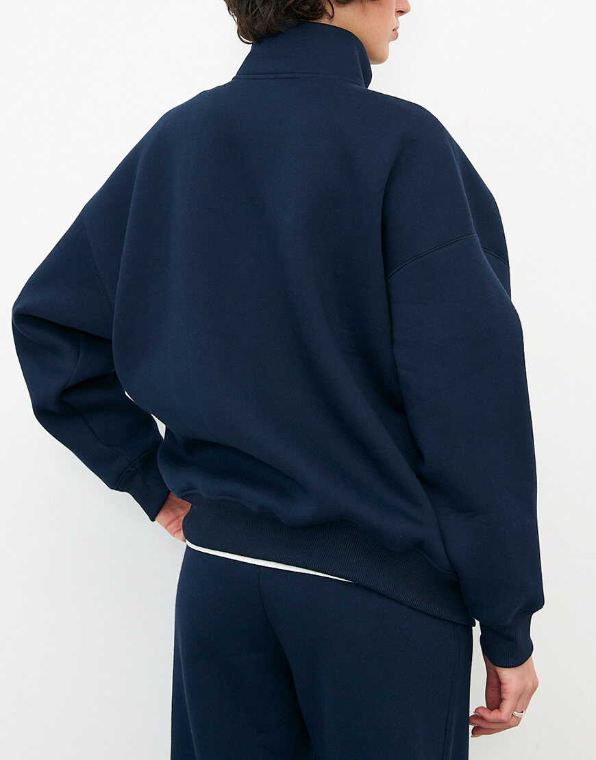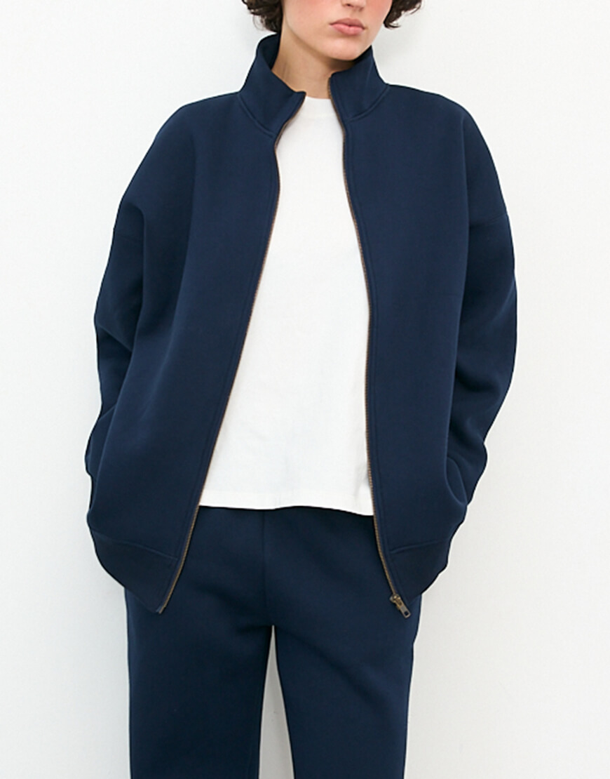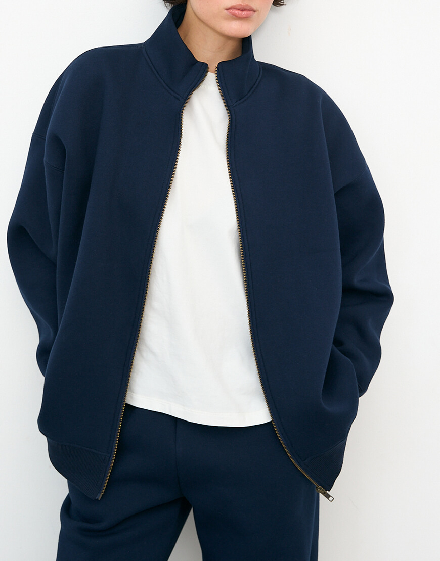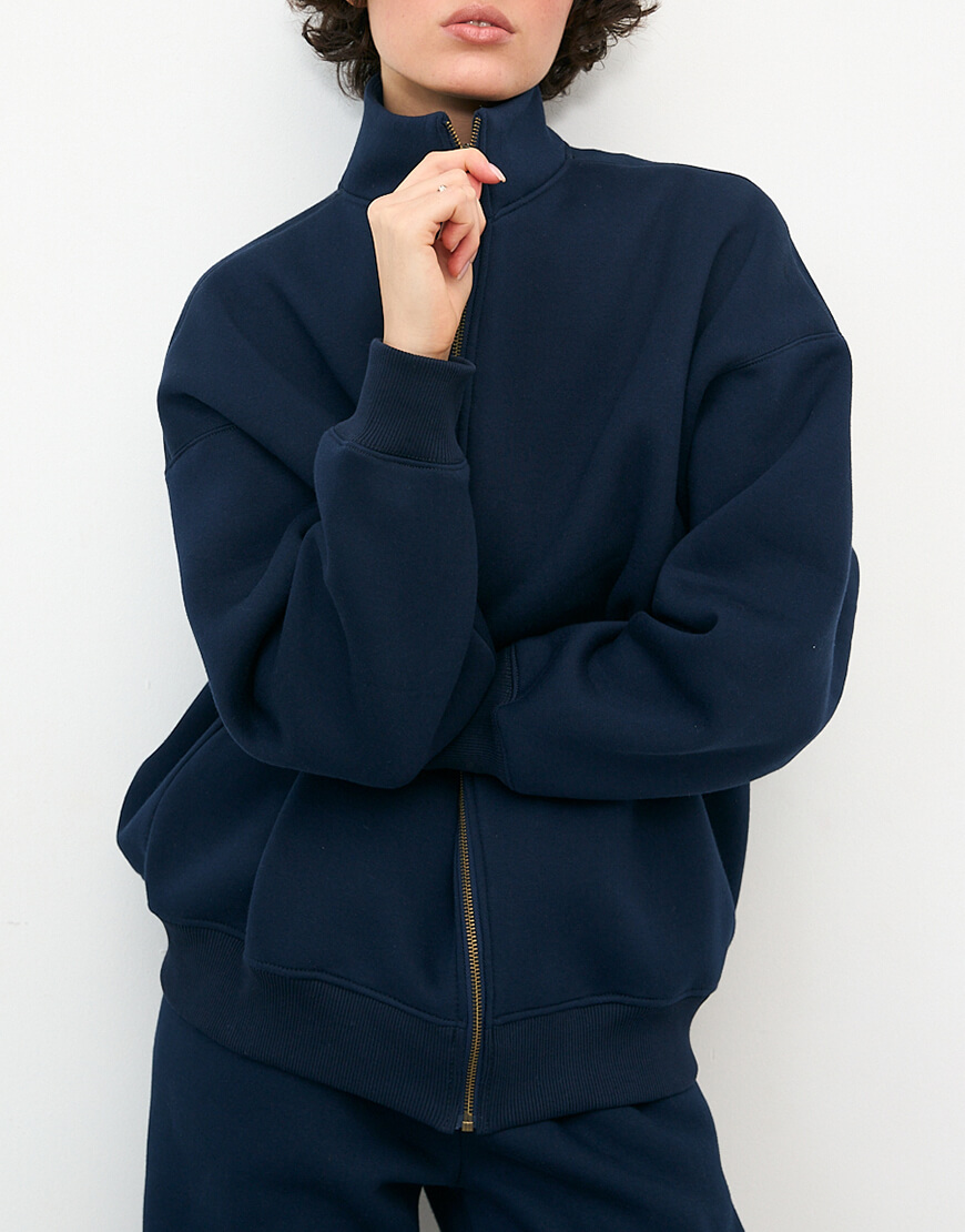 Світшот на замку темно-синього кольору. Утеплений трикотаж з начосом, добре тримає форму та неймовірно теплий. Крій оверсайз.