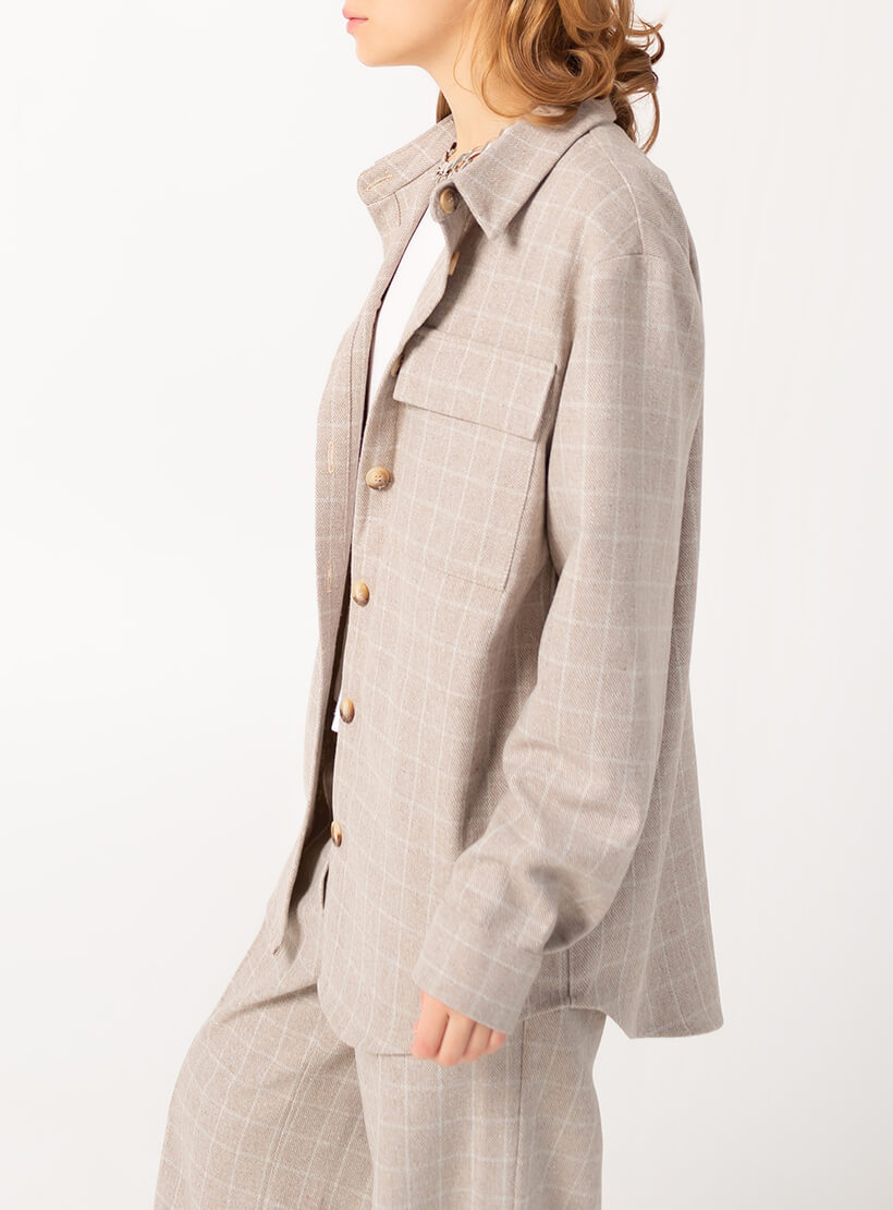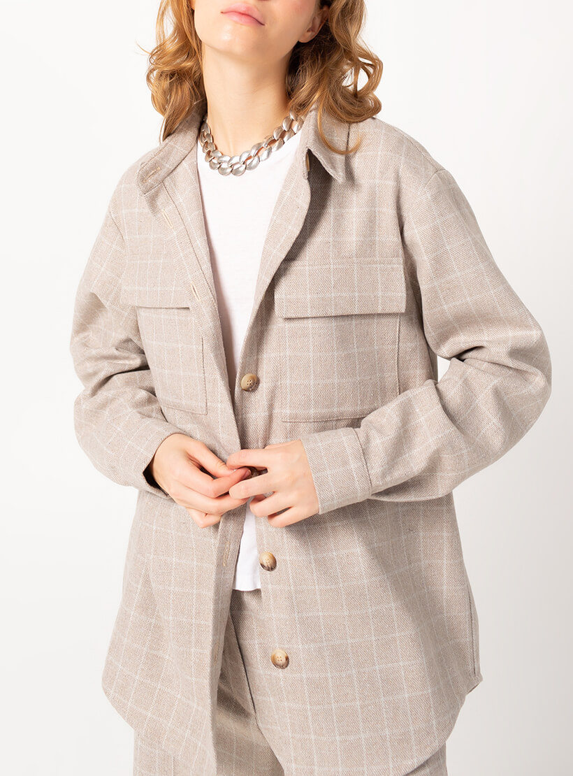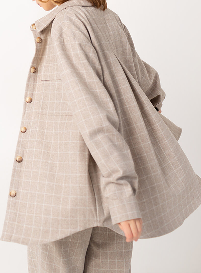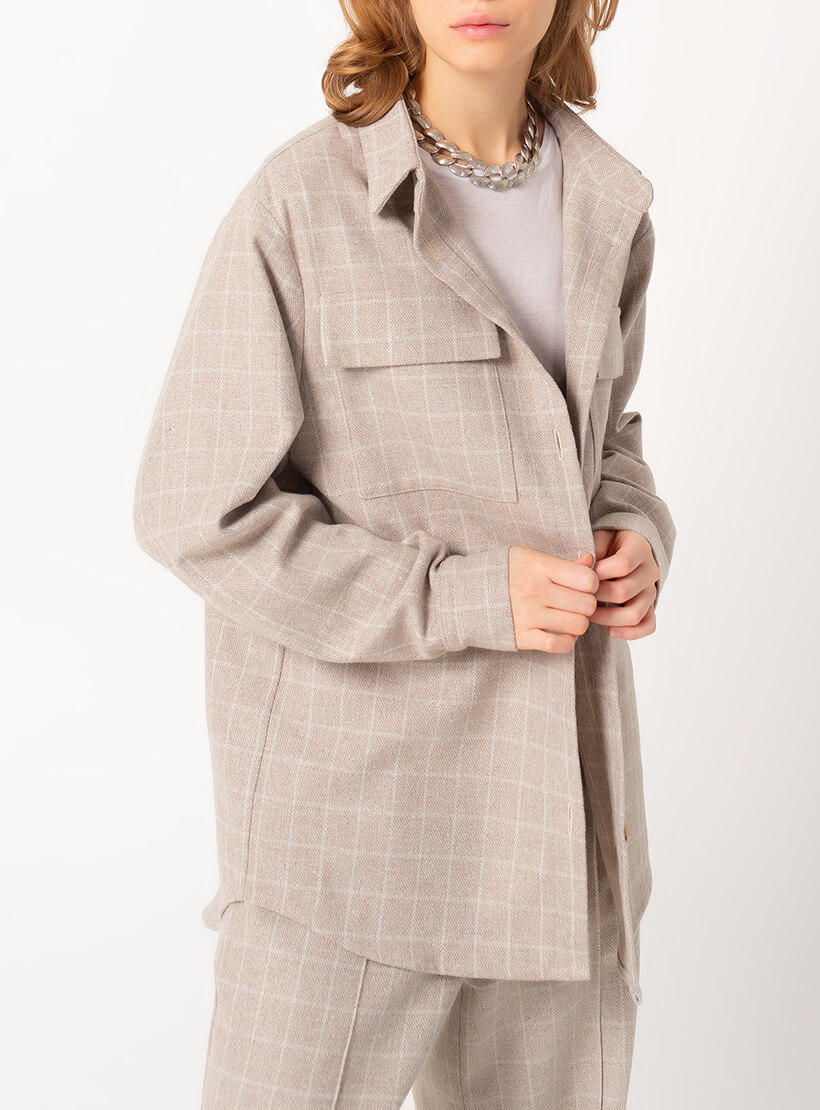 Костюм із сорочки та штанів. Штани кльош у бежево-білу клітинку. Спереду складка і загладжена стрілка. Посадка висока, з гульфиком на блискавці. З боків кишені. Сорочка оверсайз із коміром-стійка. Планка з ґудзиками, великі нагрудні кишені. На рукавах манжети з ґудзиками. Широка складка на спині. Спинка довша на 5 см. Тканина костюма м’яка, невибаглива в догляді. Походження тканини: Іспанія, Валенсія.