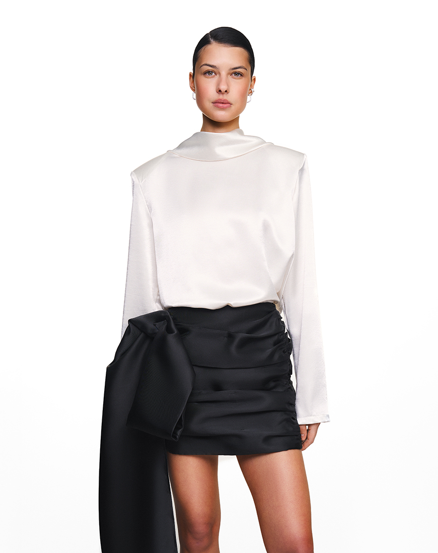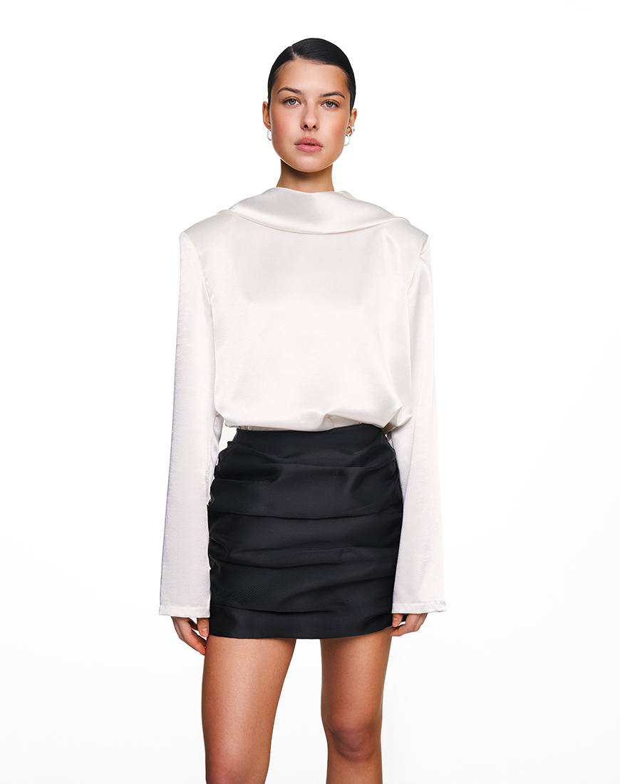Блуза білого кольору з жатим ефектом тканини. Має неймовірний лаконічний крій, що чудово поєднуватиметься з будь-яким низом. Попереду блуза повністю закрита та доповнюється підплічниками. Позаду має відкриту спинку , що додає виробу елегантності та жіночності.