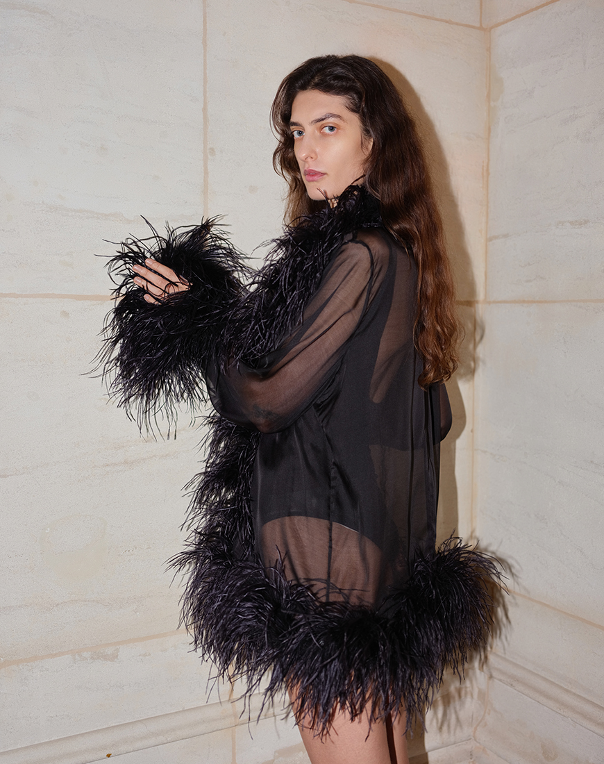 Доставка впродовж 2-5 робочих днівЕлегантна чорна сорочка з напівпрозорими довгими рукавами, оздоблена розкішним пір’ям, що додає образу драматичності та вишуканості.