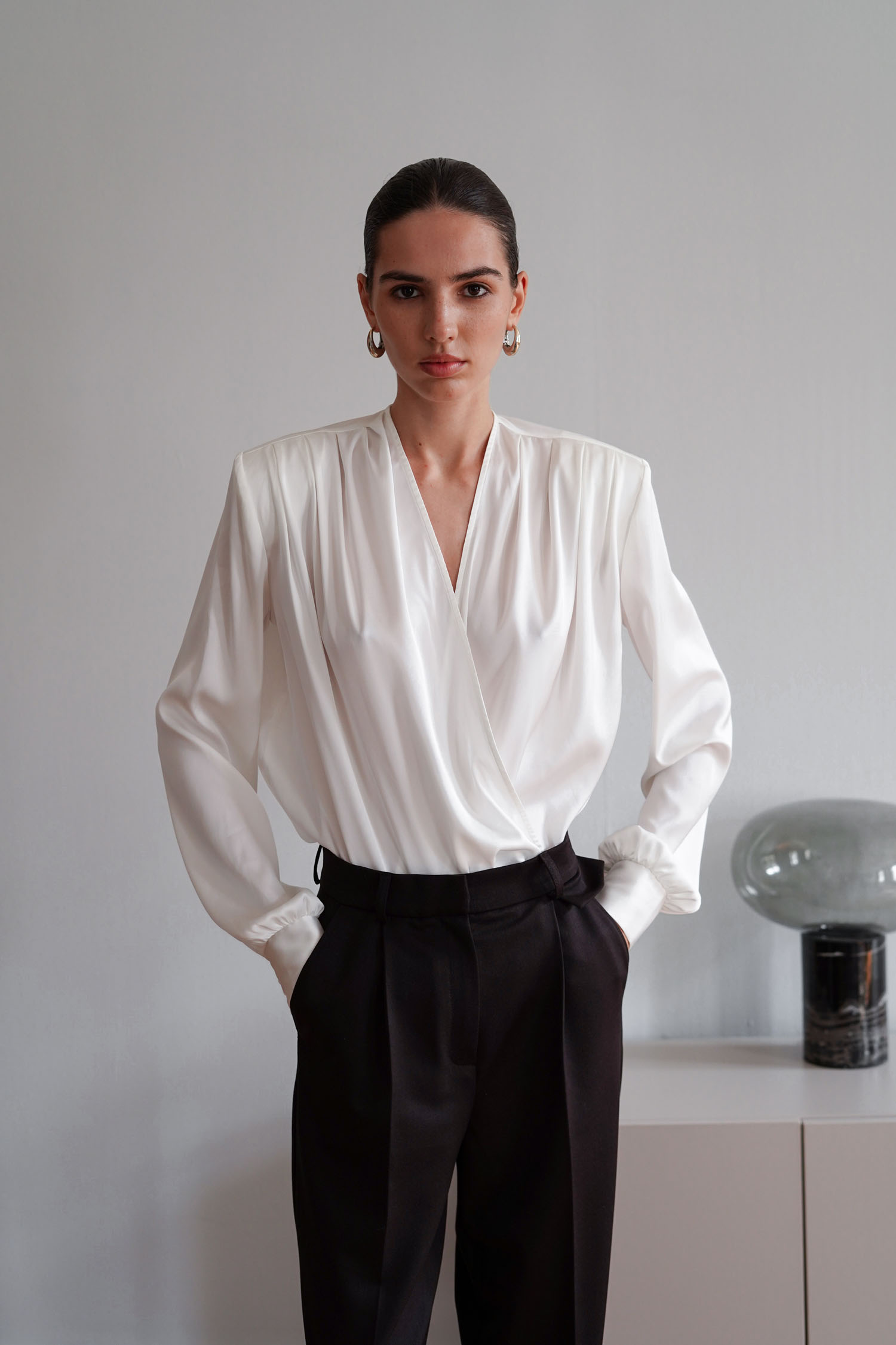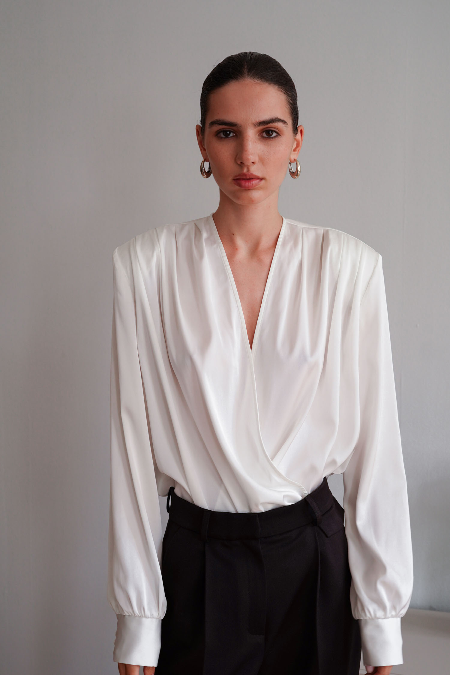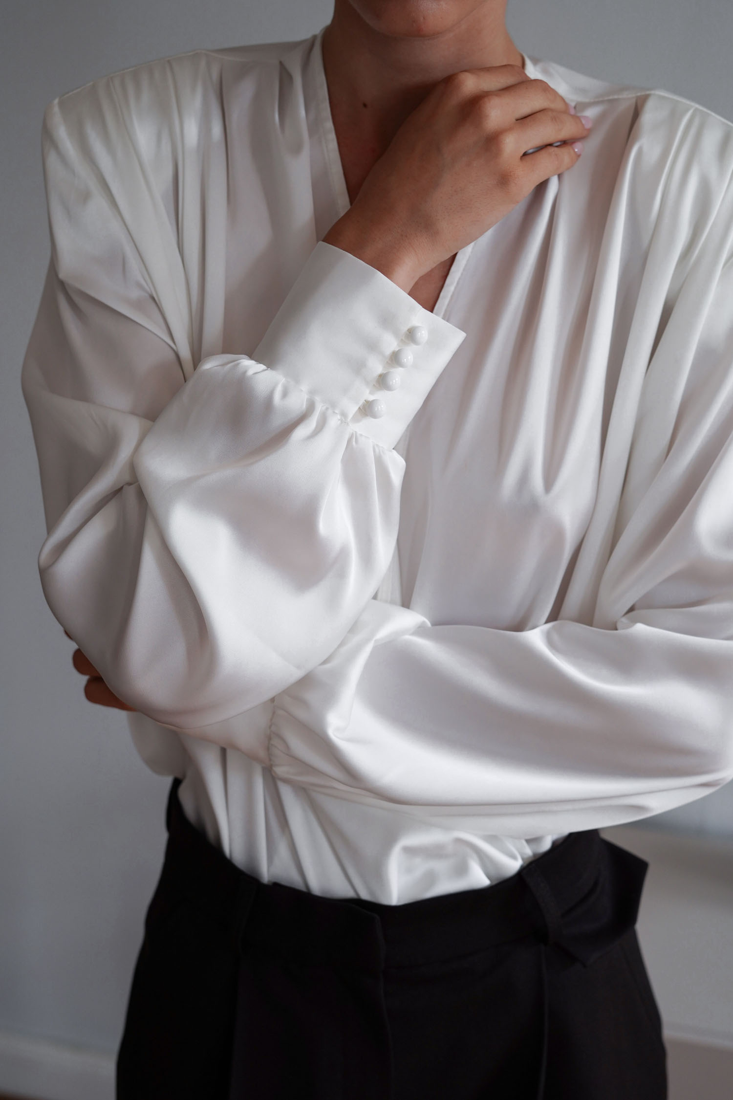Крій передбачає об’ємні рукави на манжетах і складки в зоні плечей.
