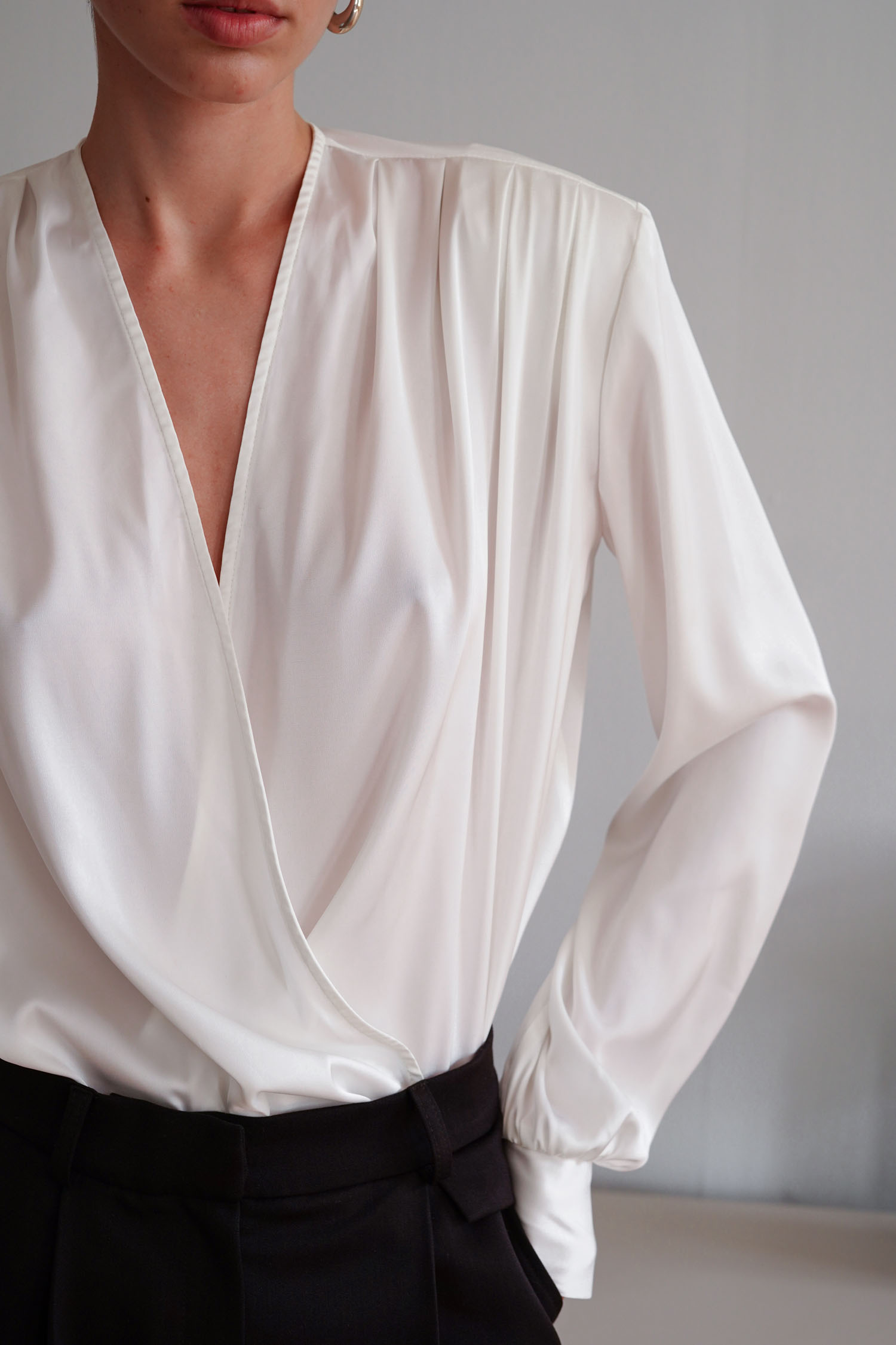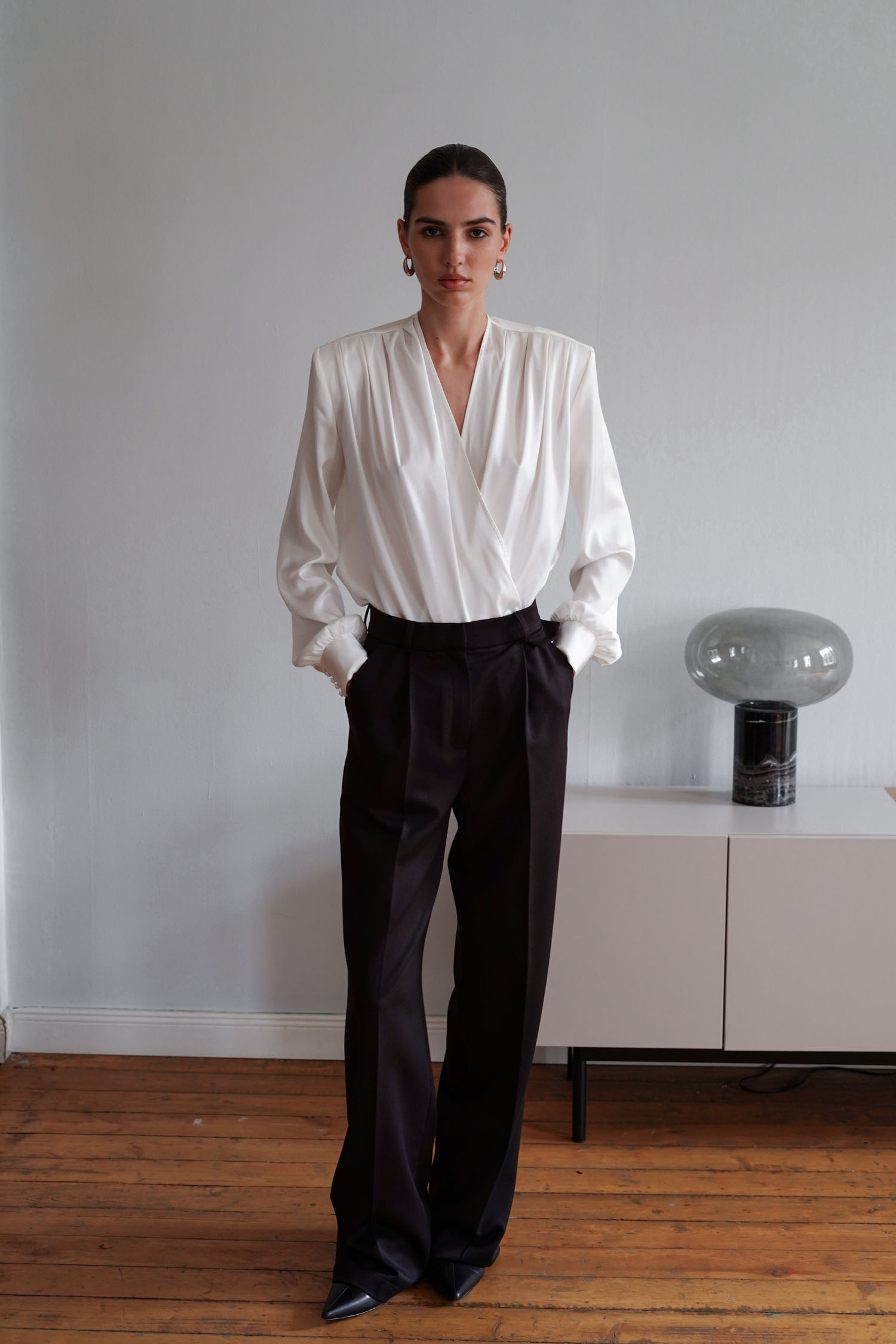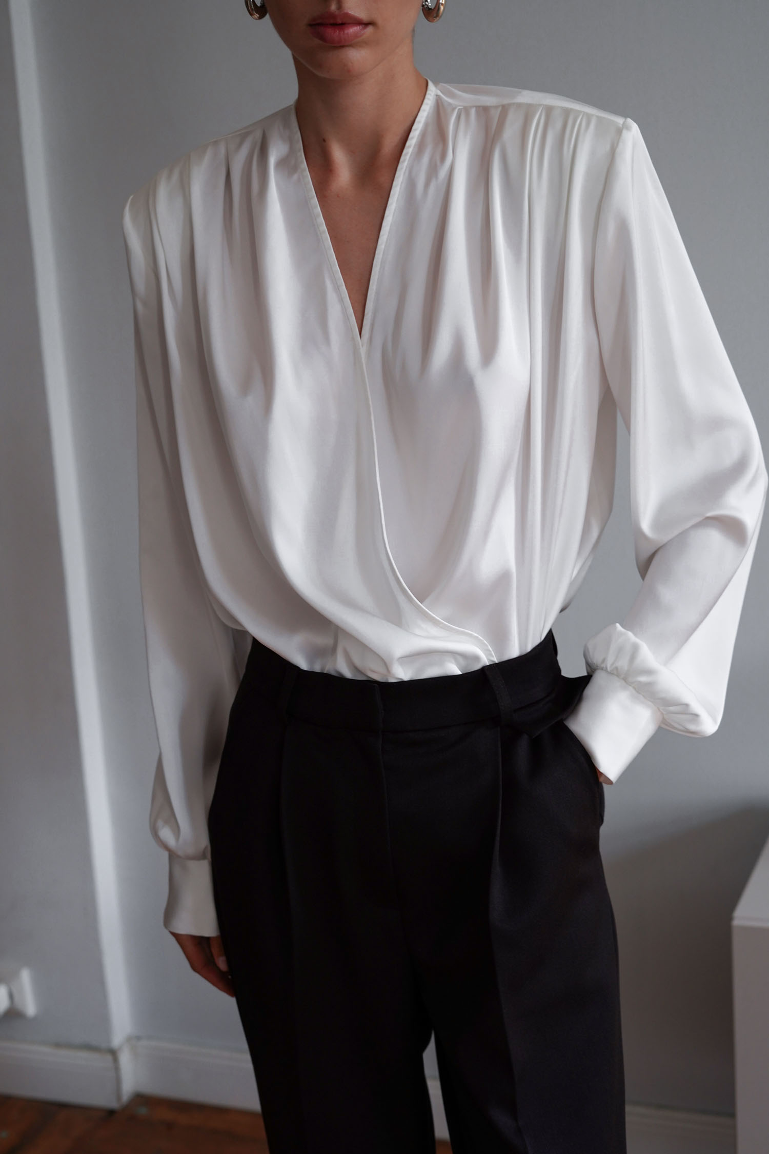 Крій передбачає об’ємні рукави на манжетах і складки в зоні плечей.