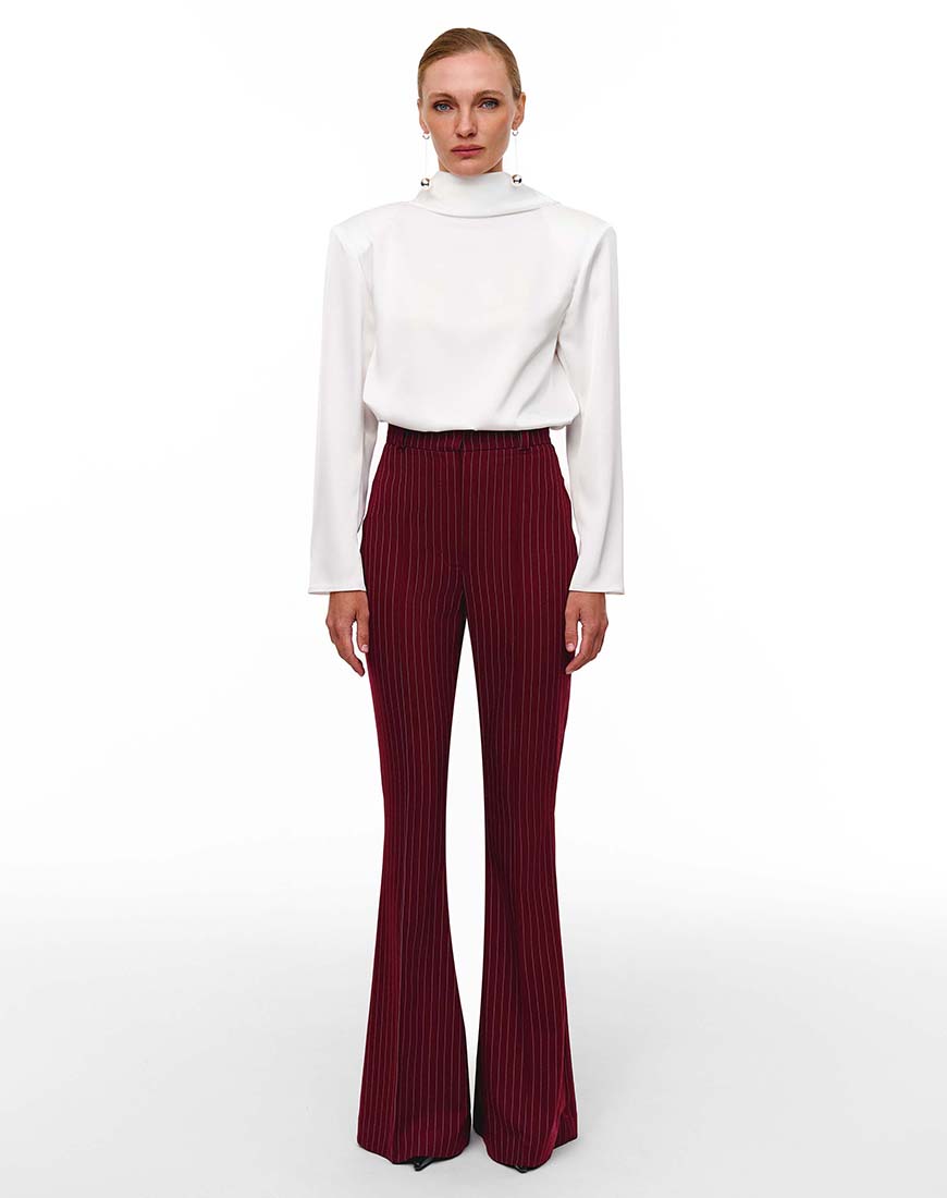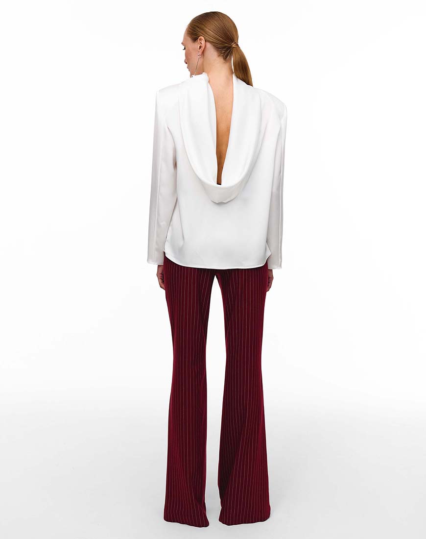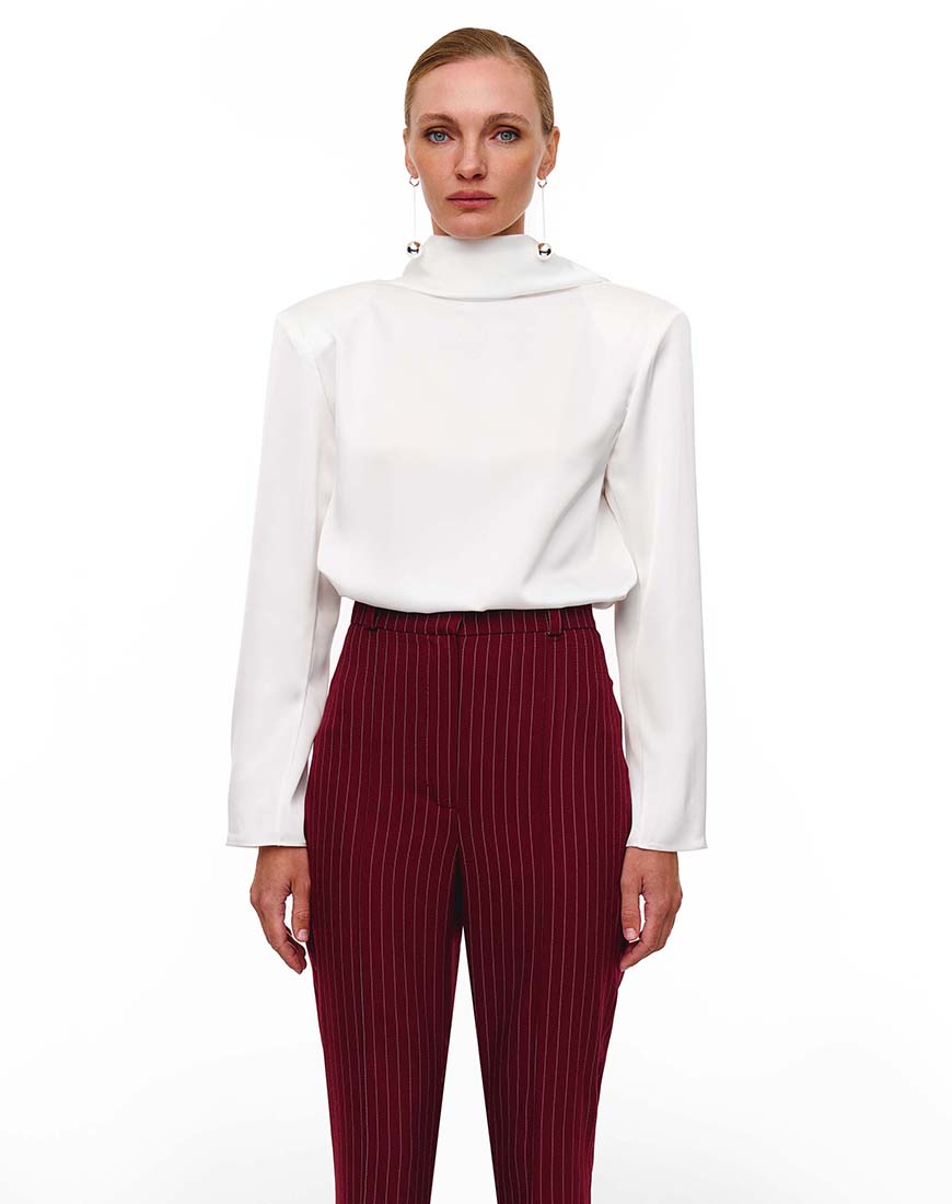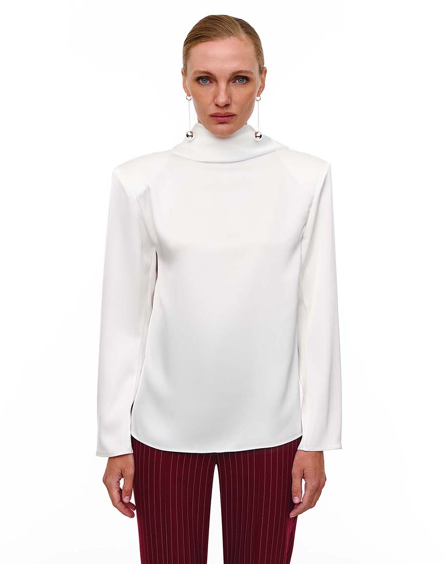 Блуза виконана із ніжного сатину, має блиск, який струмує по фігурі. Дизайн вирізняється графічною лінією плеча спереду та високим коміром. Позаду блуза має ефектний глибокий виріз. Продуманий крій гарантує бездоганну посадку, дозволяючи створити завершений образ.
