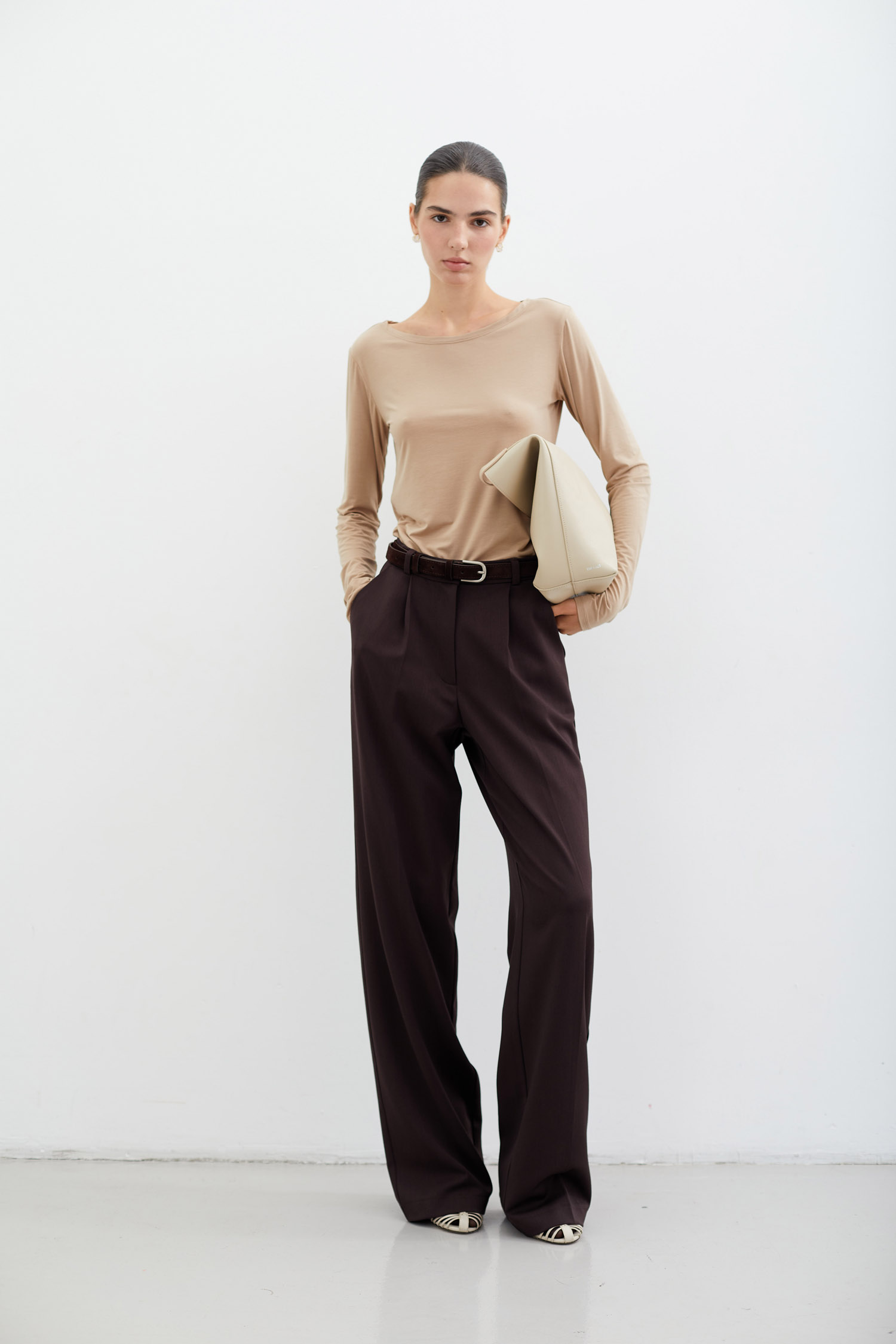 ДоставкаБрюки палаццо шоколадного кольору із завищеною талією. Скроєні в прямому силуеті зі щільної костюмної тканини, оснащені бічними кишенями. Сидять комфортно і формують охайний силует.