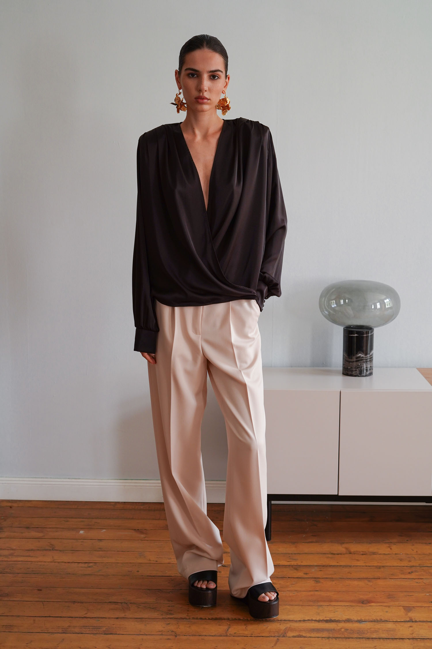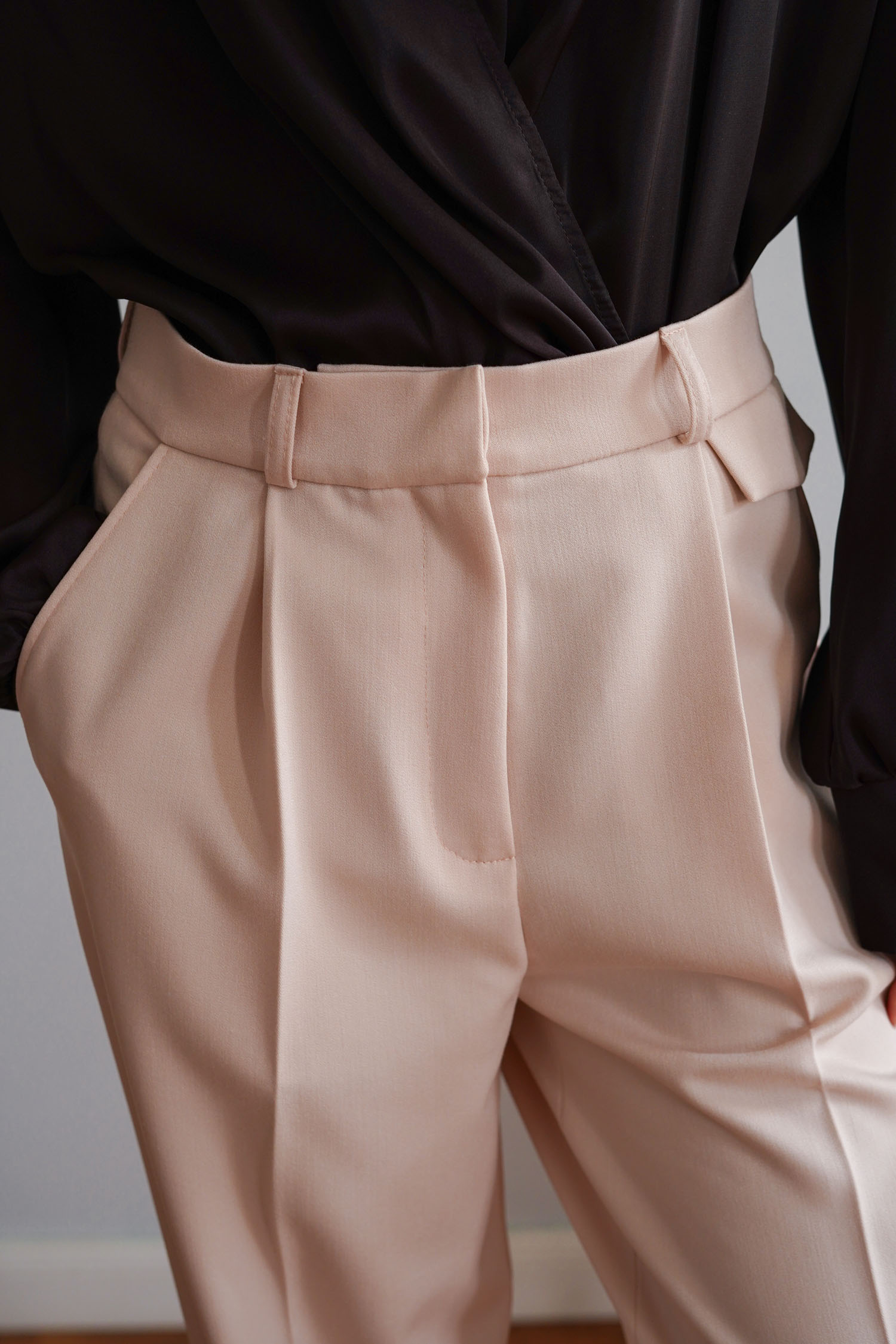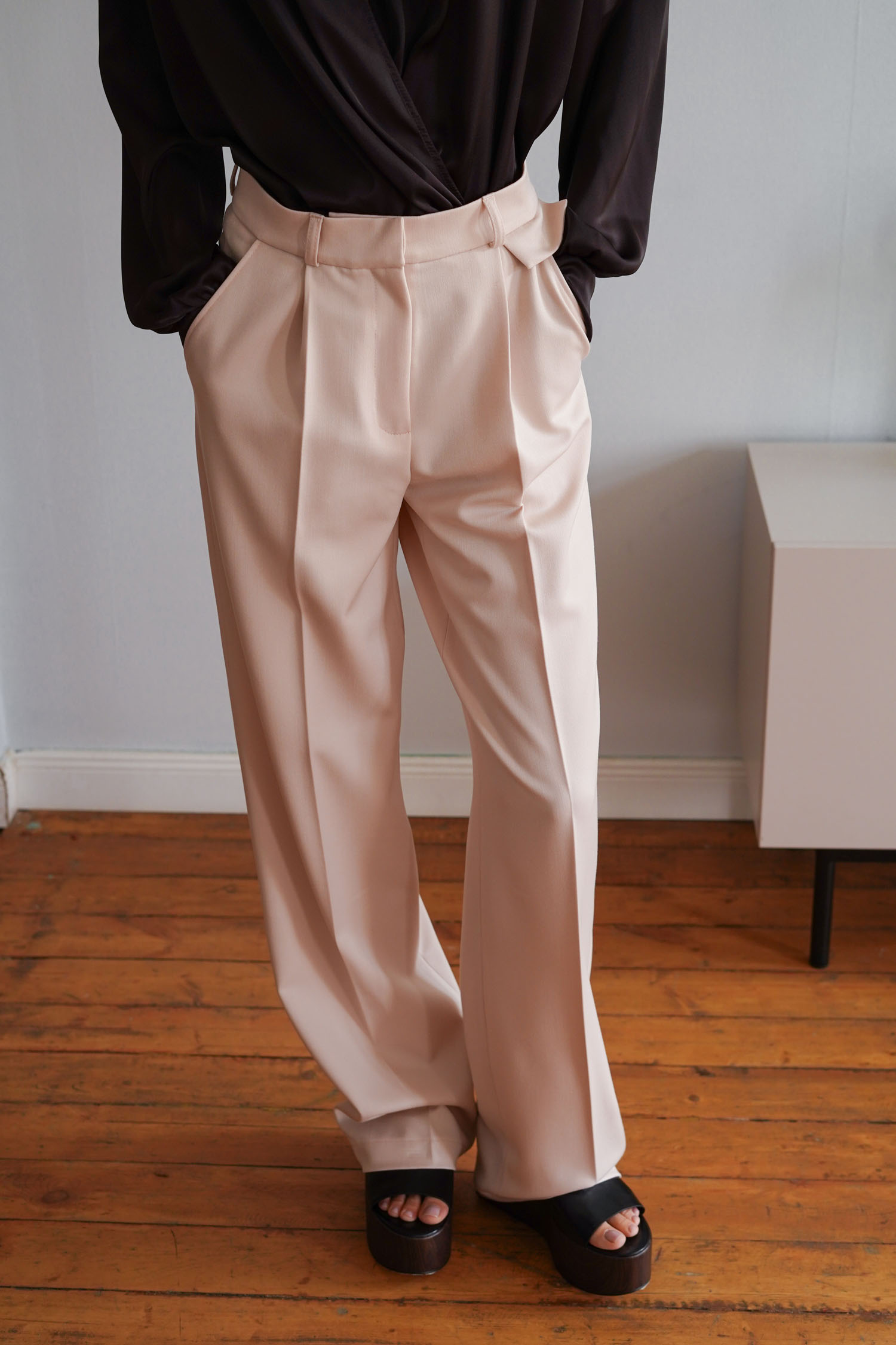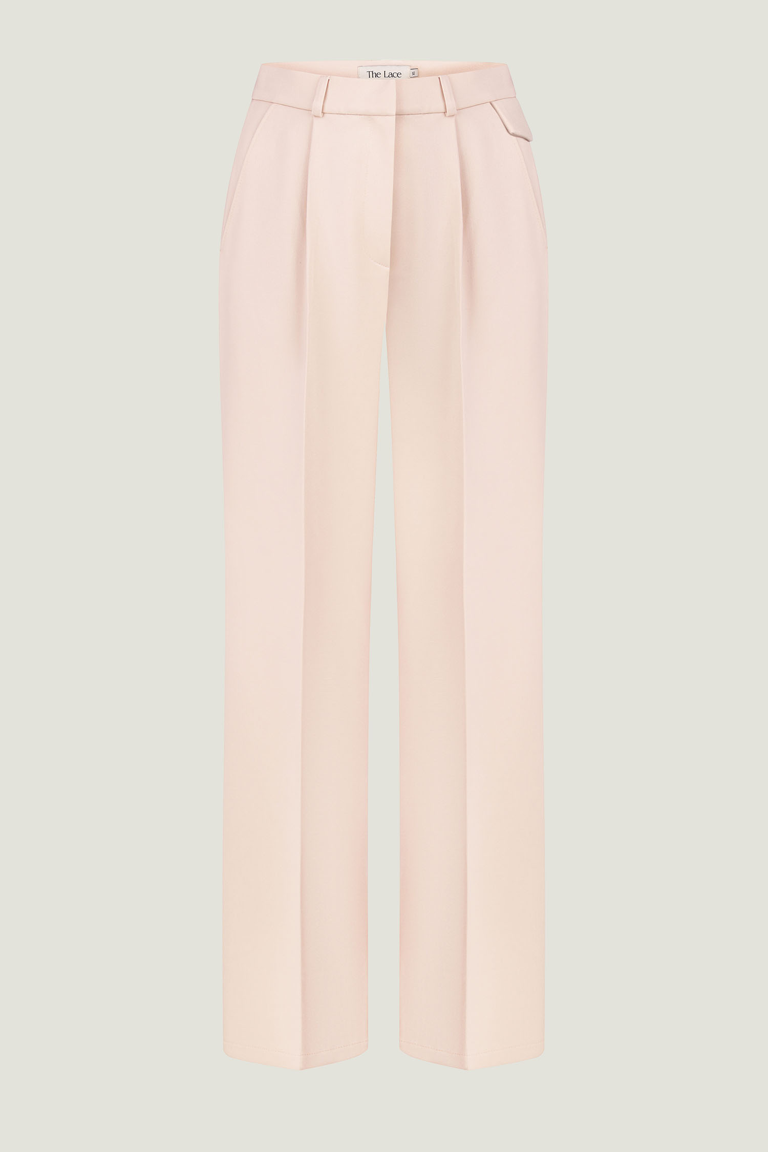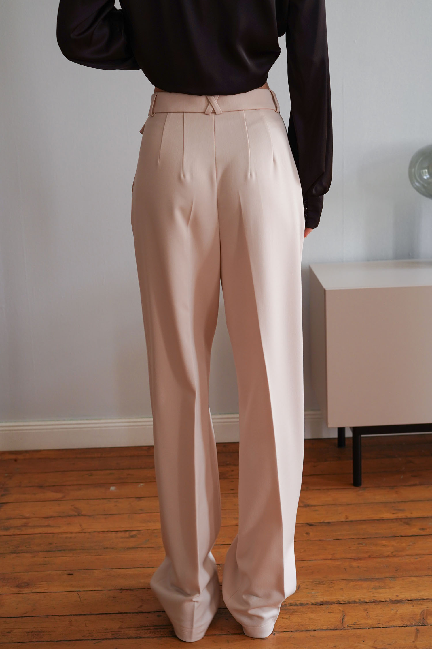 Кремові брюки палаццо з декоративним клапаном. Прямий крій і висока посадка візуально подовжують силует. Матеріал – щільна костюмна тканина, яка добре тримає форму. Клапан додає акценту біля талії, а крій гарантує рівну посадку.