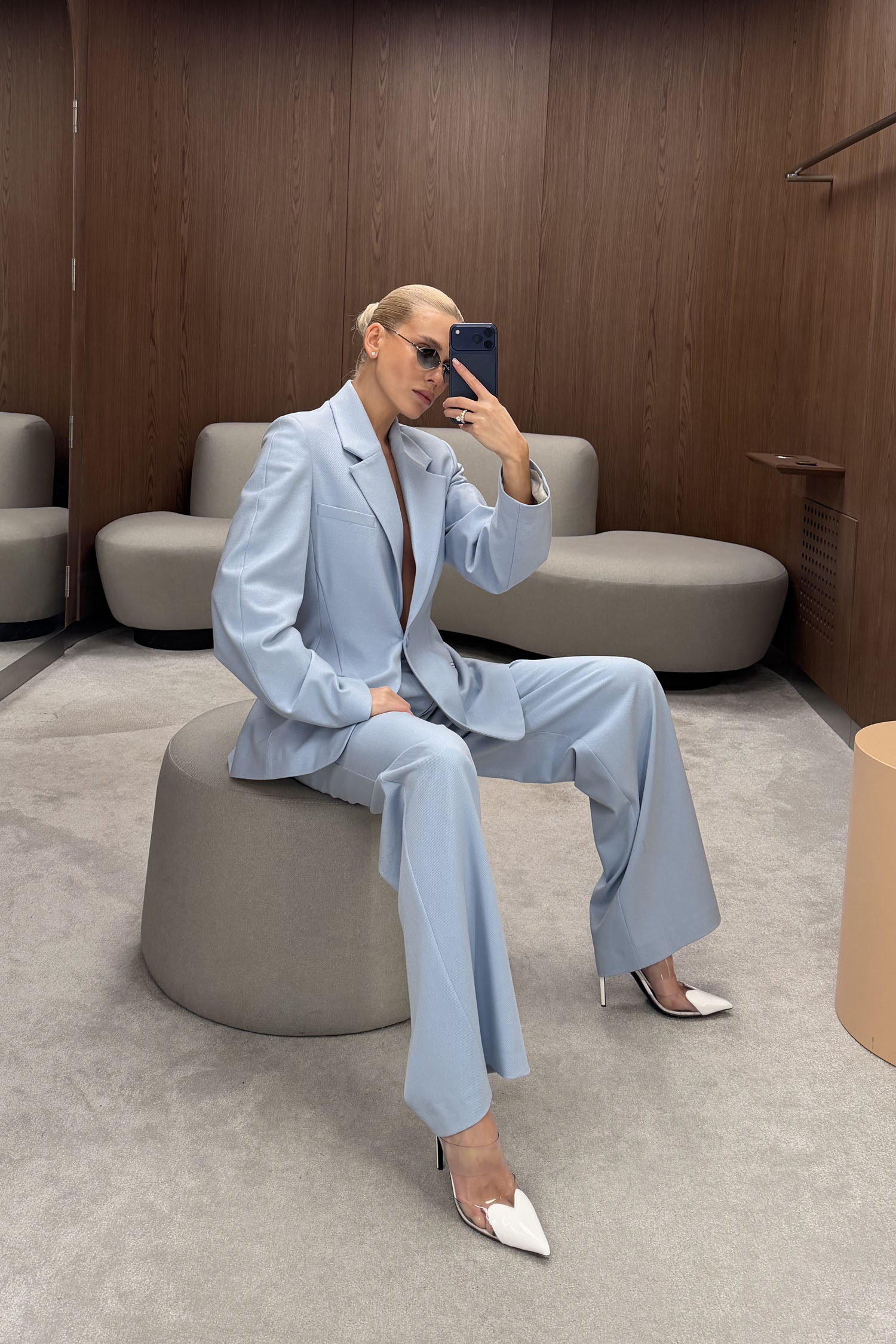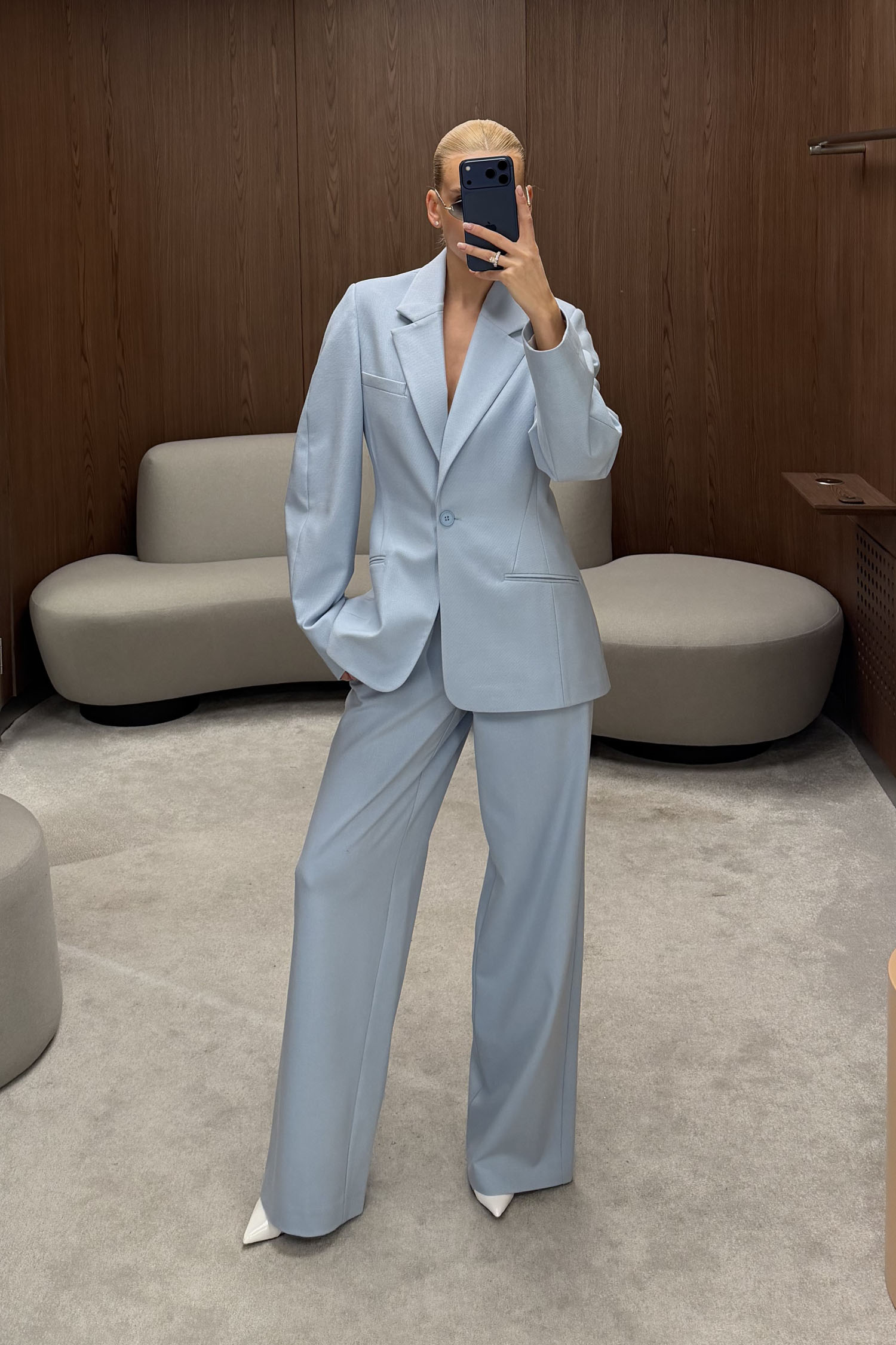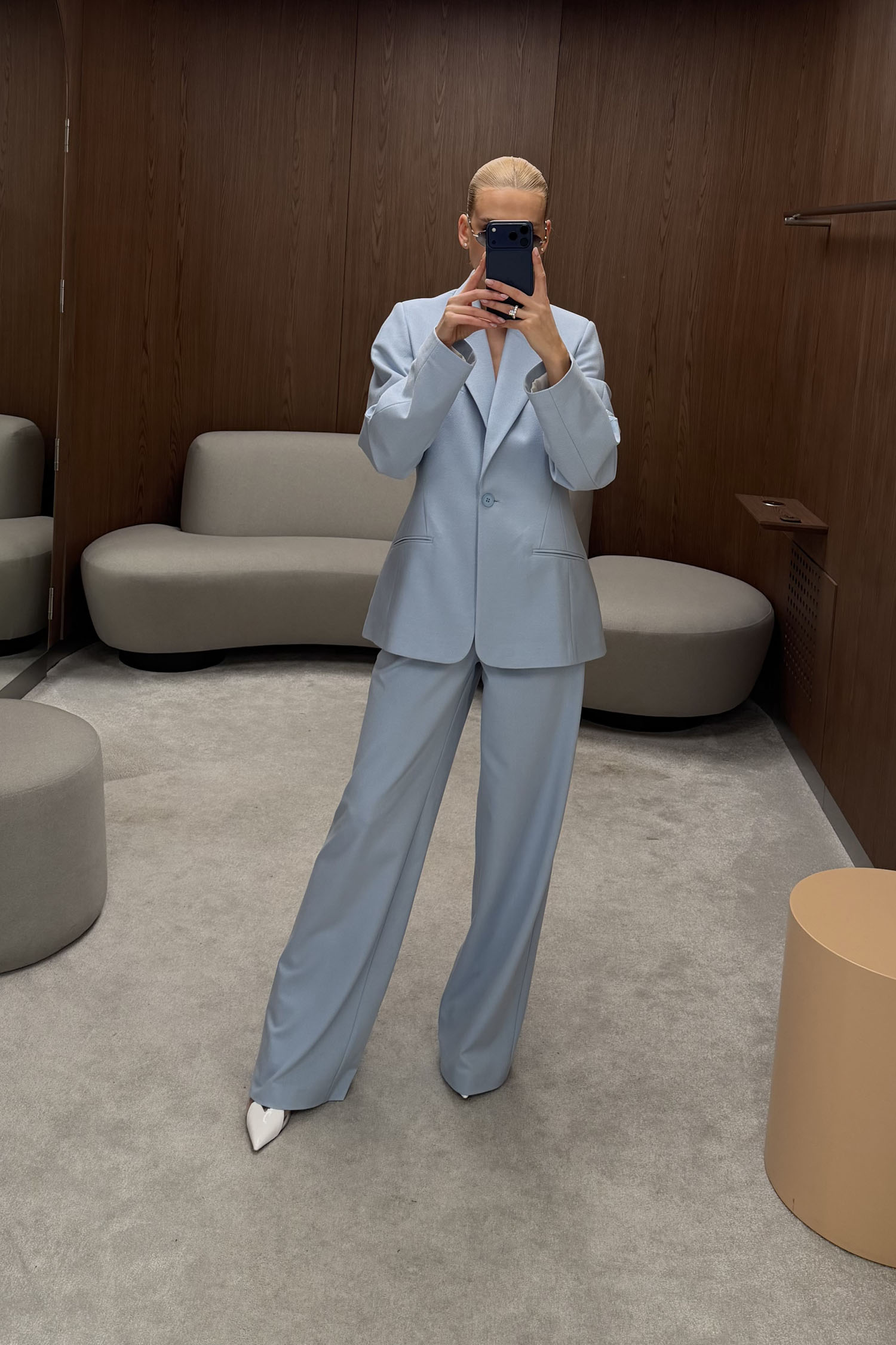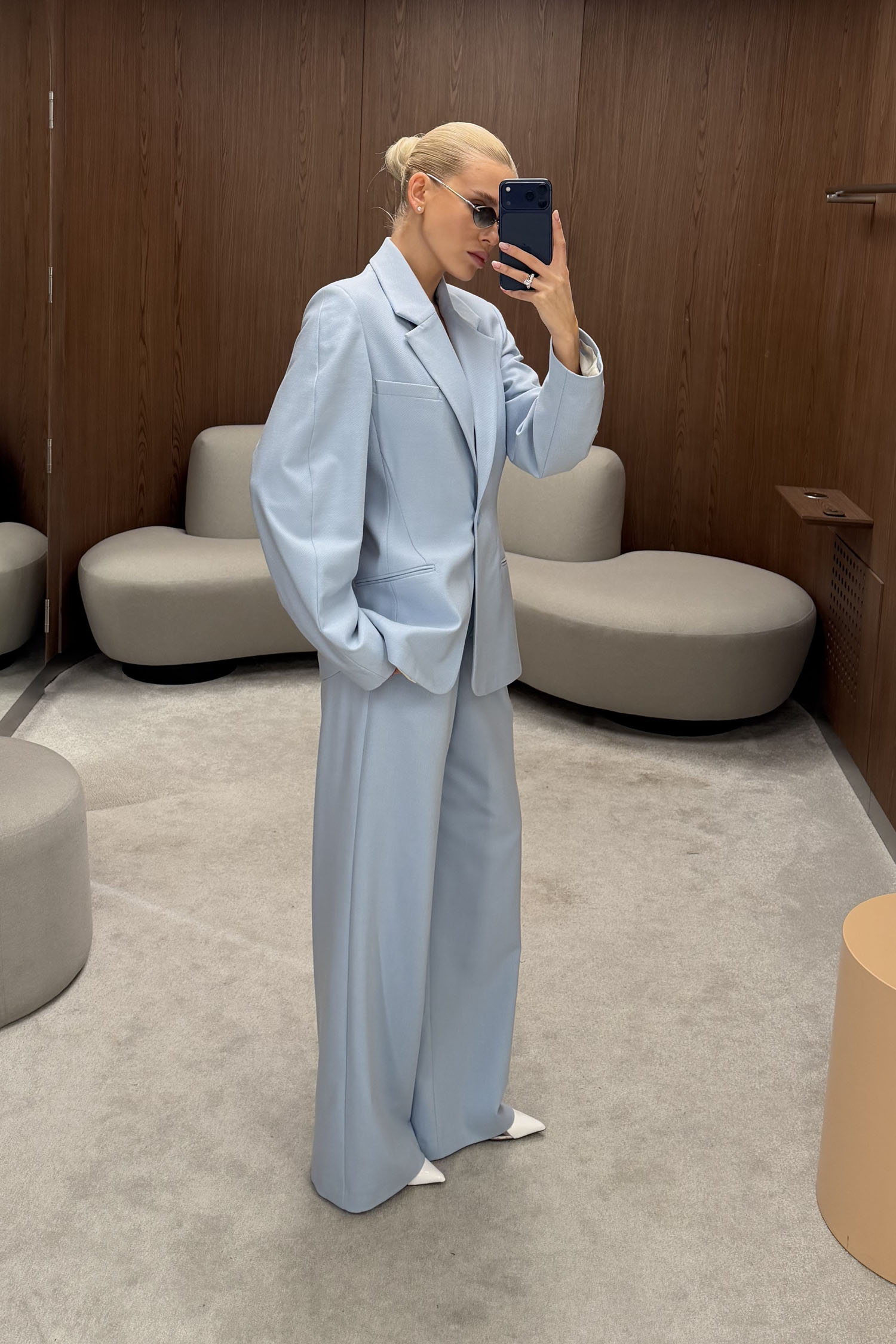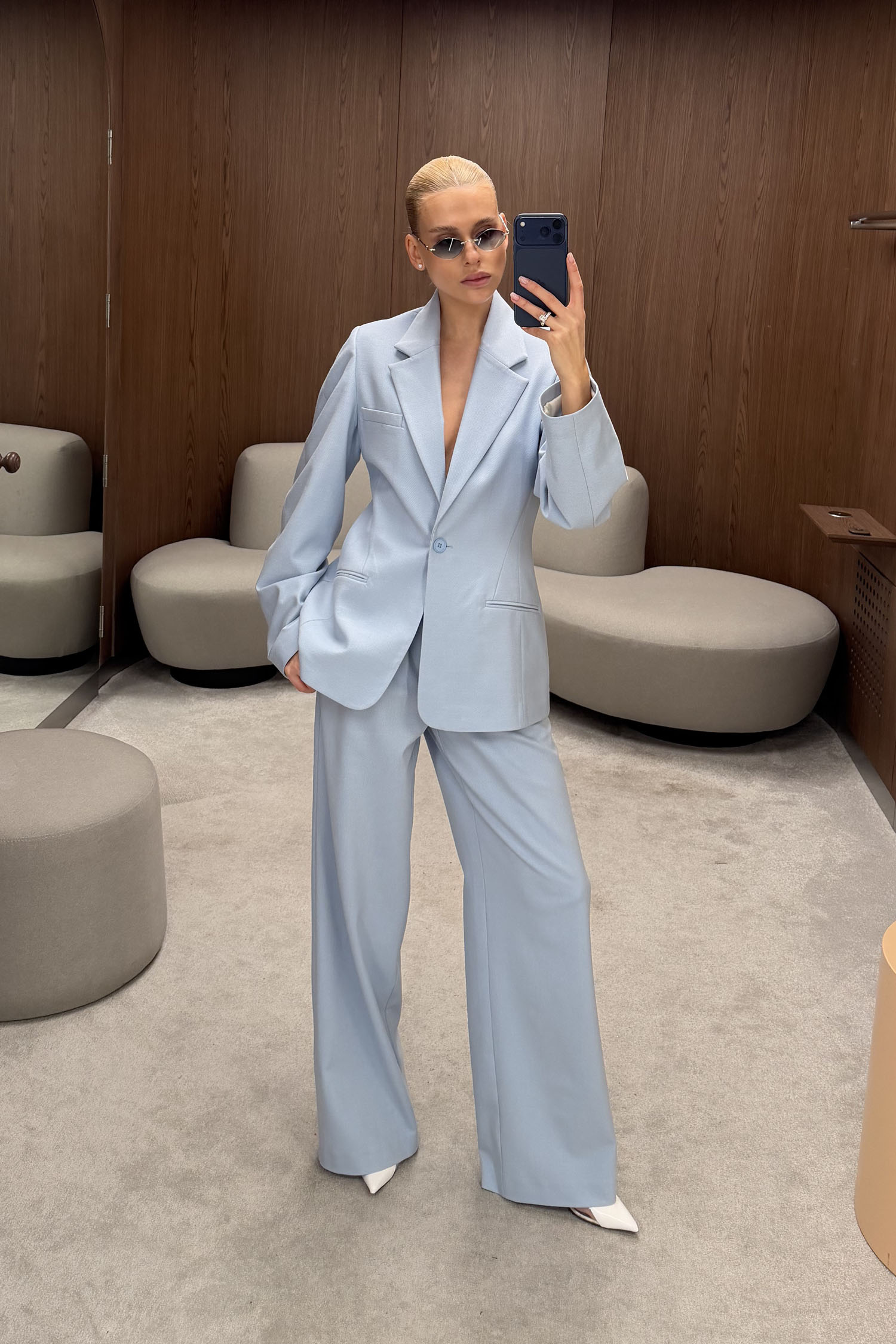ДоставкаБрюки прямого крою в ніжно-блакитному кольорі. Мають високу посадку і пошиті з цупкої костюмної тканини, яка добре тримає форму. Передбачені подвійні защипи та функціональні бічні кишені. Висока талія і щільна тканина забезпечують охайну посадку й акуратний силует. Рекомендується поєднувати з приталеним жакетом в тон.
