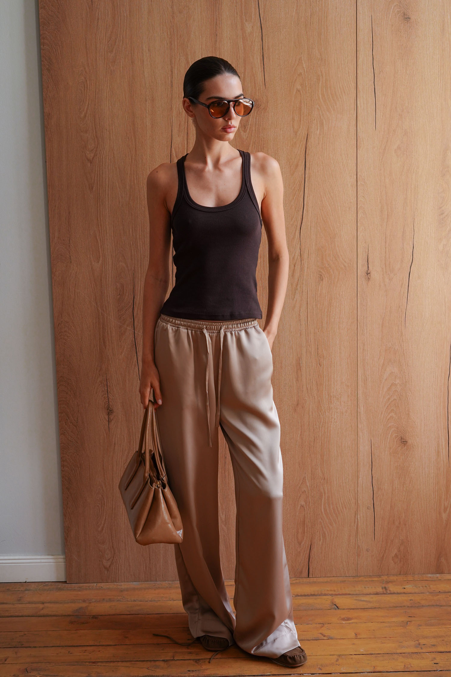 ДоставкаБежеві брюки з сатину у вільному крої.