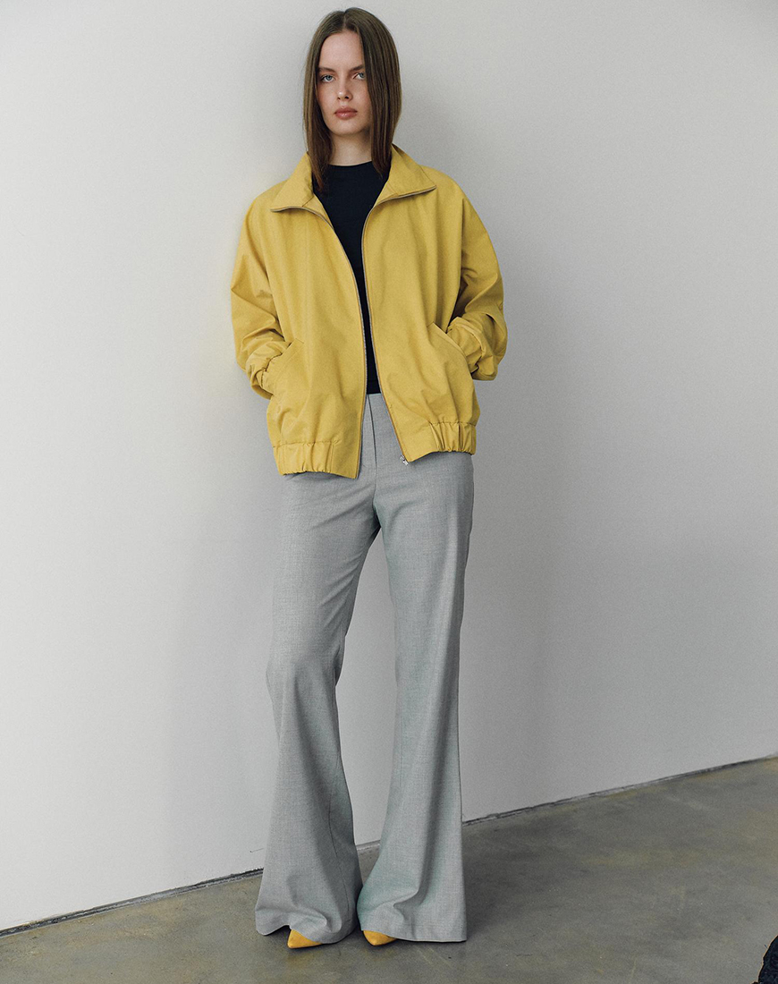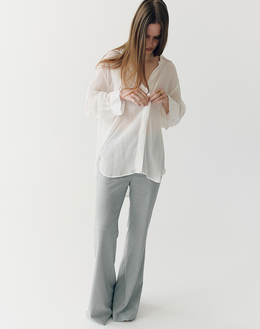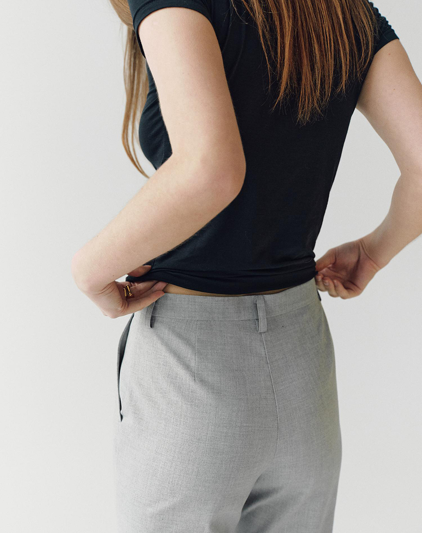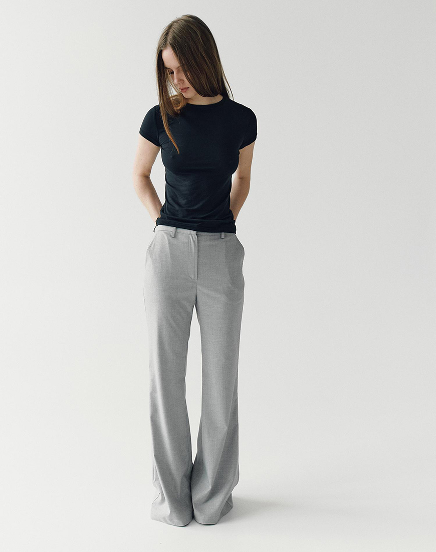 Доставка впродовж 3-5 робочих днівБрюки кльош високої посадки сірого кольору з боковими кишенями поясом та застібкою на блискавці без підкладки.