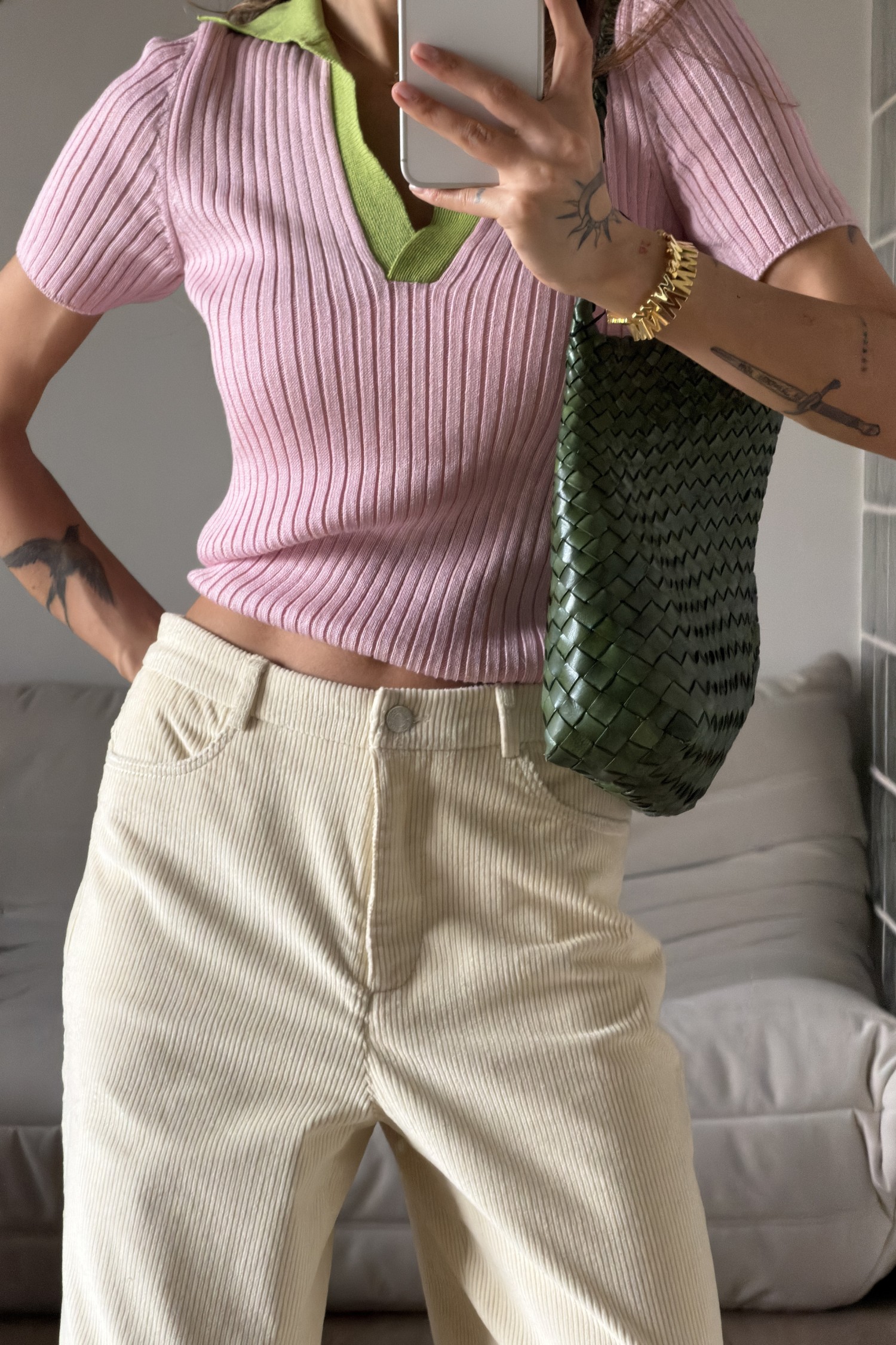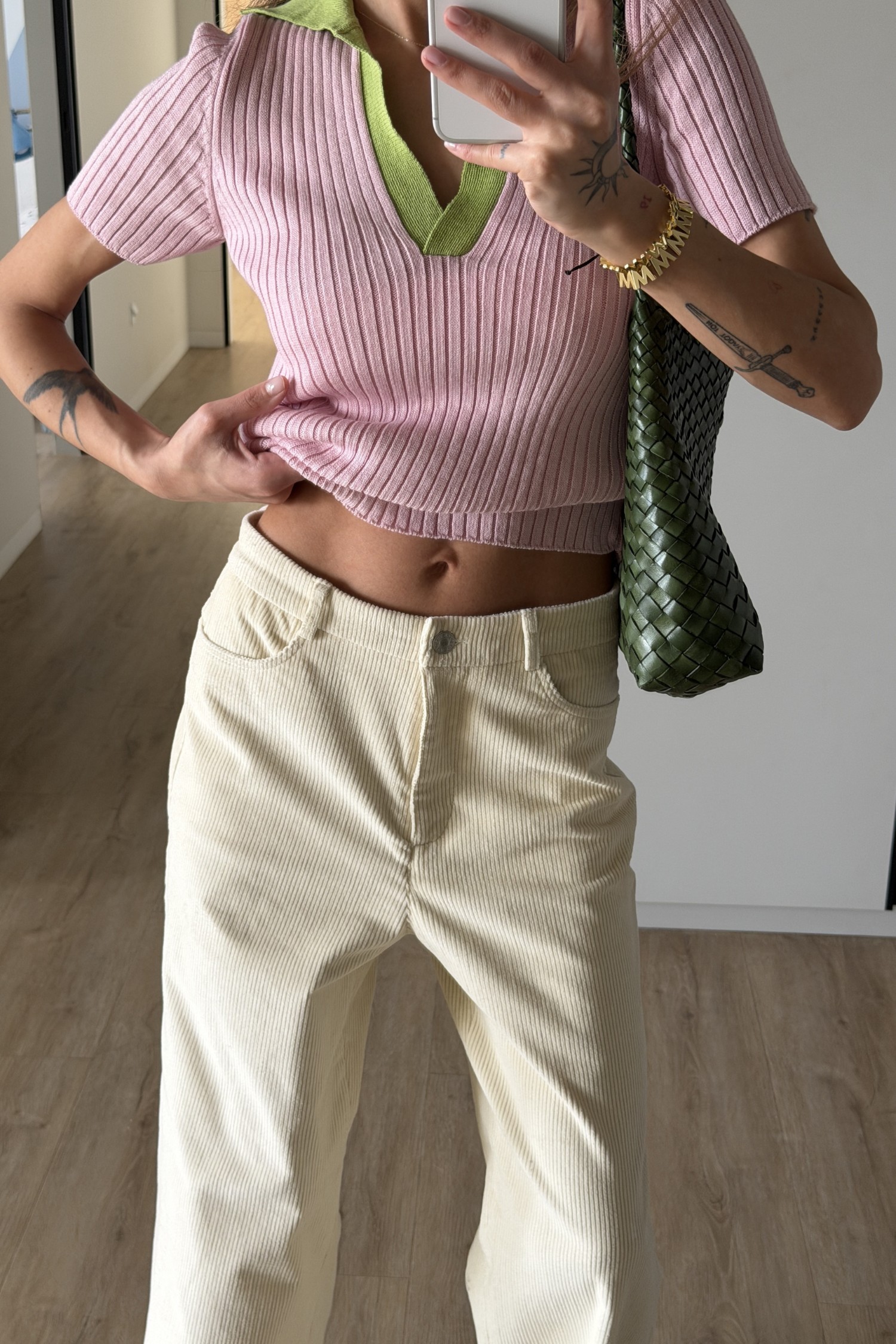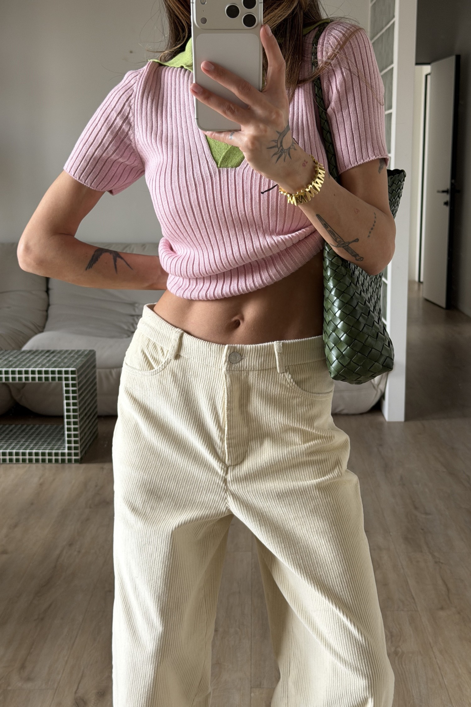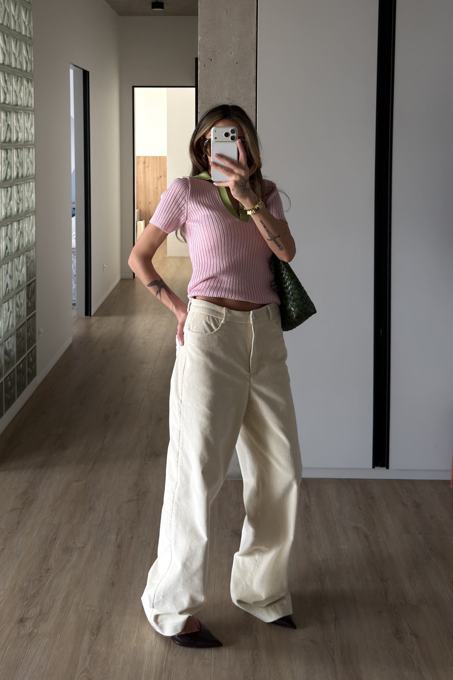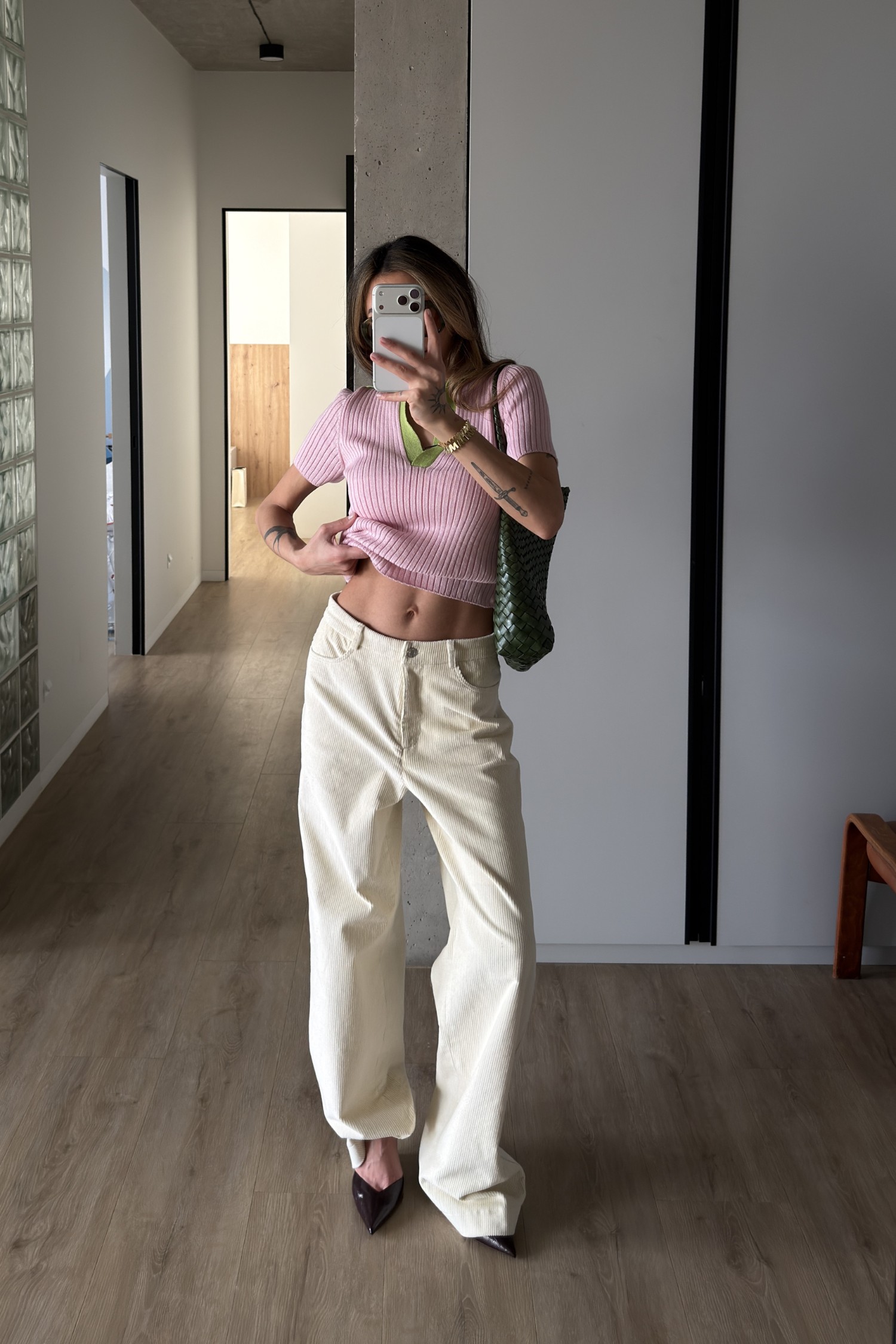 Вільний силует і висока талія забезпечують зручну посадку. Фактура вельвету додає образу глибини та виразності навесні.