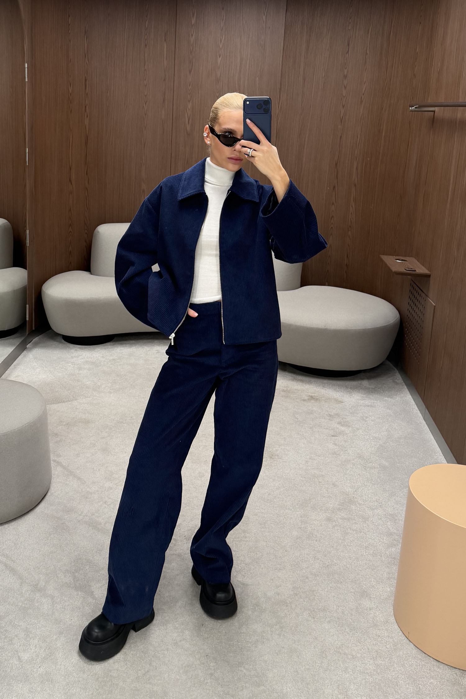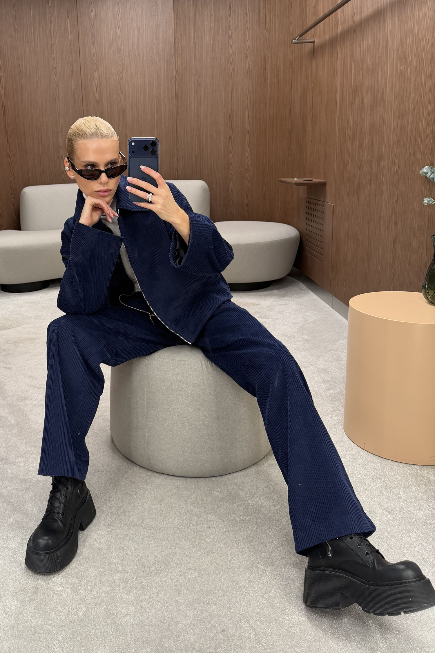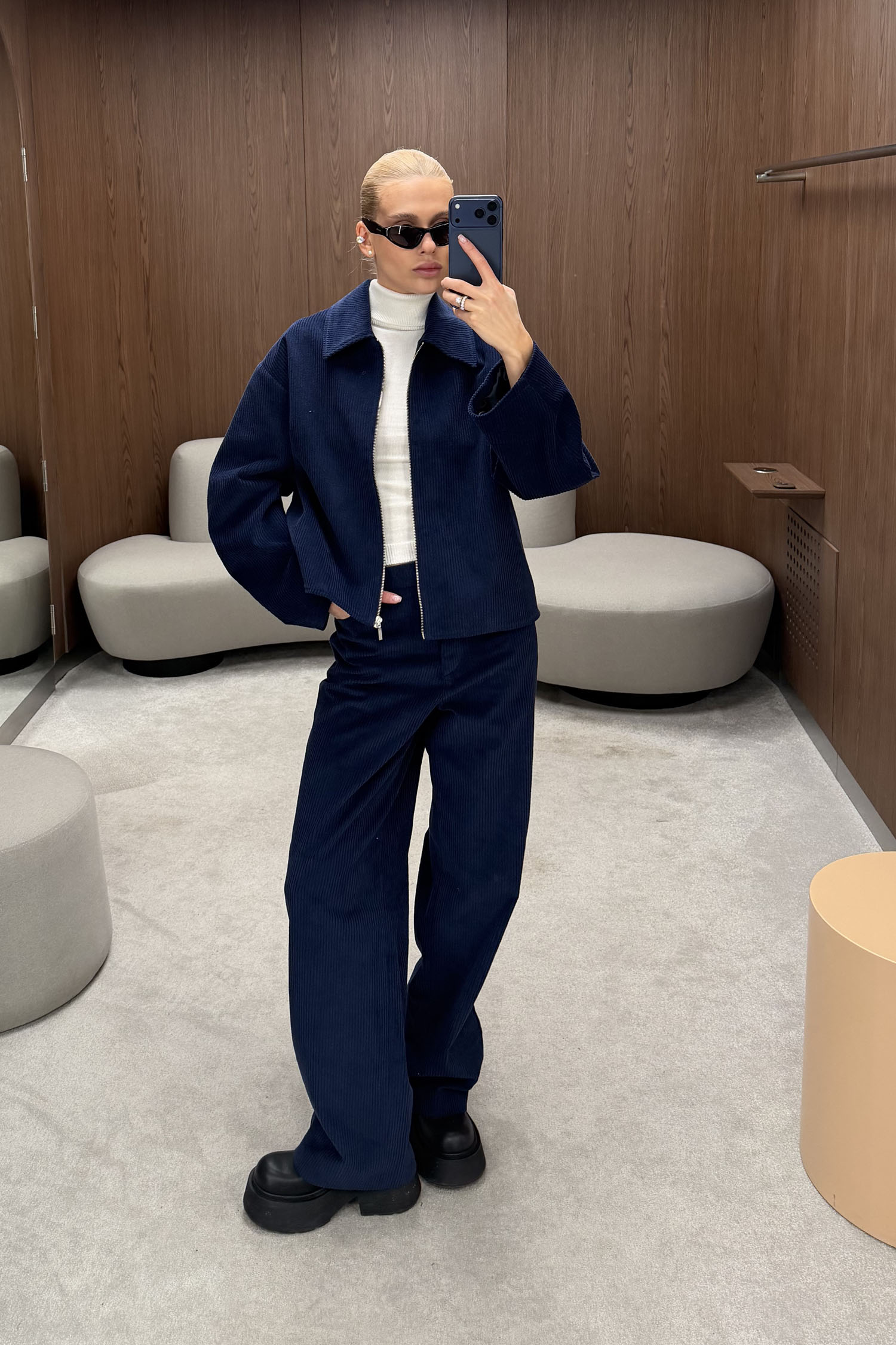ДоставкаЖіночі брюки navy blue, виконані з текстурного вельвету. Вільний крій та висока посадка. Є функціональні бічні й задні кишені. Вельветова фактура підсилює глибину та насиченість кольору в весняних образах. Стилісти радять поєднувати брюки з бомбером в тон для створення монохромного луку.