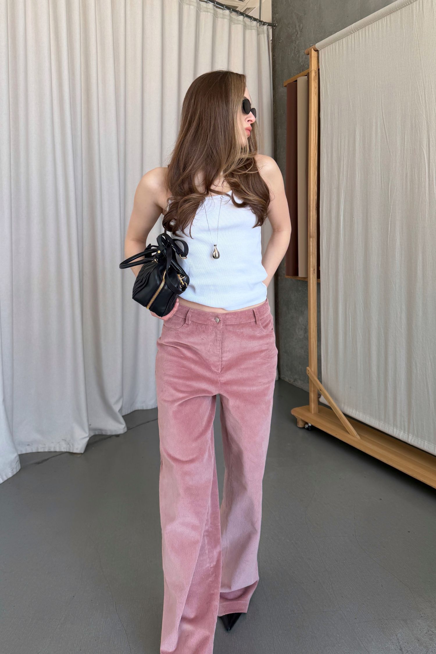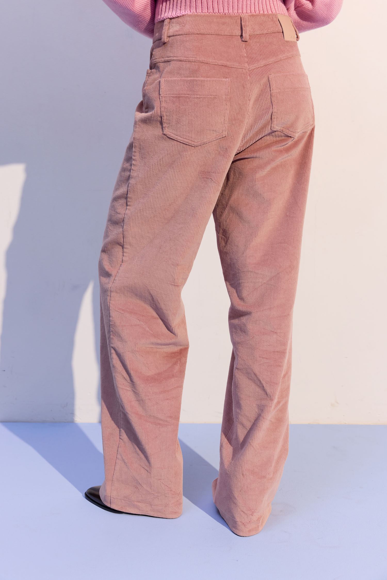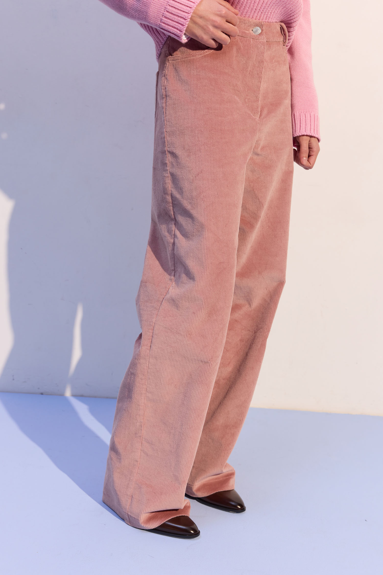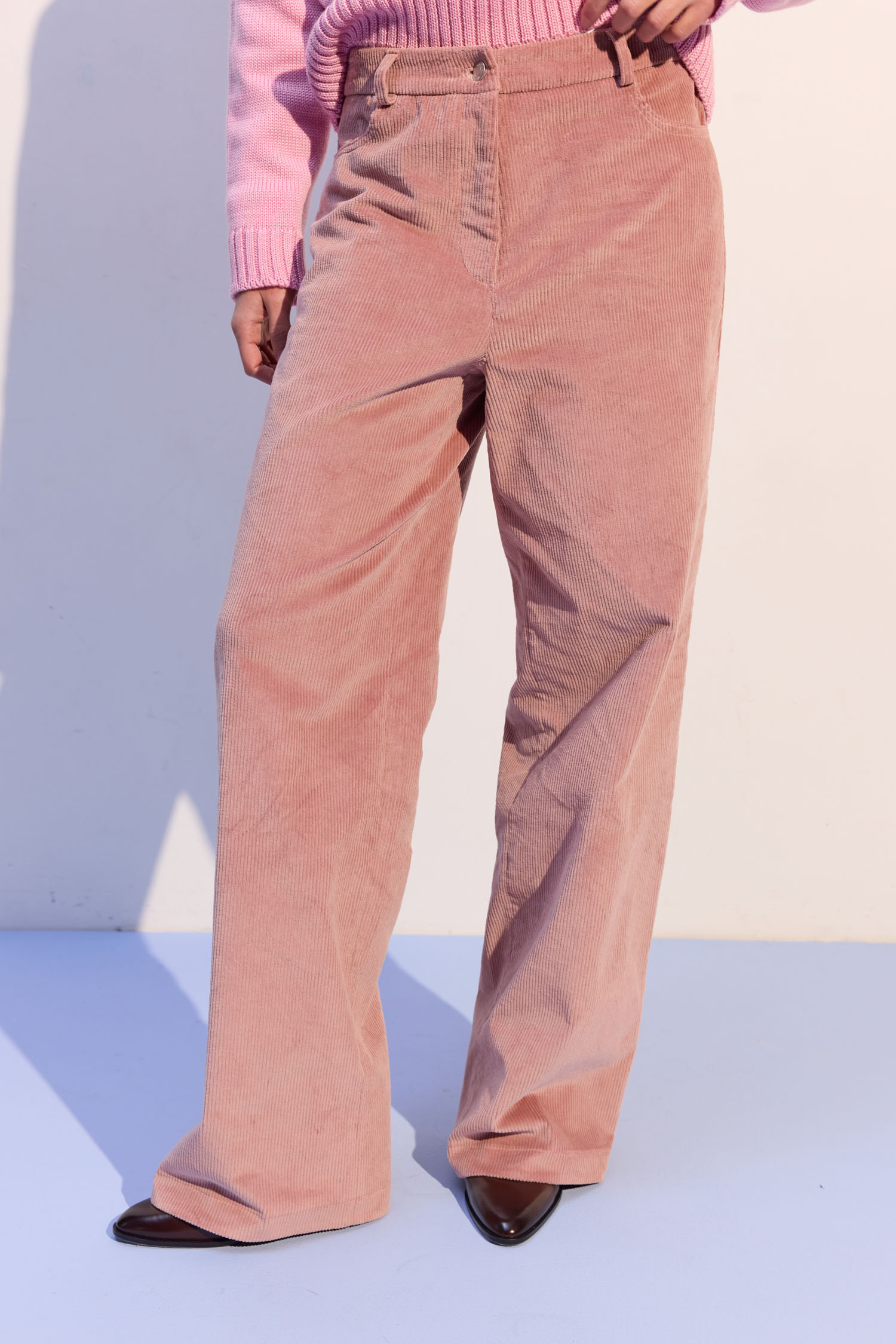 Брюки з вельвету рожевого відтінку з вільним кроєм. Підходять і для денних, і для вечірніх образів. М’яка текстура вельвету надає глибині та фактурності. Висока талія формує чіткий силует. Рекомендуємо поєднувати з жакетом, затишним трикотажем або сорочкою.