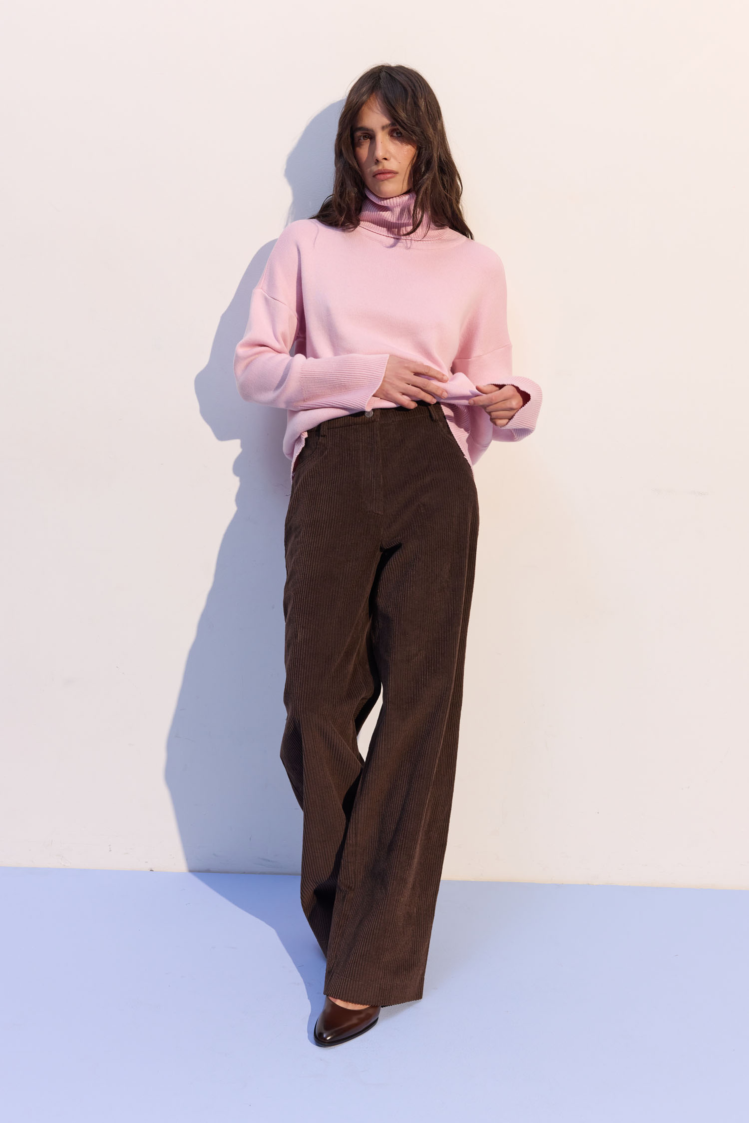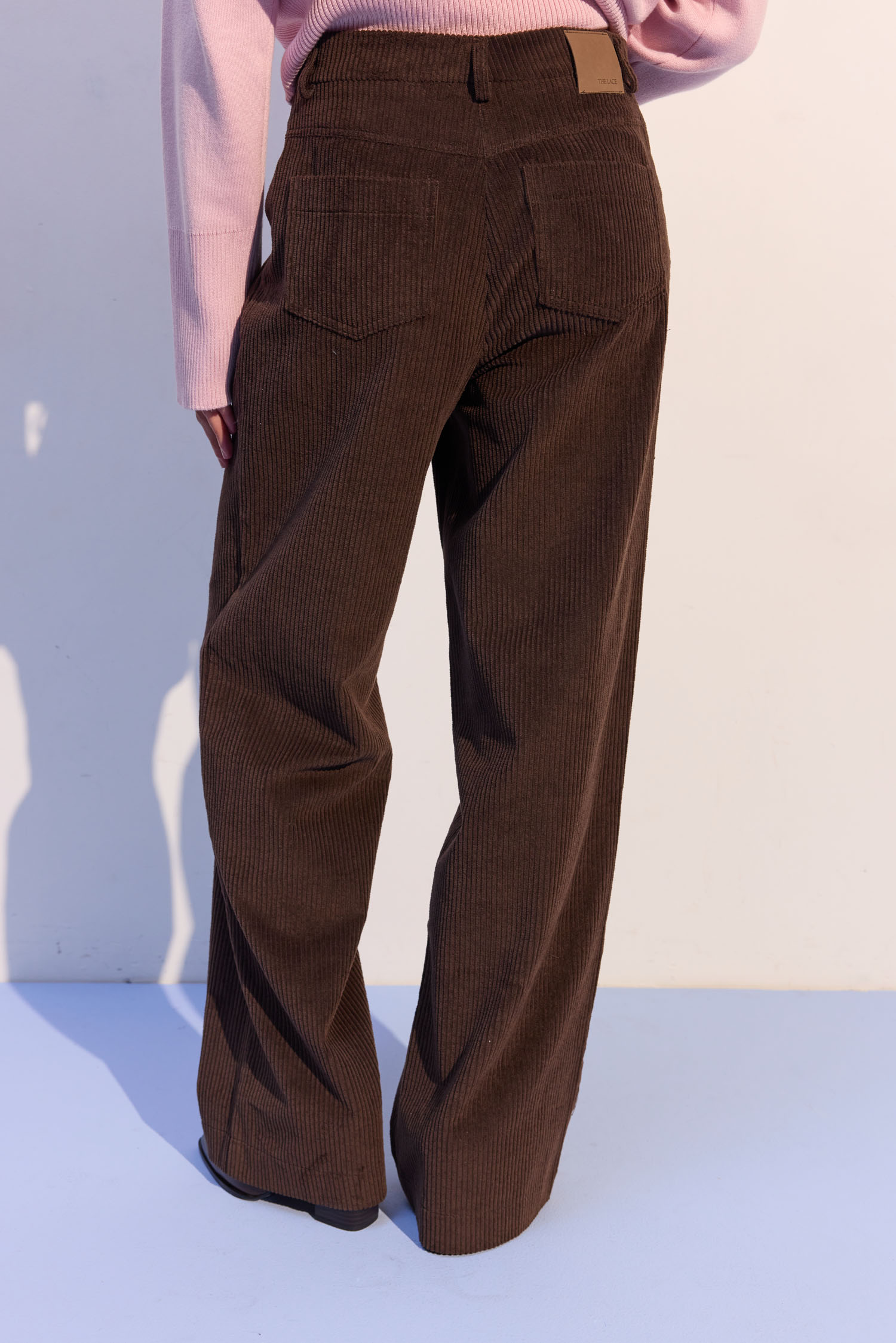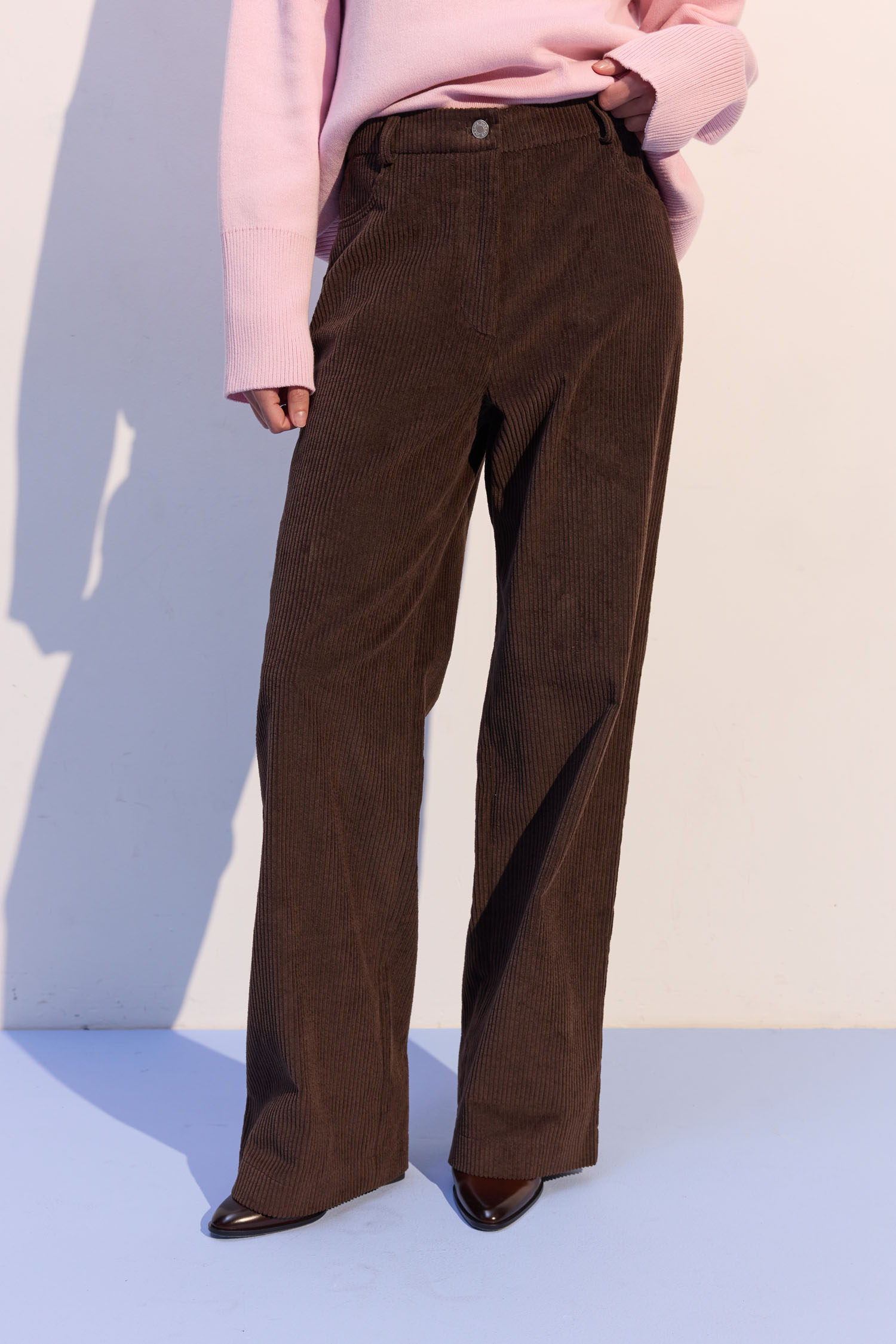 Брюки насиченого шоколадного відтінку з текстурного вельвету, вільного силуету та високою талією. Оснащені бічними й задніми кишенями для практичного використання. Вільний крій забезпечує комфортну посадку. Текстурний вельвет додає фактурності й глибини зимовим образам.