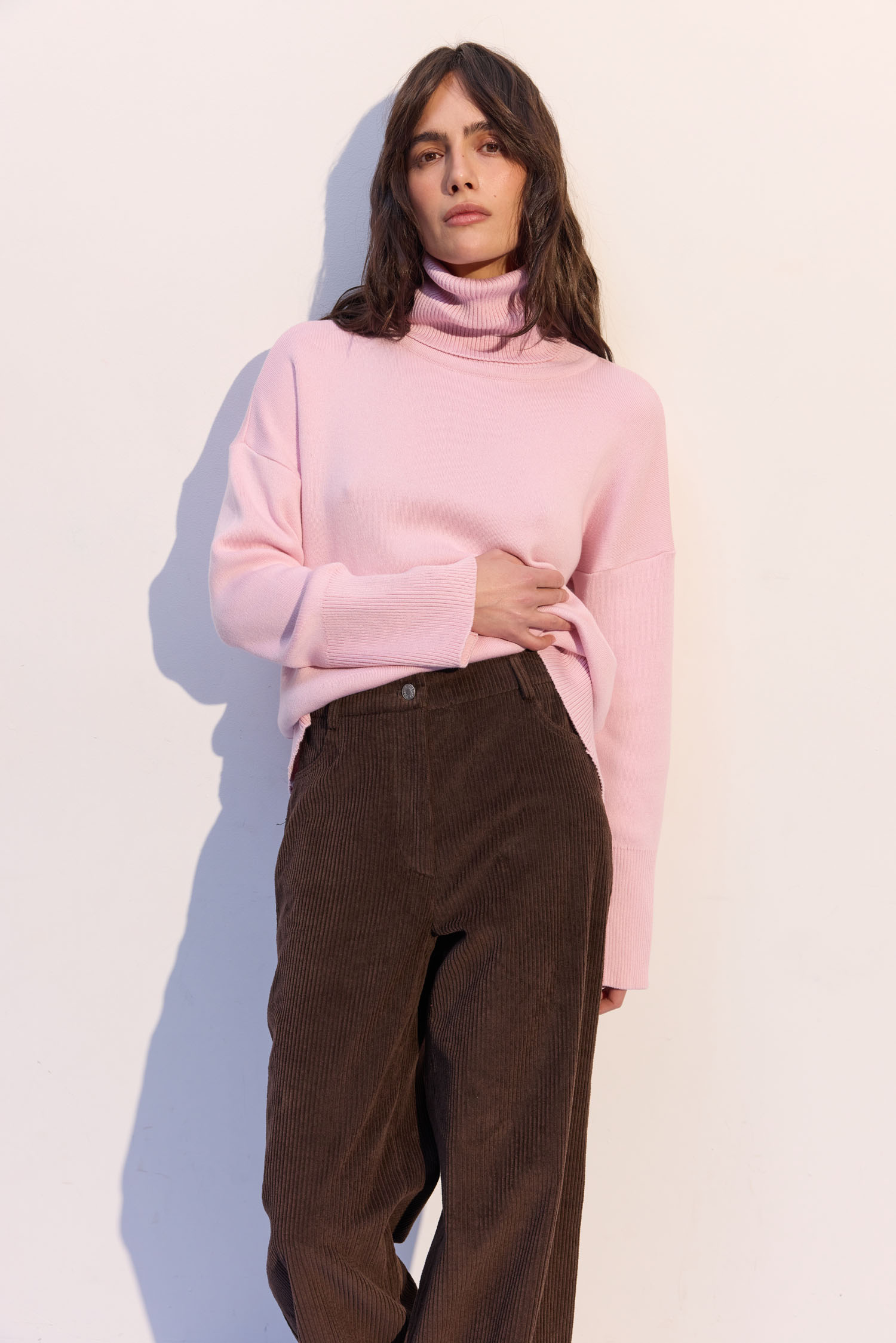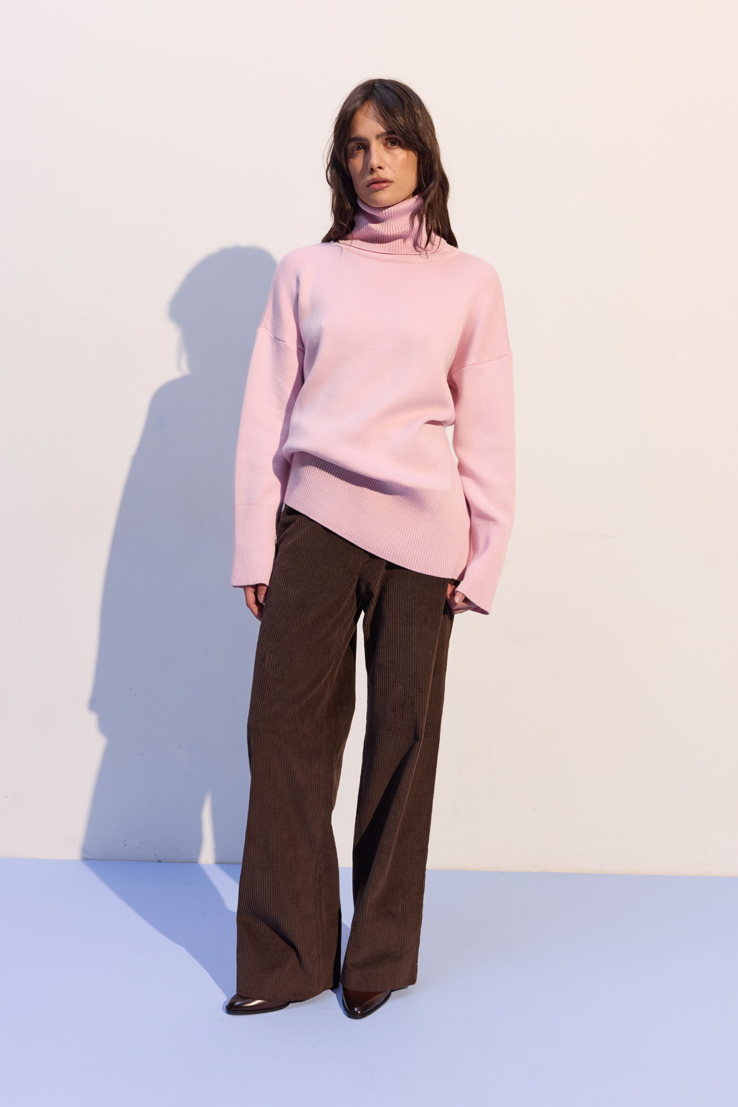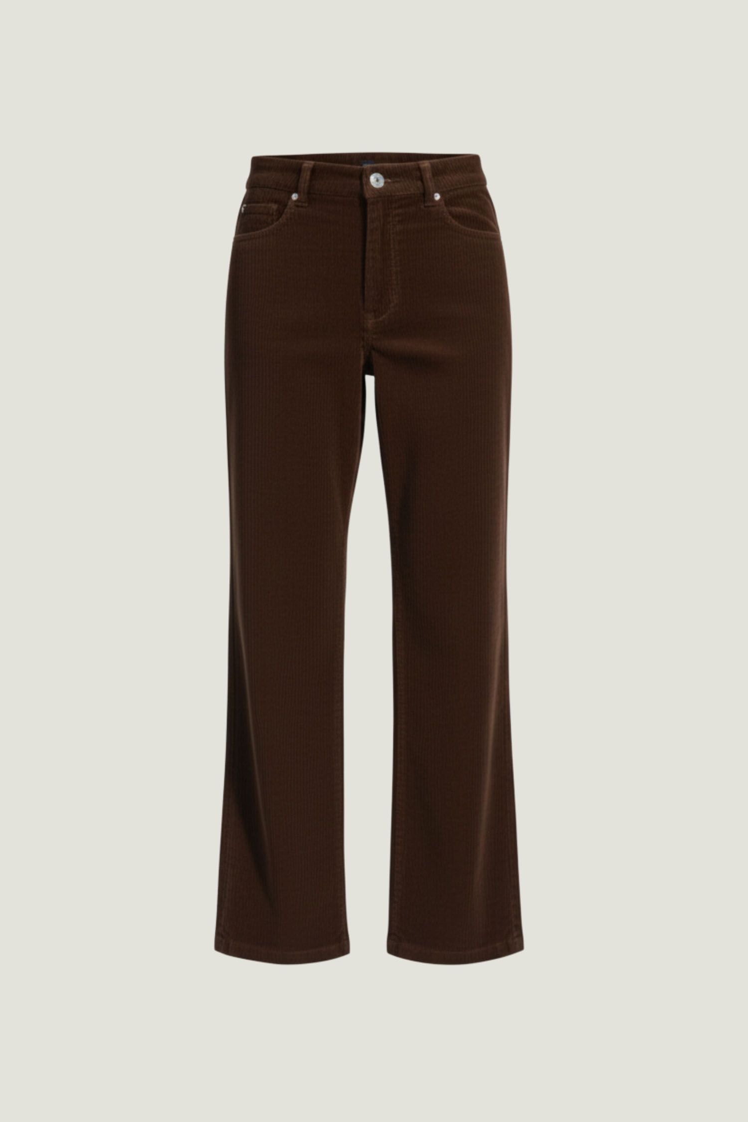 Брюки насиченого шоколадного відтінку з текстурного вельвету, вільного силуету та високою талією. Оснащені бічними й задніми кишенями для практичного використання. Вільний крій забезпечує комфортну посадку. Текстурний вельвет додає фактурності й глибини зимовим образам.