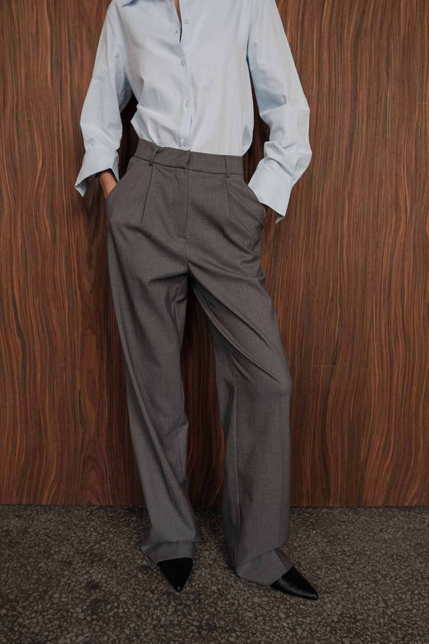 ДоставкаЖіночі брюки-палаццо темно-сірого кольору, виконані з цупкої костюмної тканини з додаванням вовни. Мають класичний крій із високою посадкою, защипами та функціональними бічними кишенями. Щільна тканина тримає форму, а високий пояс забезпечує акуратну посадку. Брюки-палаццо – базова річ для осінньо-зимових образів.