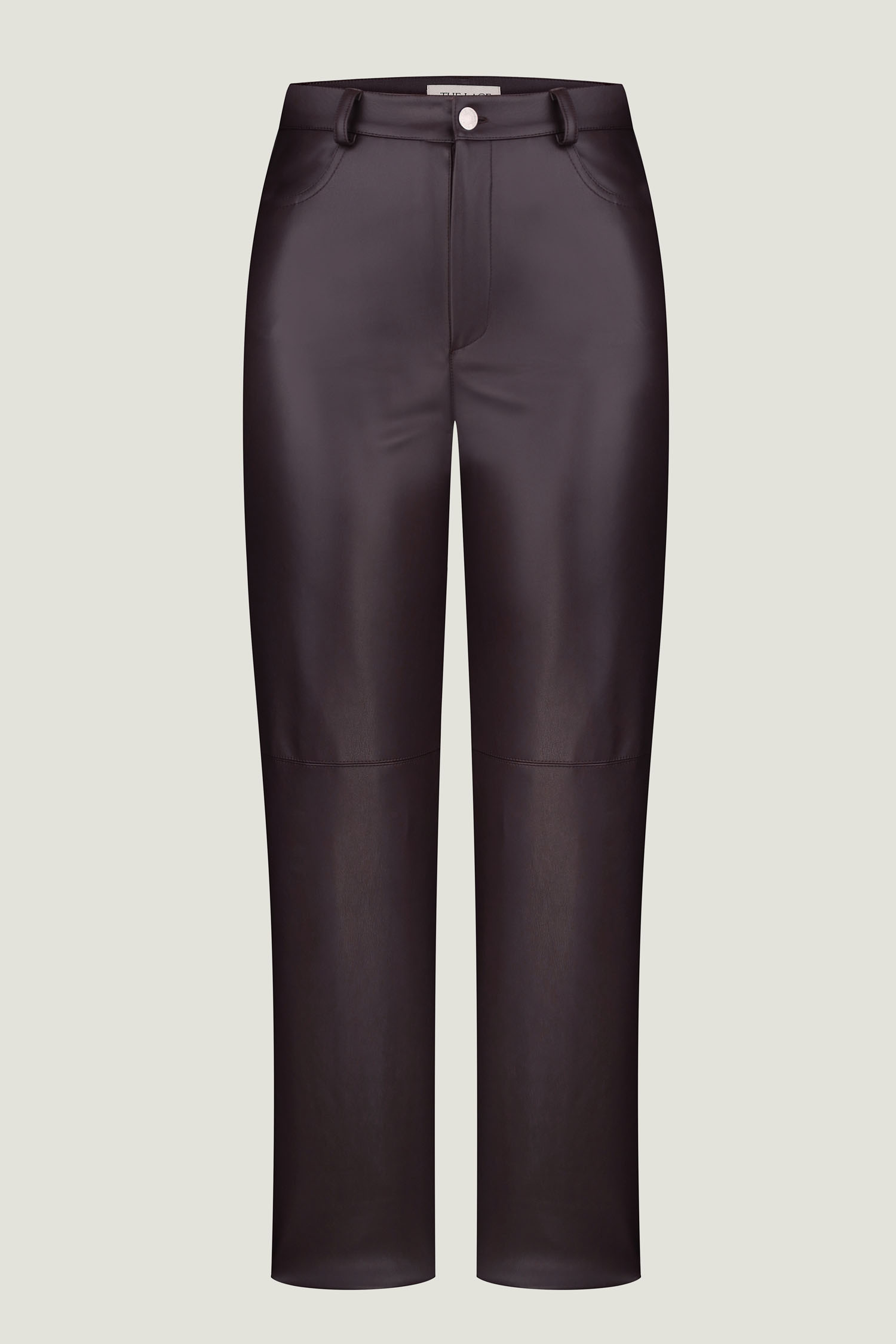 ДоставкаБрюки з екошкіри насиченого шоколадного відтінку. Прямий крій і середня посадка. Призначені для осінньо-зимового сезону. Оснащені бічними та задніми кишенями. Добре поєднуються з м’яким трикотажем, теплою вовною, сорочками й топами.