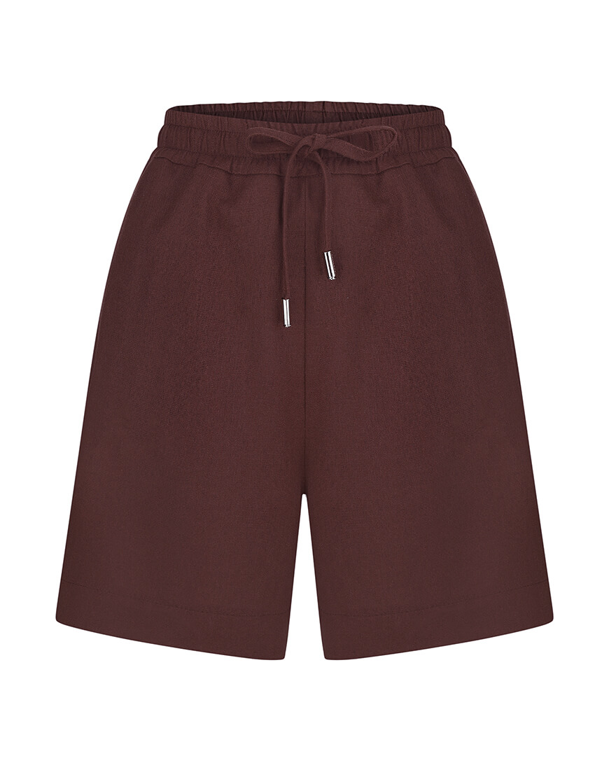 Шорти вільного силуету з льону. Комфортний регульований пояс на резинці та кулісці, прикрашеній брендованою фурнітурою. Внизу – декоративні розрізи.