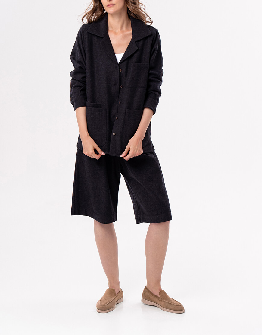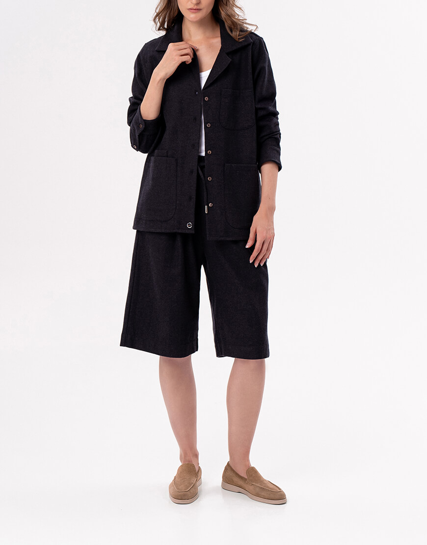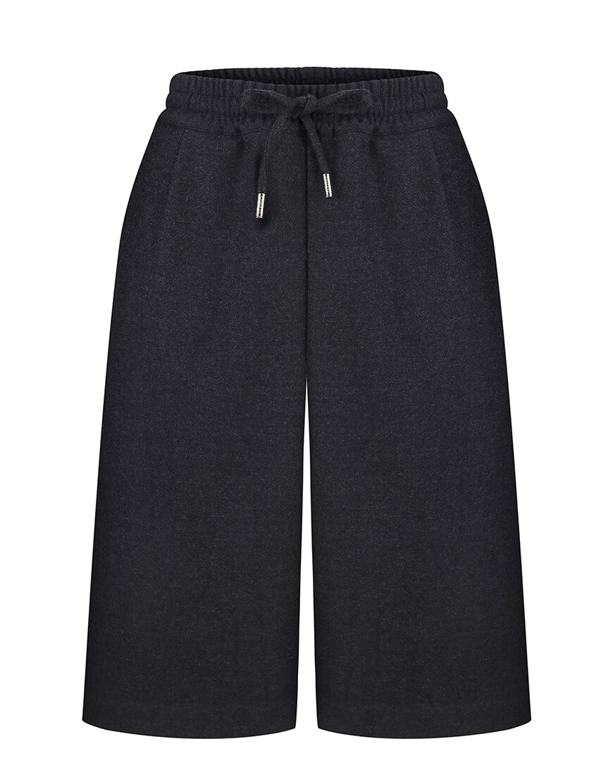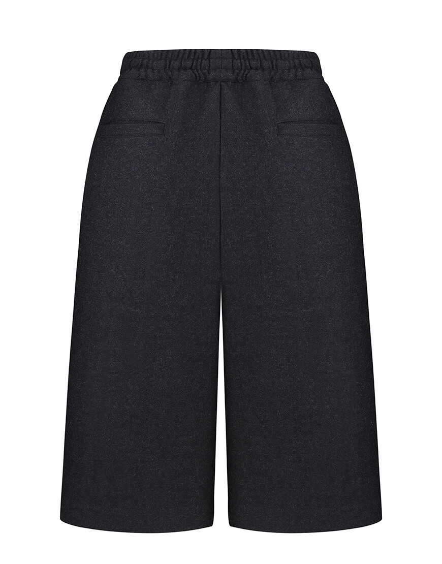 Подовжені шорти вільного силуету із вовни. Комфортний регульований пояс на резинці та кулісці, прикрашеній брендованою фурнітурою.