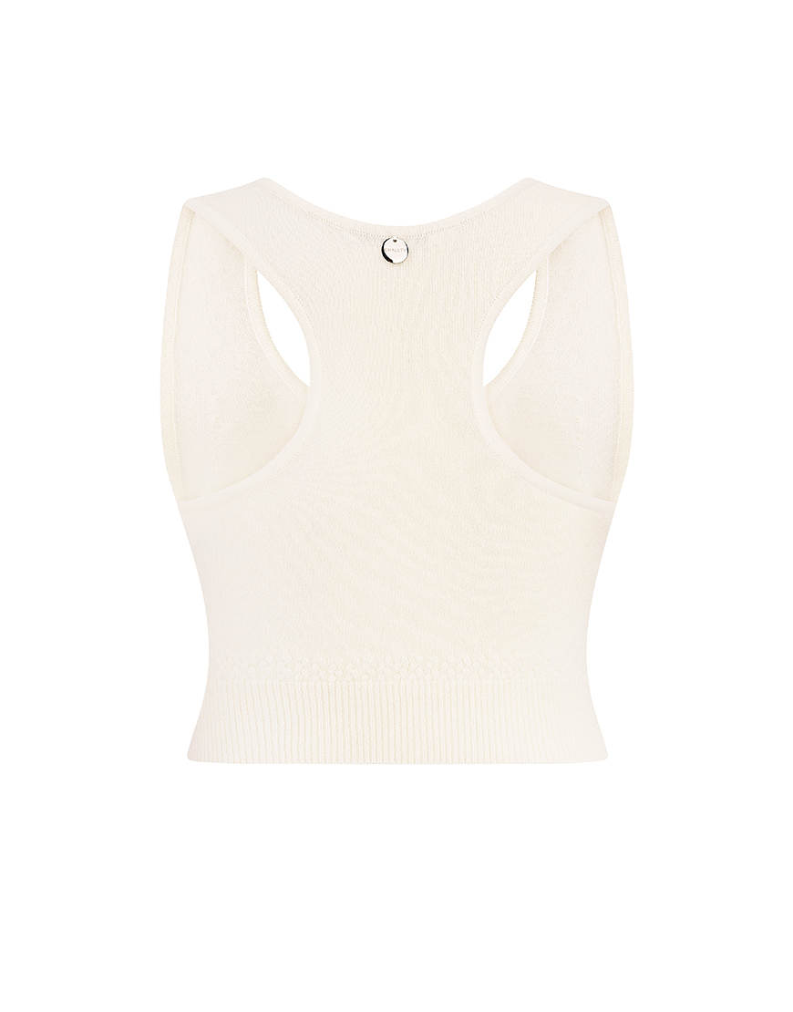 Кроп-топ із кашеміру та ультратонкої вовни мериносу, прикрашений брендованою фурнітурою. Низ виробу виконаний у техніці “гумка”.