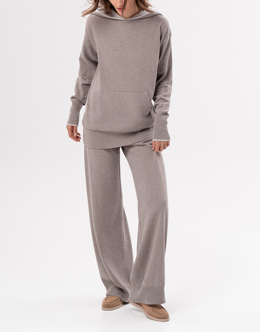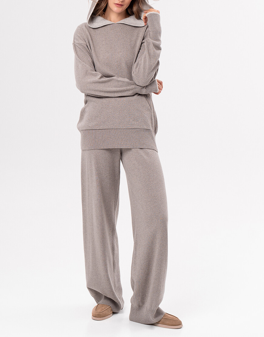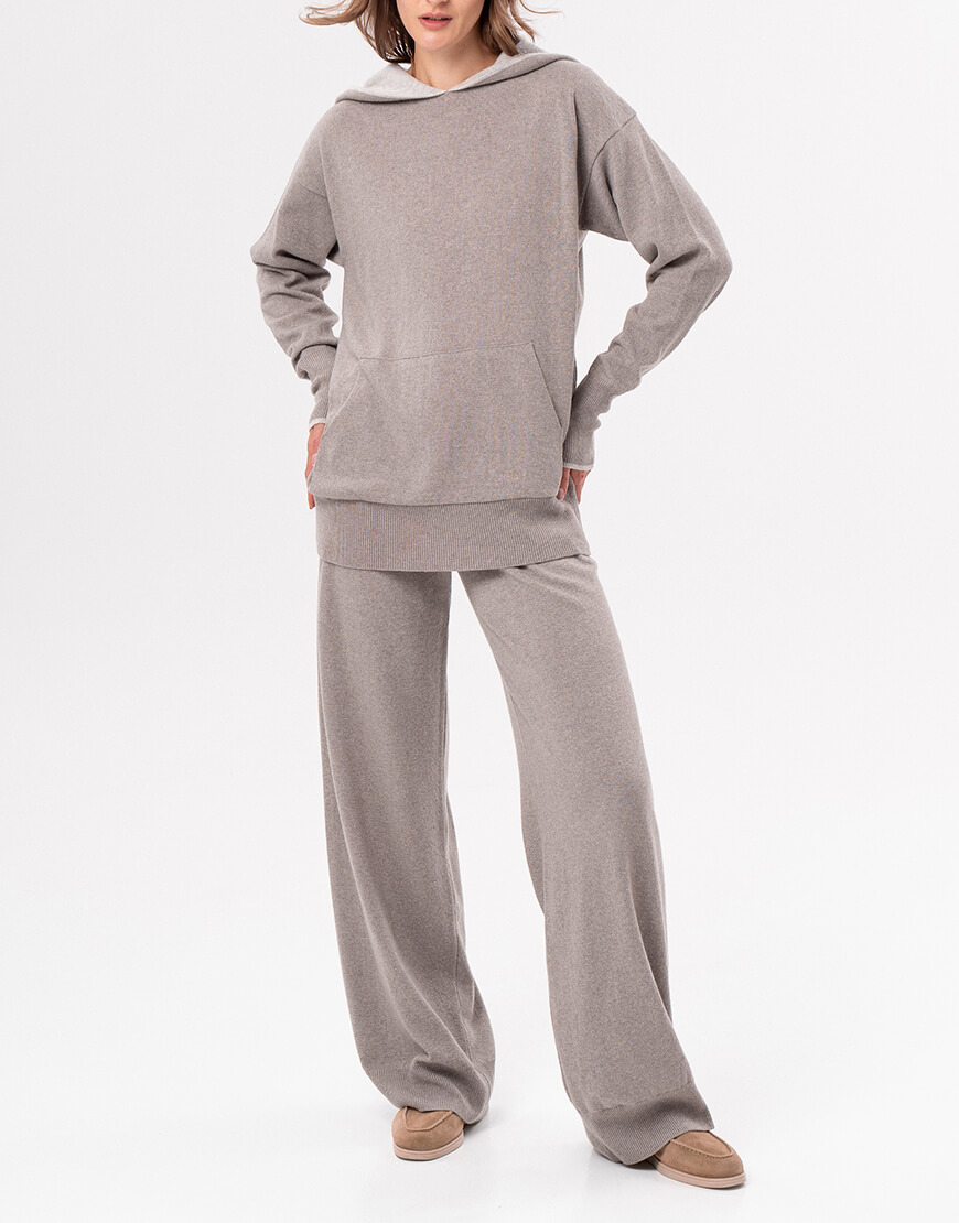 Брюки вільного розслабленого силуету, виконані з кашеміру та ультратонкої вовни мериносу. Внизу виробу – декоративне в’язання, еластичний пояс.
