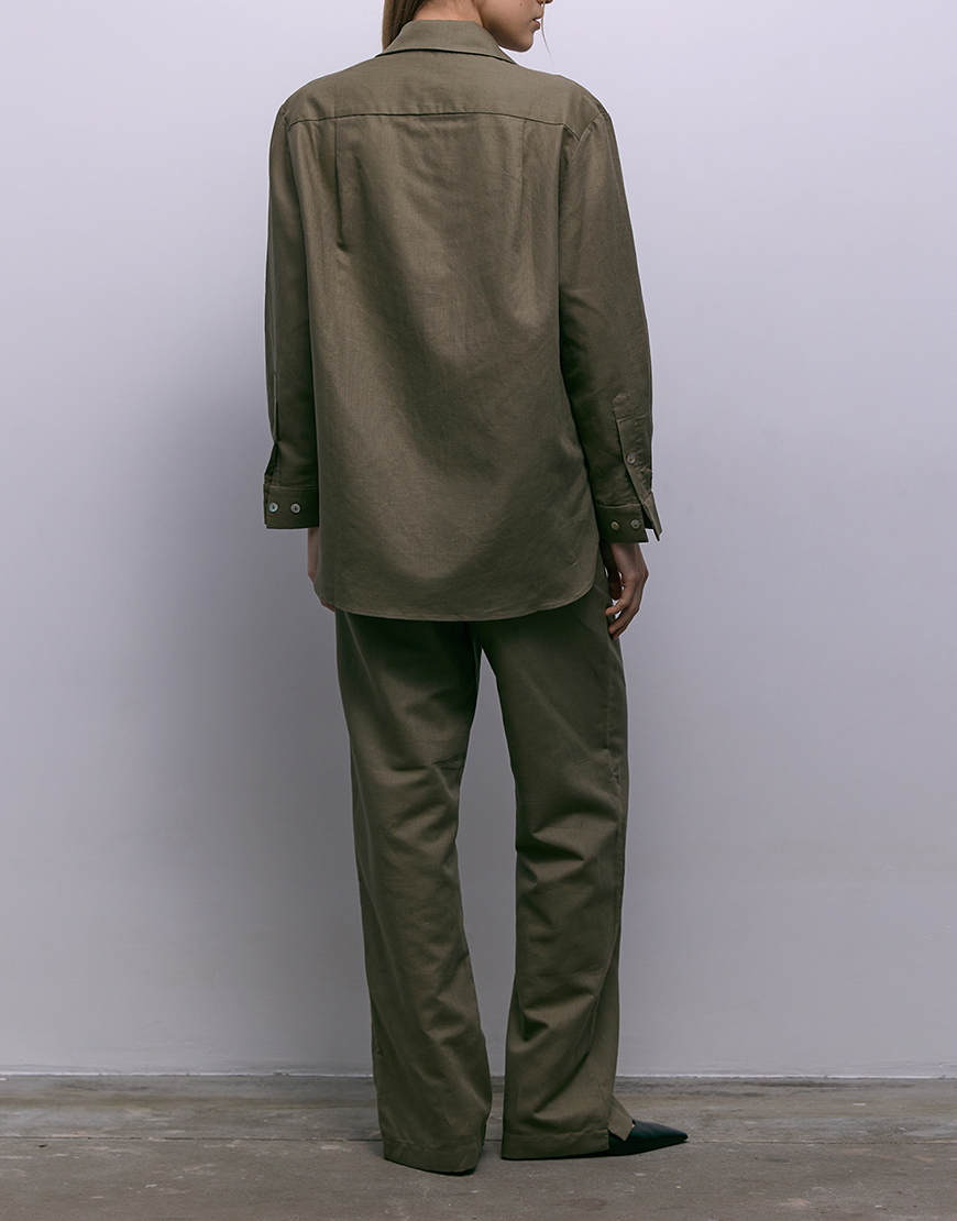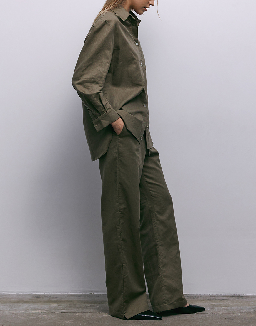Брюки вільного силуету з льону. Комфортний регульований пояс на резинці та кулісці, прикрашеній брендованою фурнітурою. Внизу з боків – декоративні розрізи. Ідеально поєднуються з сорочкою Lombardy.