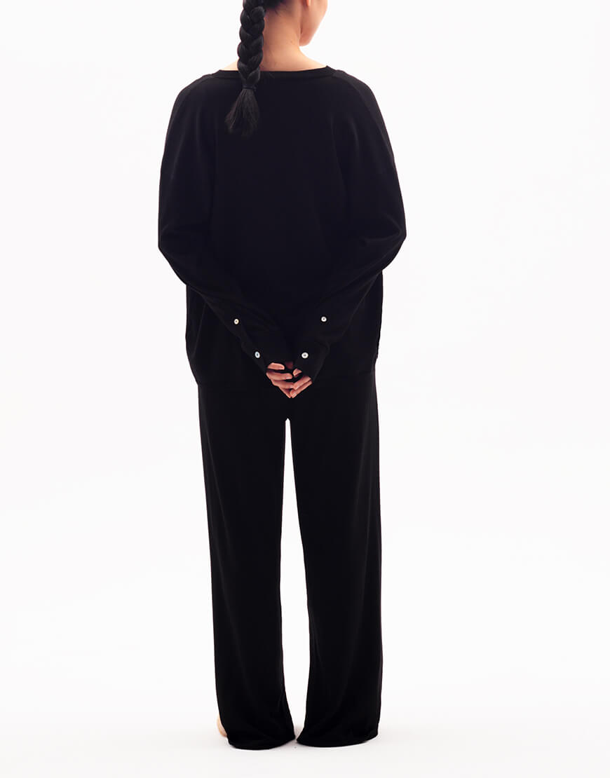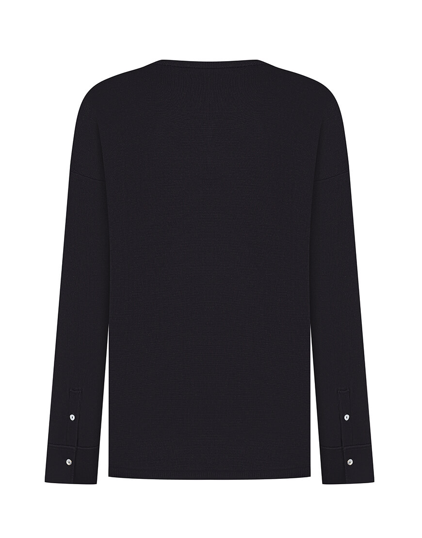 Сорочка з довгим рукавом без коміра. Розслаблений силует. Застібка – на гудзики з перламутру. Застібки на манжетах – гудзики. Внизу на планці – брендована фурнітура.