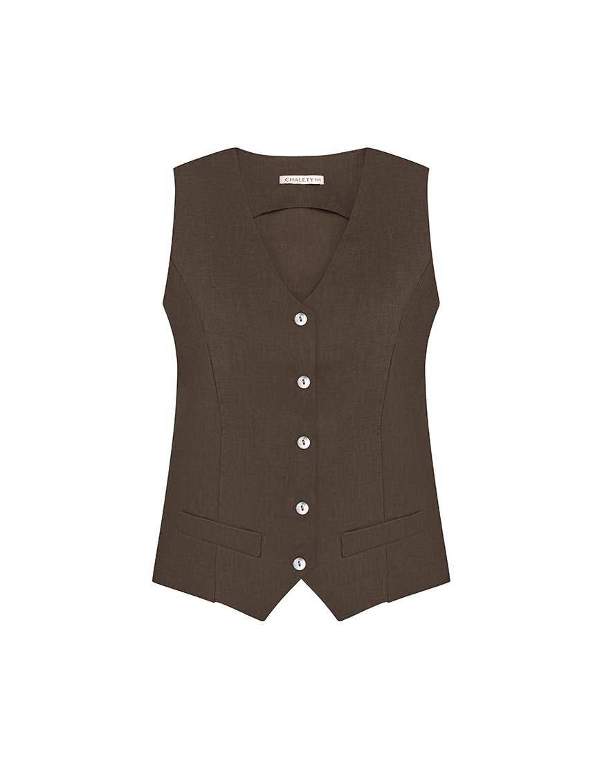 Декорований кишенями-обманками. Застібка — на гудзики з перламутрової мушлі.