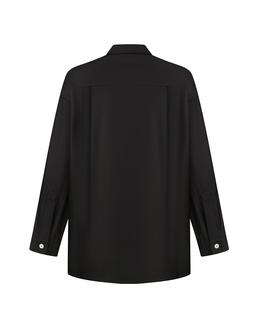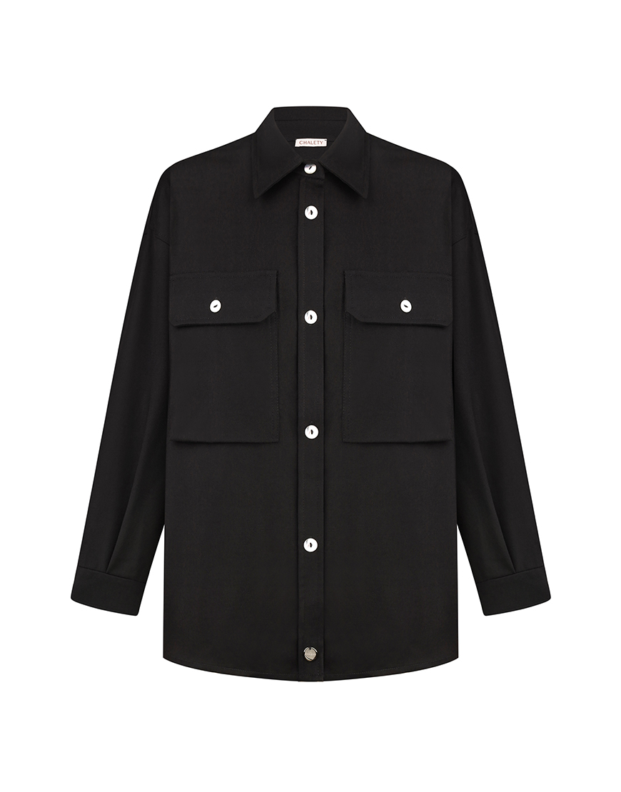 Сорочка подовжена з довгим рукавом з вовни та кашеміру. Розслаблений силует. Застібка – на гудзики з перламутру. Застібки на манжетах – гудзики. Внизу на планці – брендована фурнітура. Декоративні нашивні кишені “книжки”.