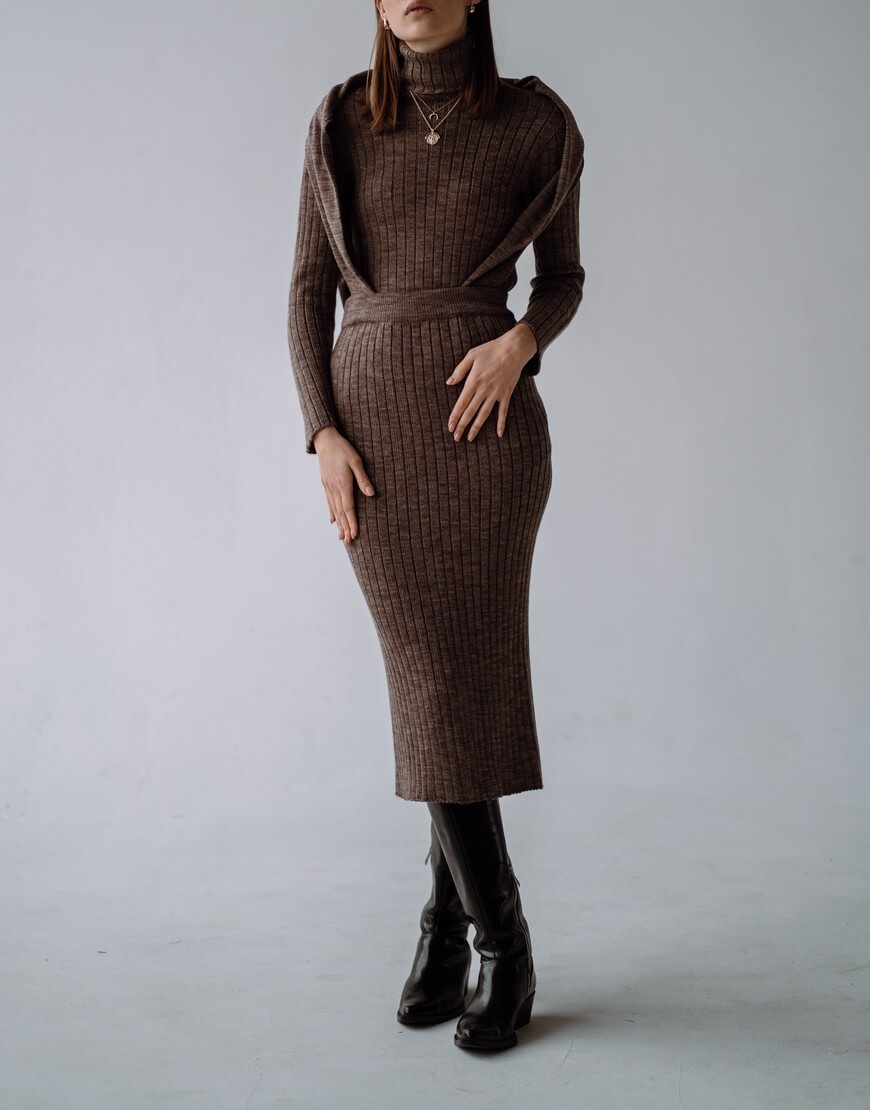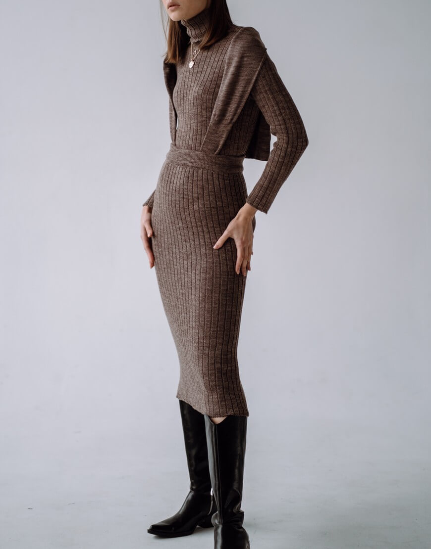 Костюм зі спідницею міді та гольфом, щільна в’язка.