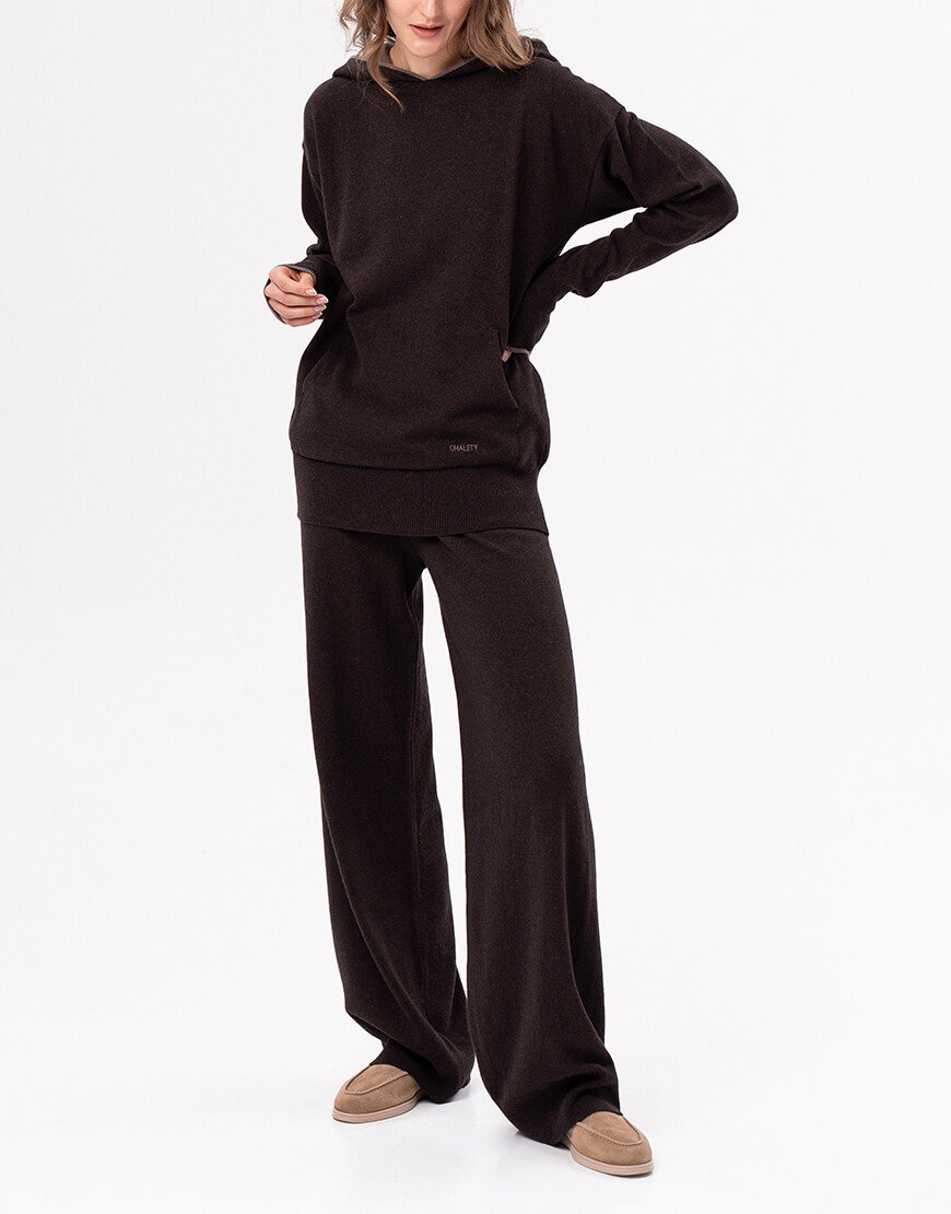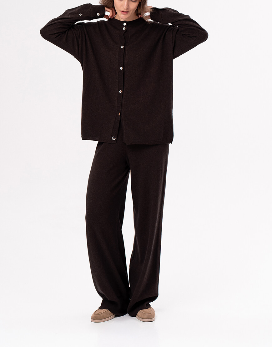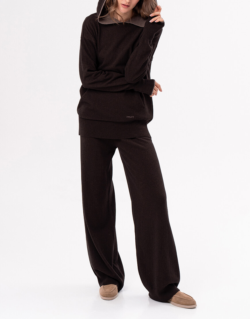 Брюки вільного розслабленого силуету, виконані з кашеміру та ультратонкої вовни мериносу. Внизу виробу – декоративне в’язання, еластичний пояс.