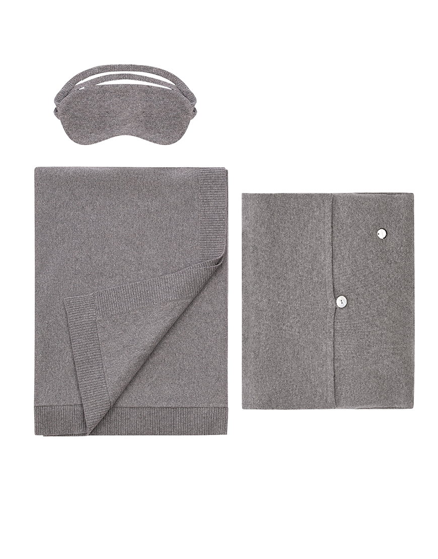 Набір для подорожей з кашеміру та ультратонкої вовни мериносу. У набір входить: плед розміром 1,5м*1м, маска для сну з внутрішнім оздобленням з шовку, чохол. Застібка – на гудзик з перламутрової черепашки. Ідеальний для перельотів.