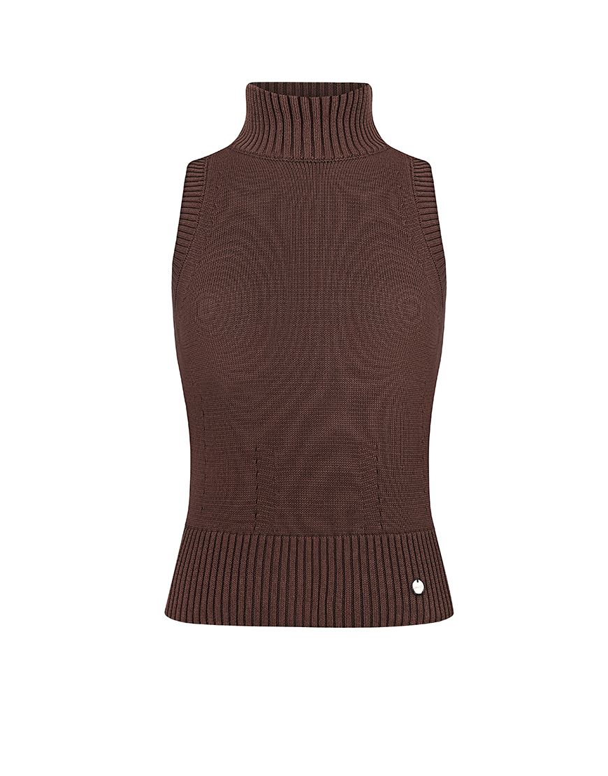Трикотажний топ без рукавів з органічної бавовни, оздоблений брендованою фурнітурою. Комір – стійка. Низ виконаний у техніці “гумка”.