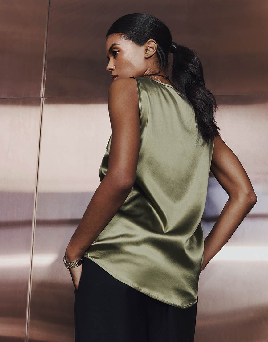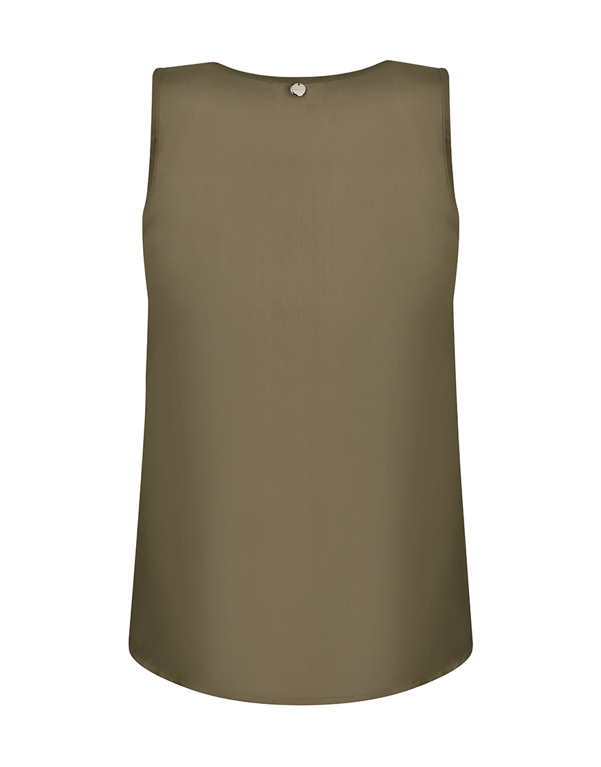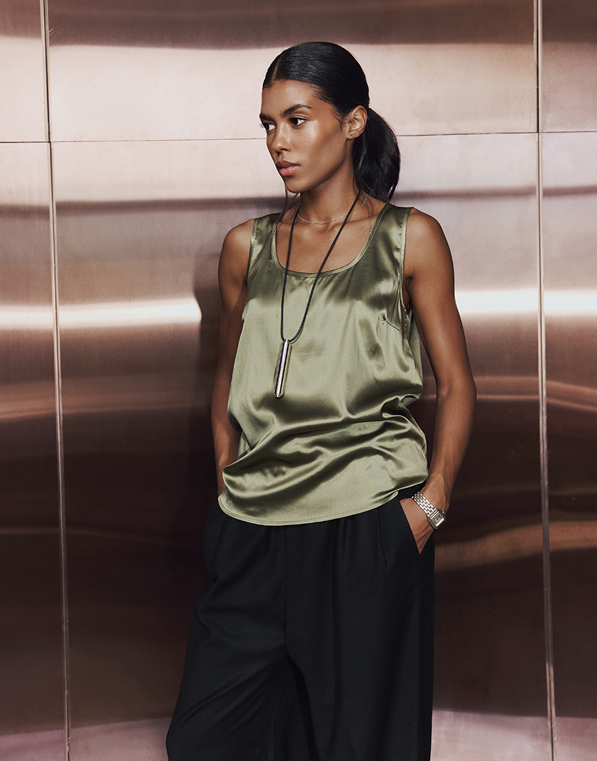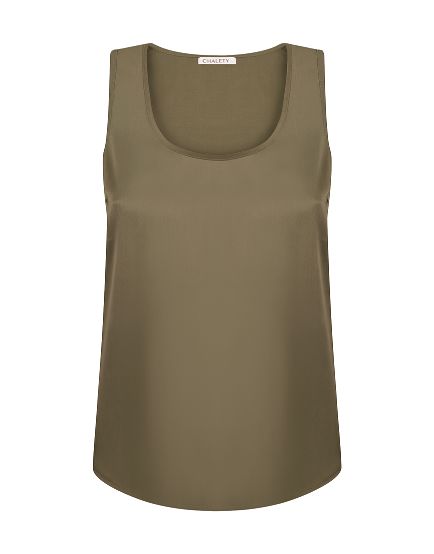 Шовковий топ розслабленого силуету, оздоблений брендованою фурнітурою.