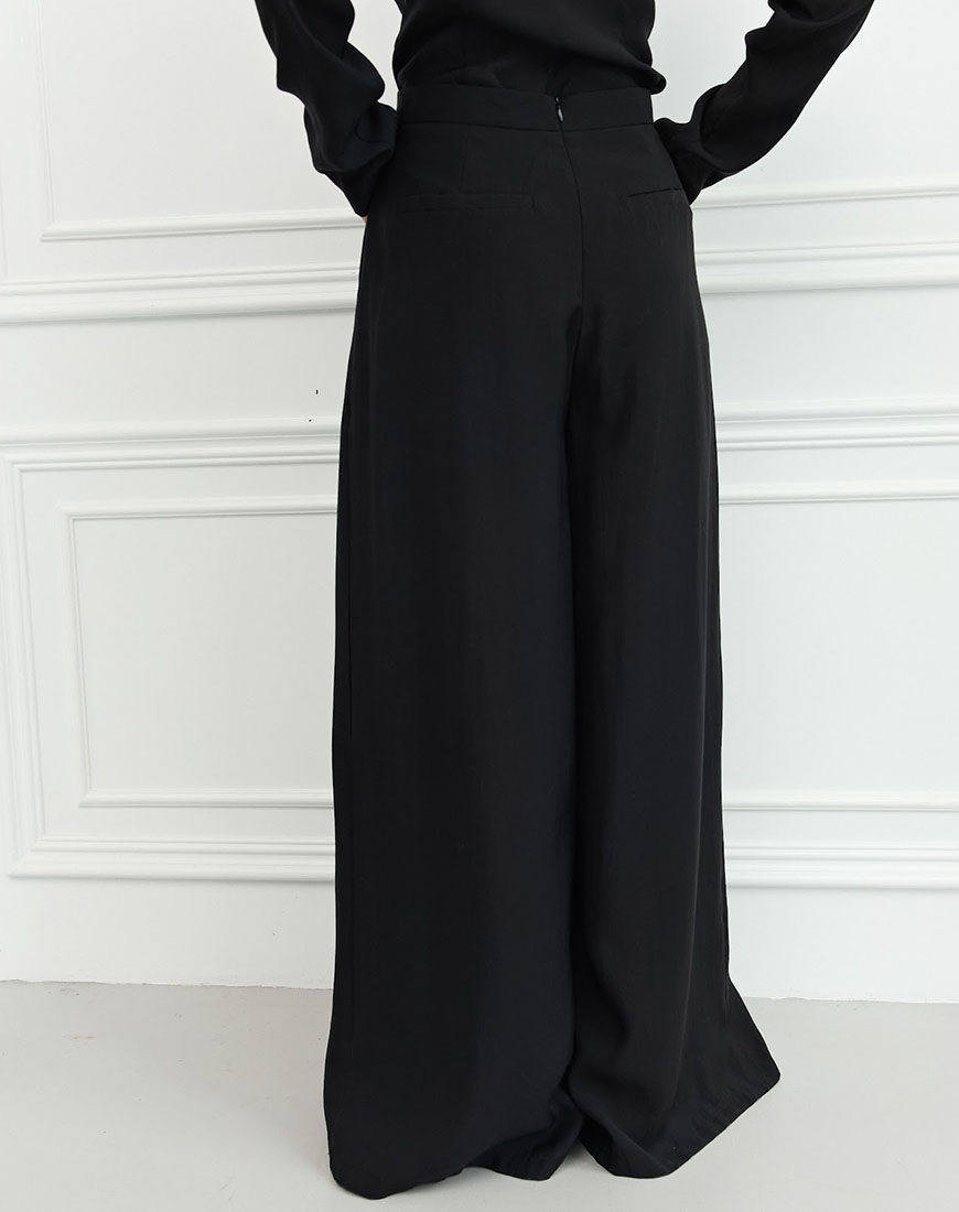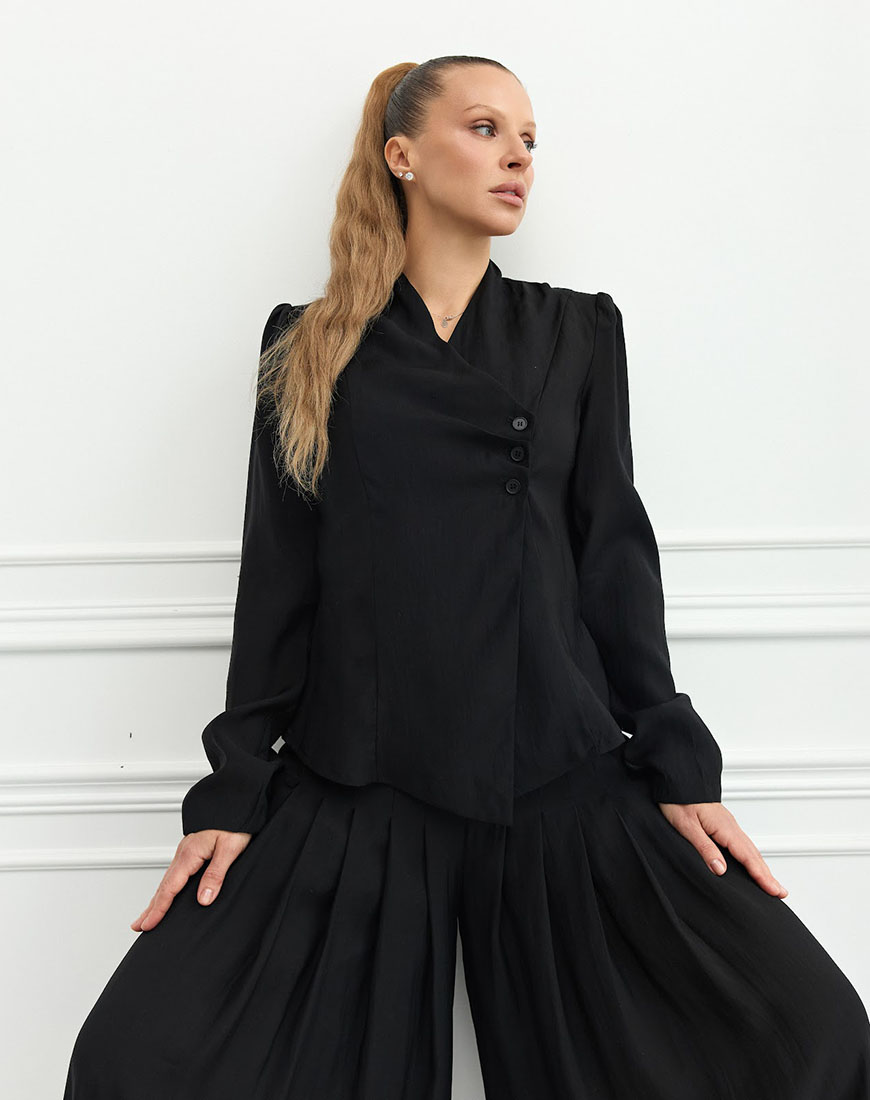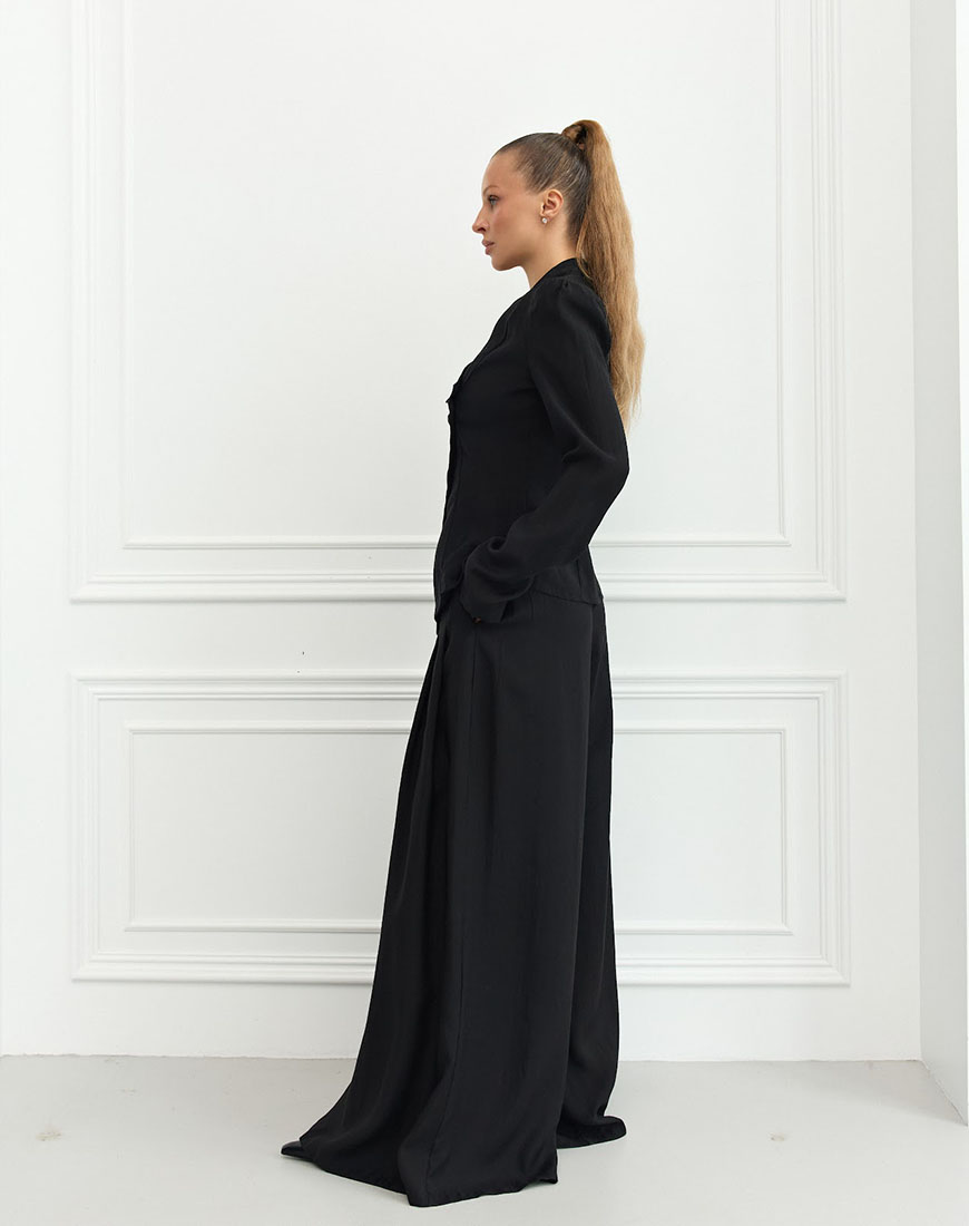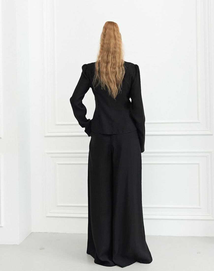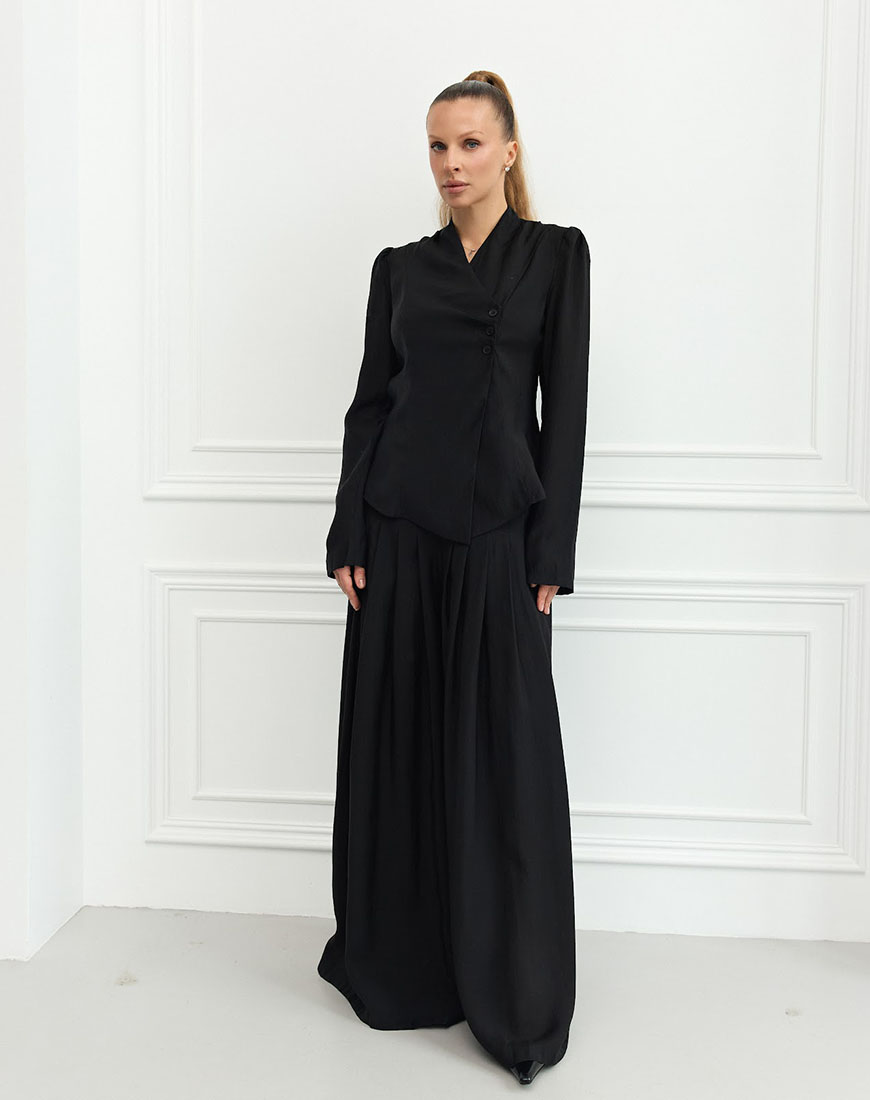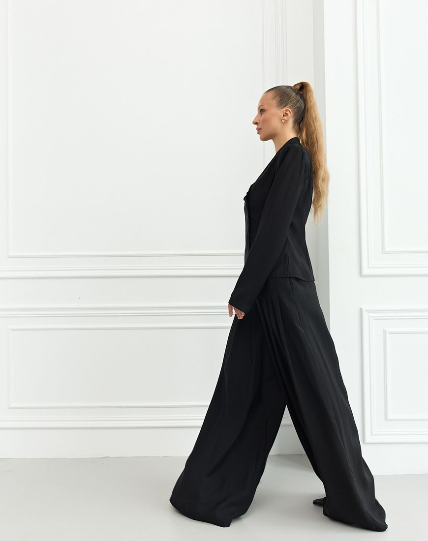 Комплект складається з асиметричного жакета та широких брюк із високою посадкою, що створюють витончений і сучасний силует.