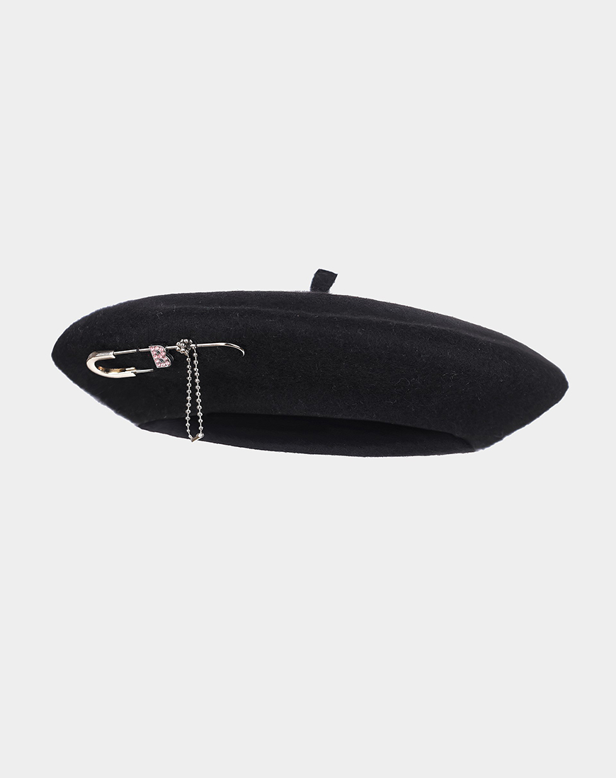 Чорний жіночий вовняний берет з аплікацією у формі металевої літери B з рожевими стразами — виразний акцент у мінімалістичному образі. Декор доповнений булавкою та ланцюжком, що додає характеру та графічності.