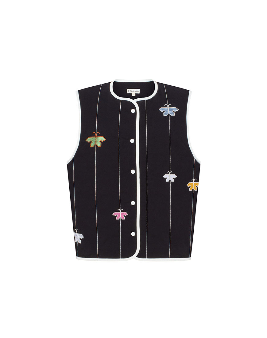 Дизайн жилета увиразнюють контрастні вертикальні стібки та чорне окантування по краях.