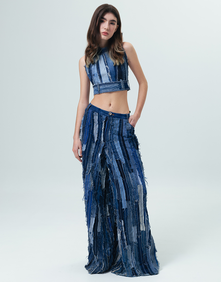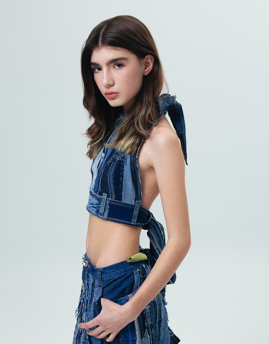 Доставка впродовж 2-9 робочих днівАпсайкл топ із джинсових речей із секонд хенду виконаний в техніці печворк на зав’язку з голою спиною