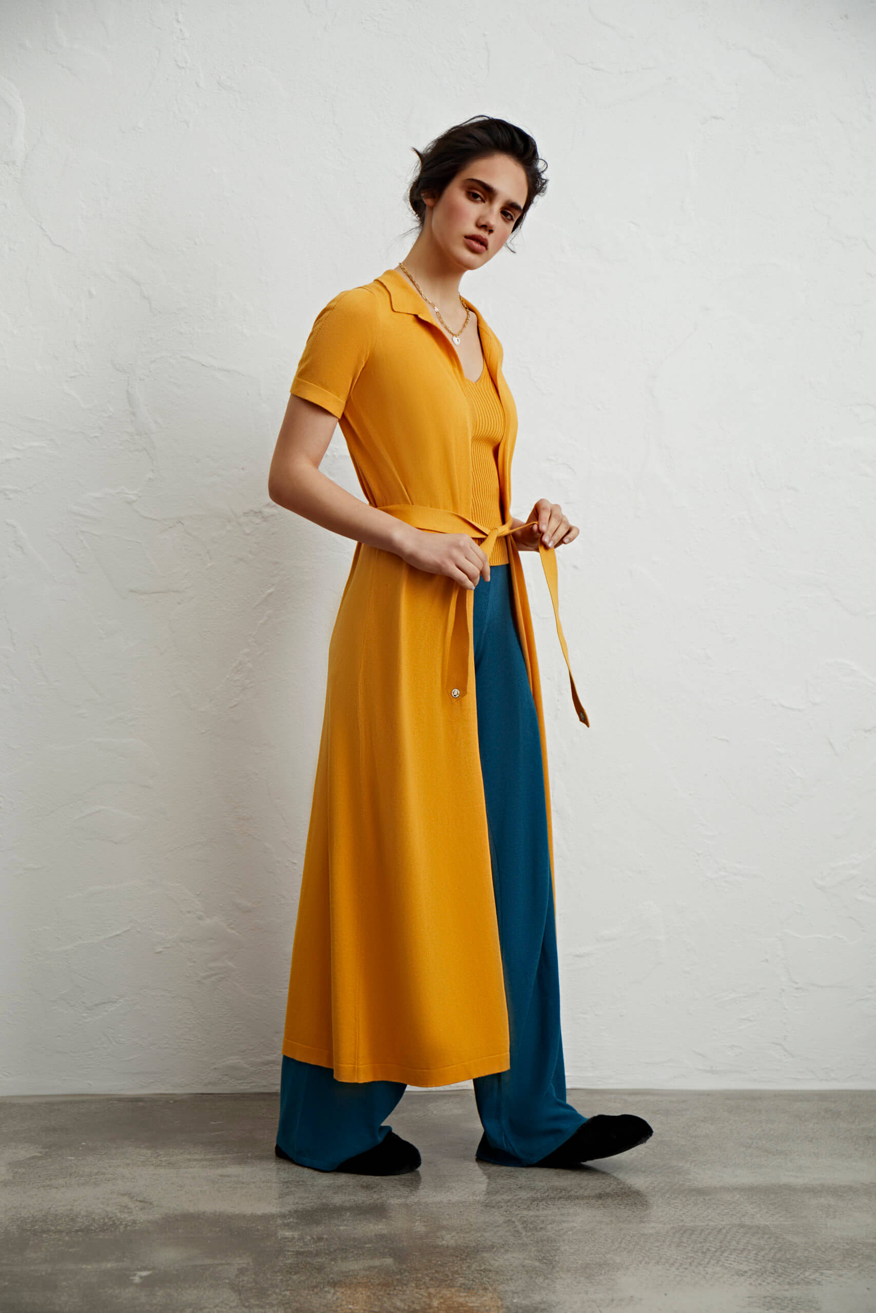 Кардиган із загостреним коміром. Без застібки із знімним поясом.