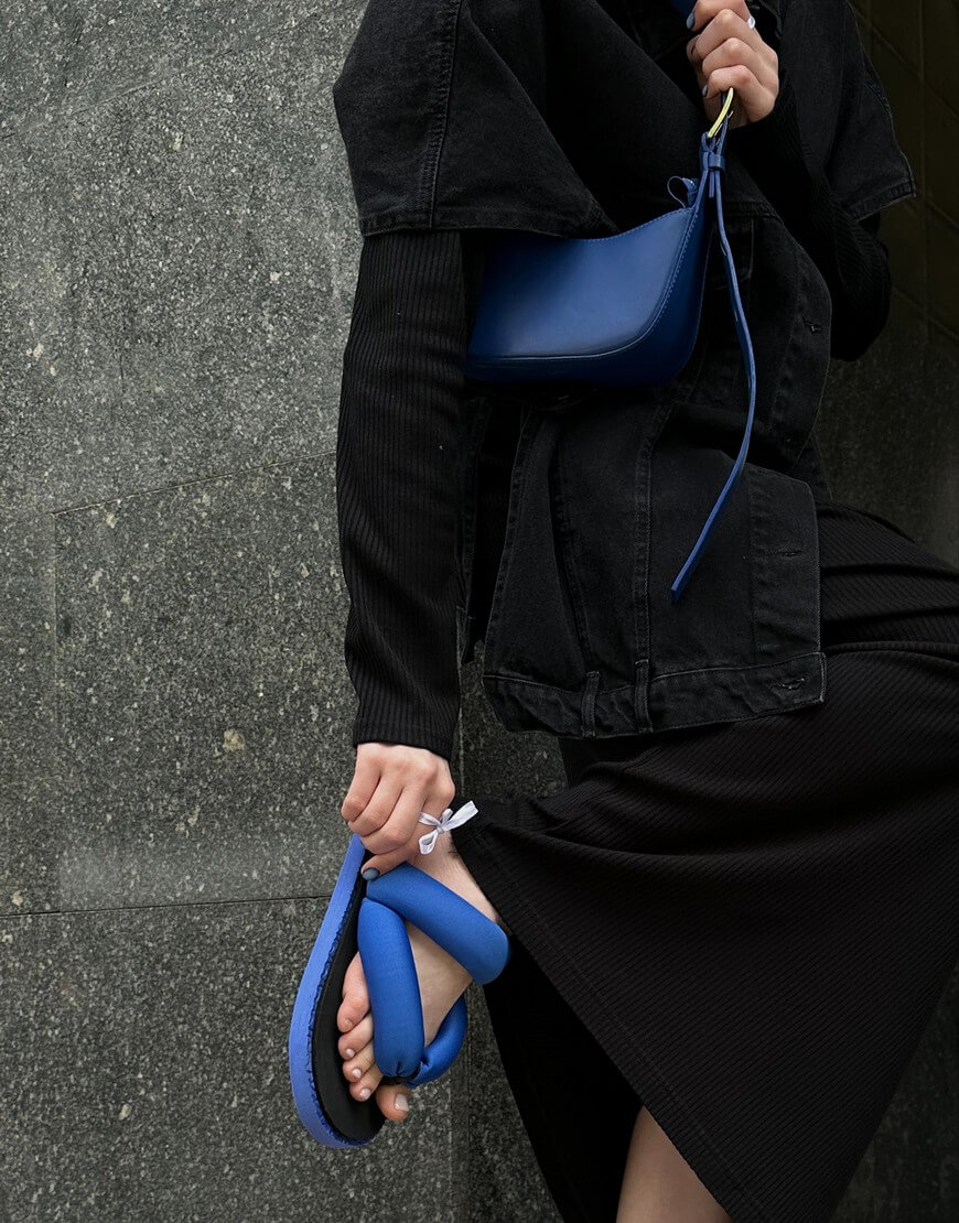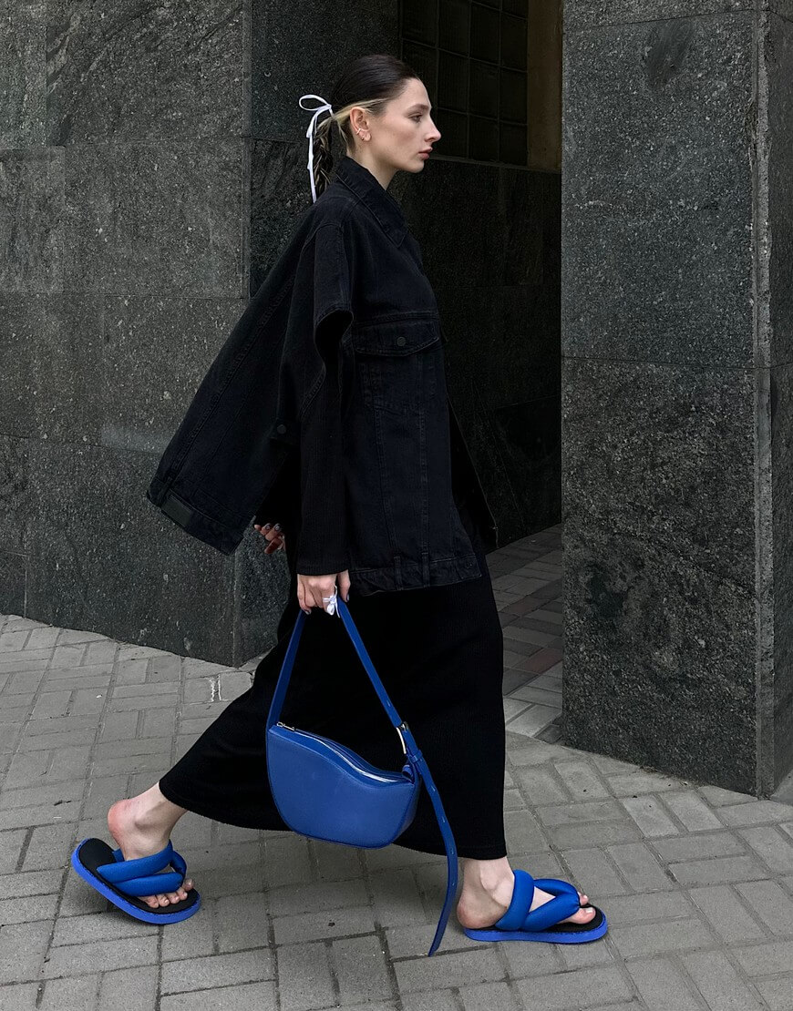Сині сандалі-в’єтнамки з дутими ременями, на легкій платформі з EVA чорного кольору.