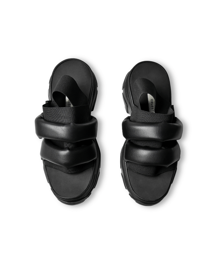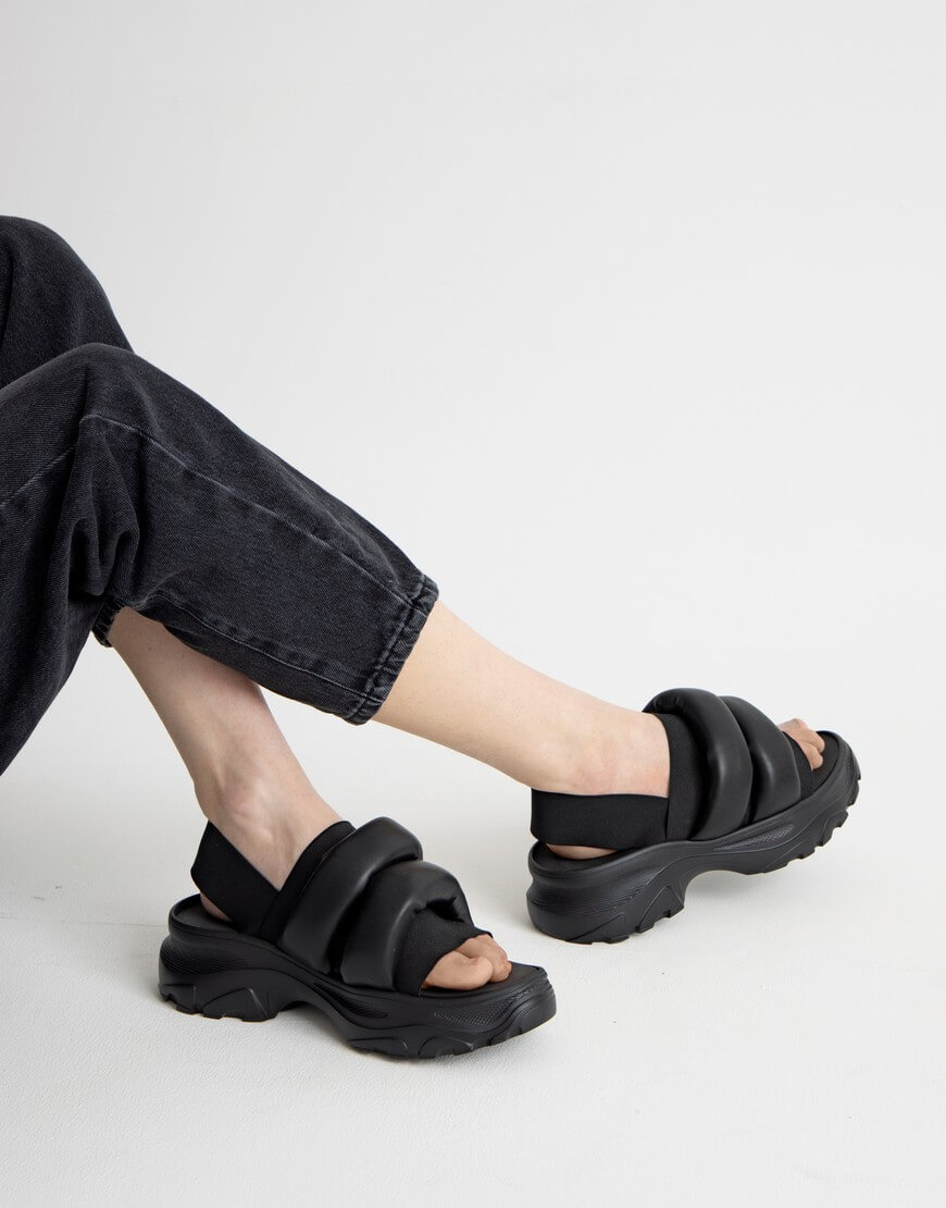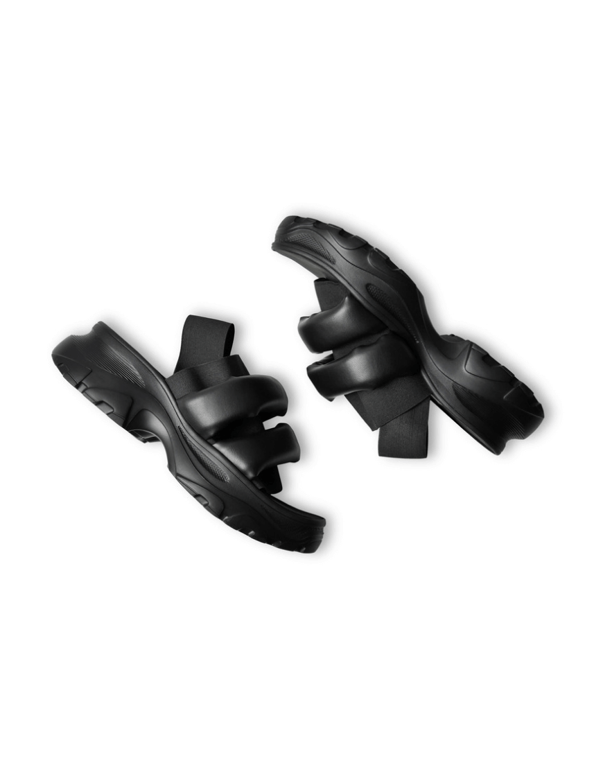 Доставка впродовж 2-5 робочих днівЧорні сандалії з дутими ременями на легкій платформі з EVA чорного кольору з прошитою устілкою з EVA. Фіксуються на нозі за рахунок еластичних резинок, які підходять під будь-який підйом.
