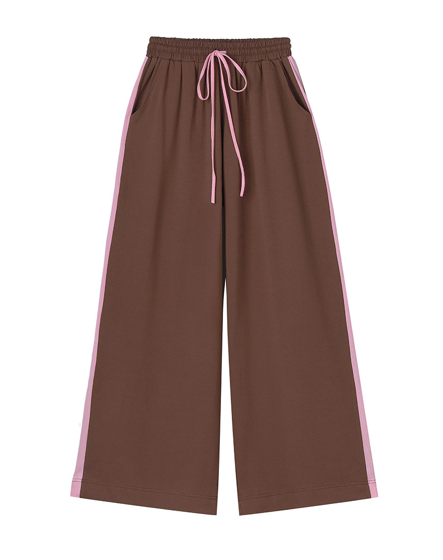 Піжамні штани коричневого кольору з рожевими лпмпасами, виконані з приємної до тіла бавовни, плєдують з лонгом з цієї ж колекції та забезпечують комфортні відчуття під час носіння.