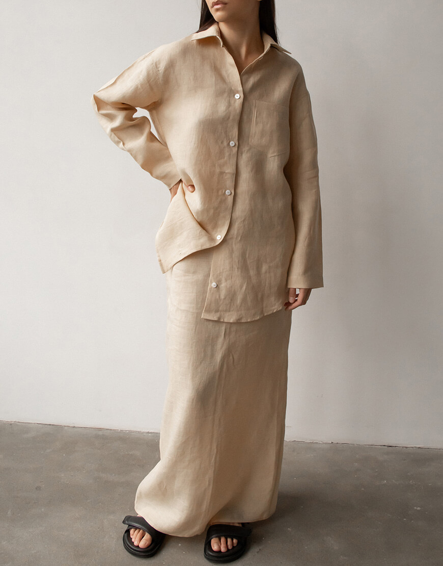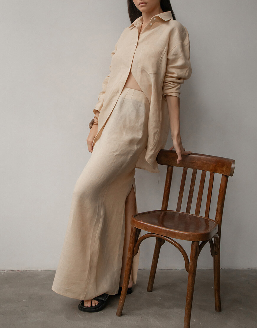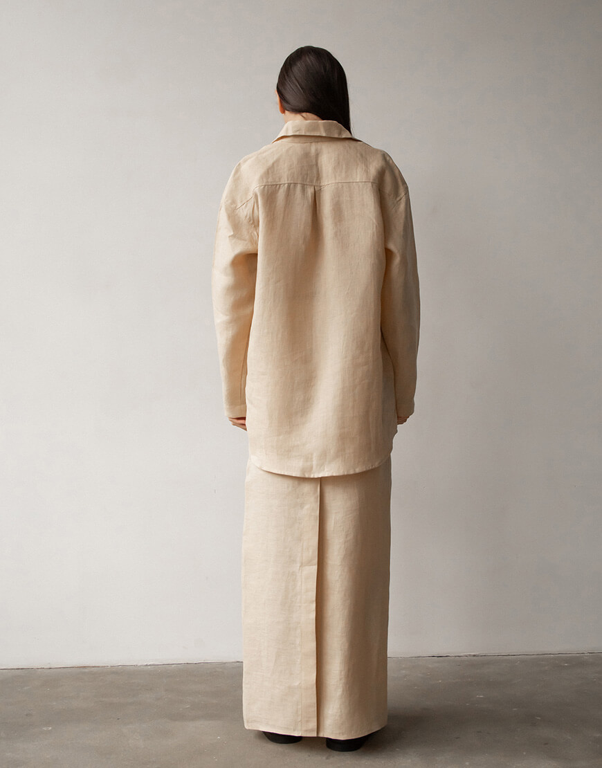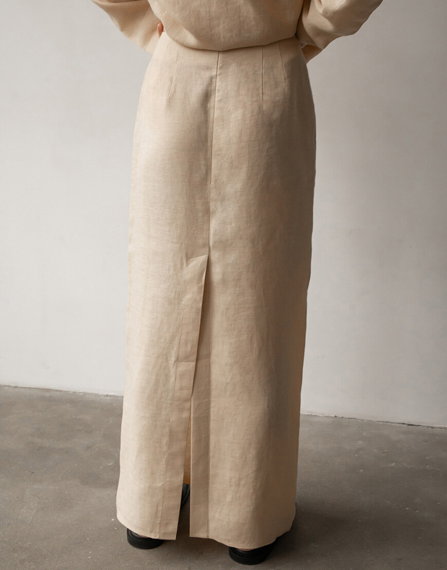 Лляна спідниця прямого крою з потаємною блискавкою. Розріз позаду