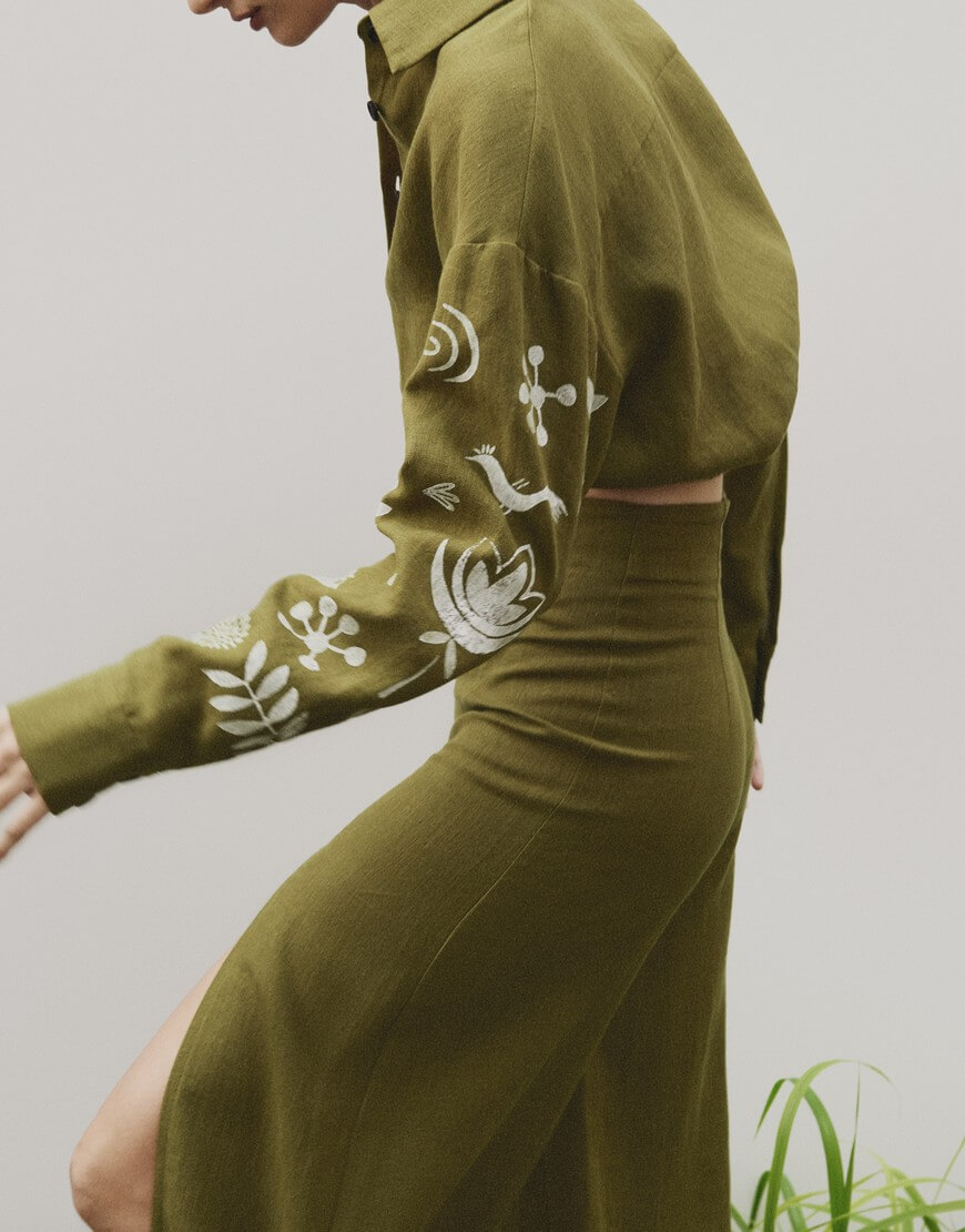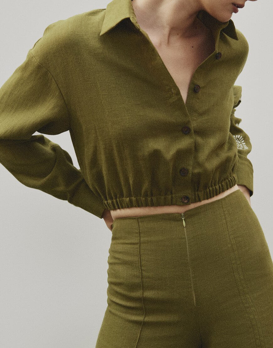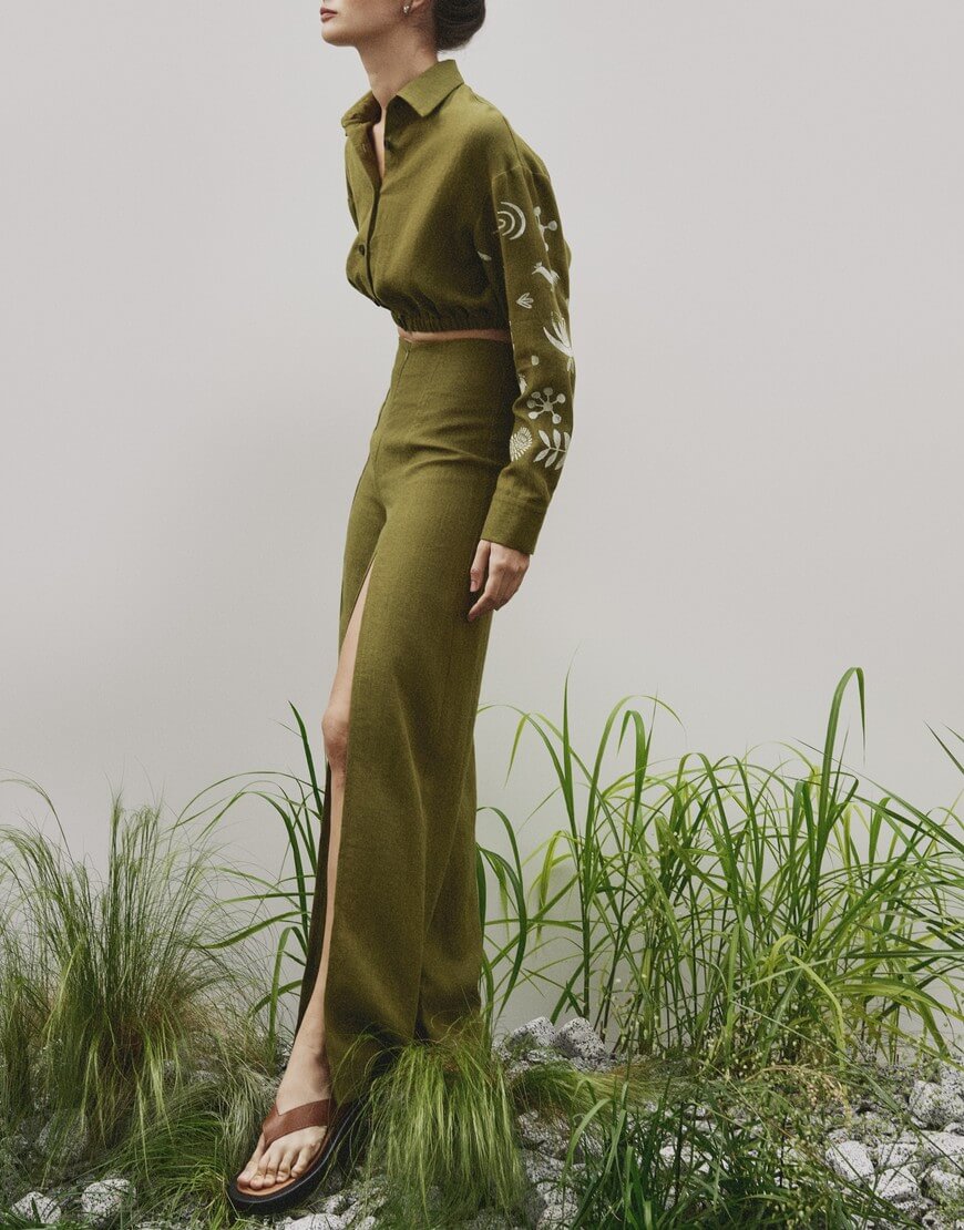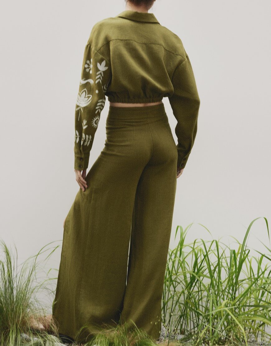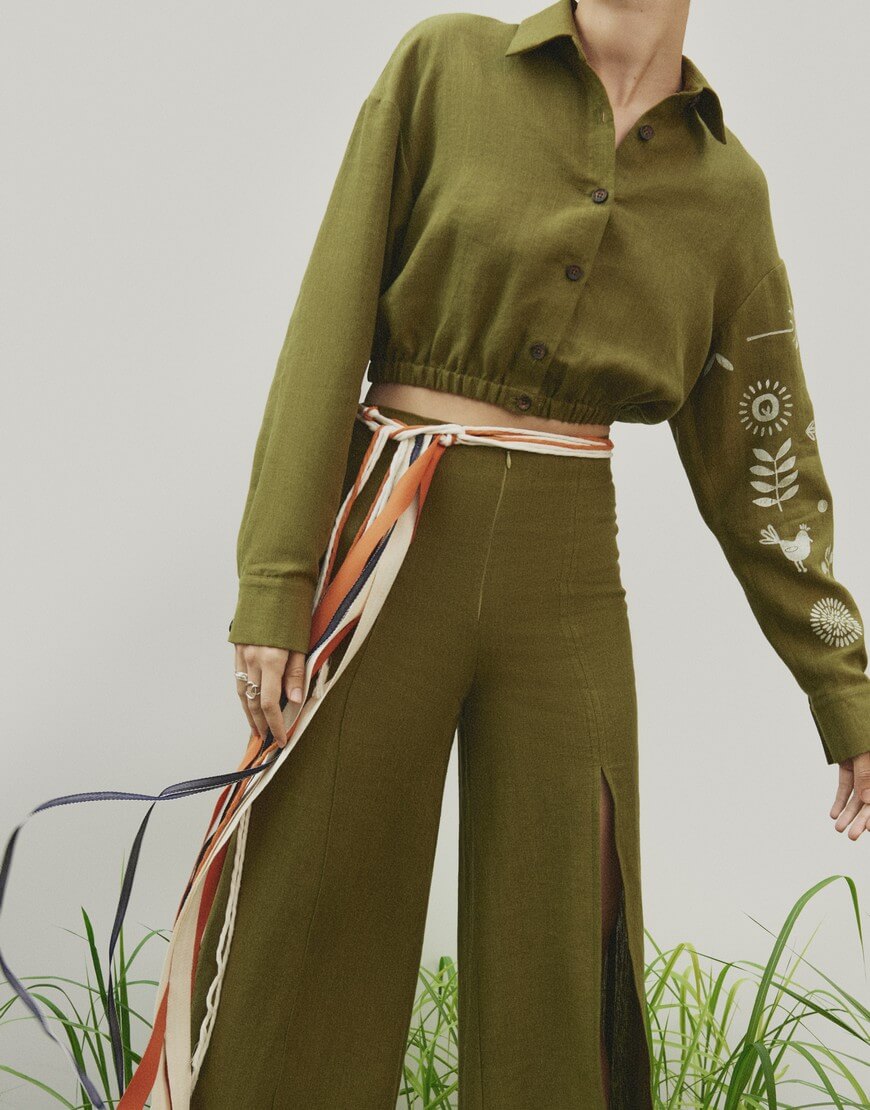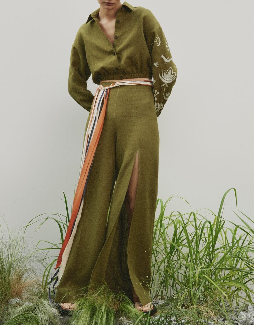 Лляні палаццо з розрізом на лівій нозі та декоративною стрічкою.
