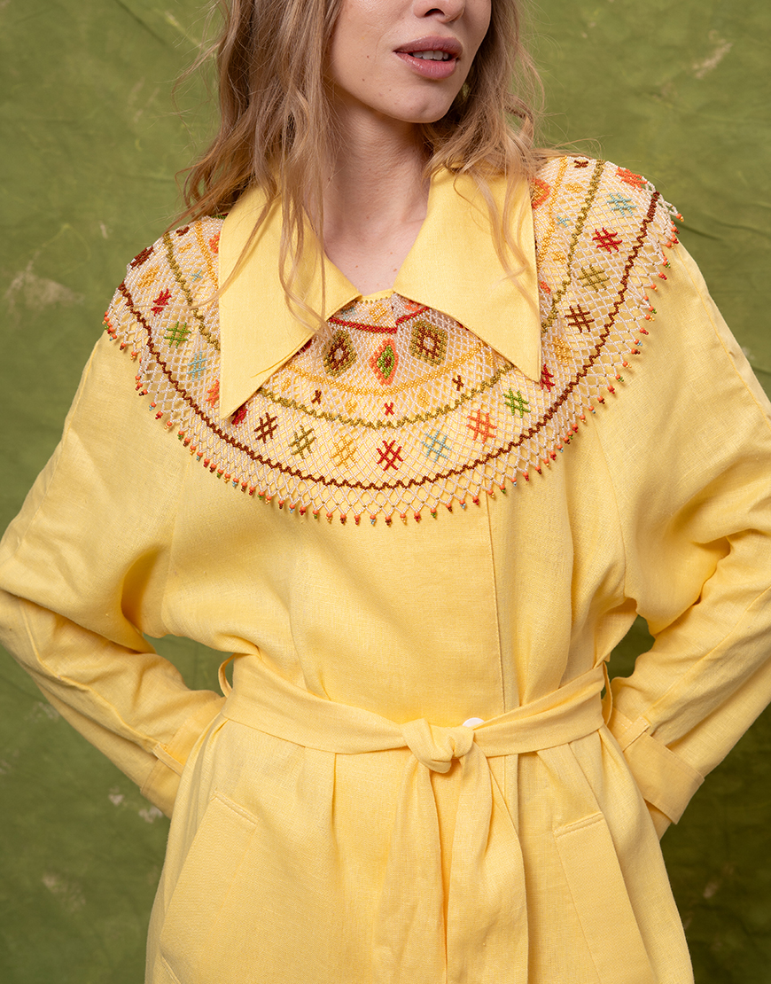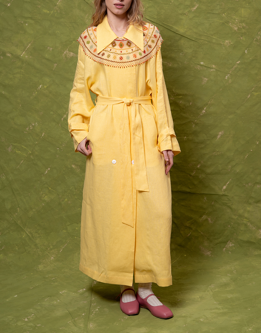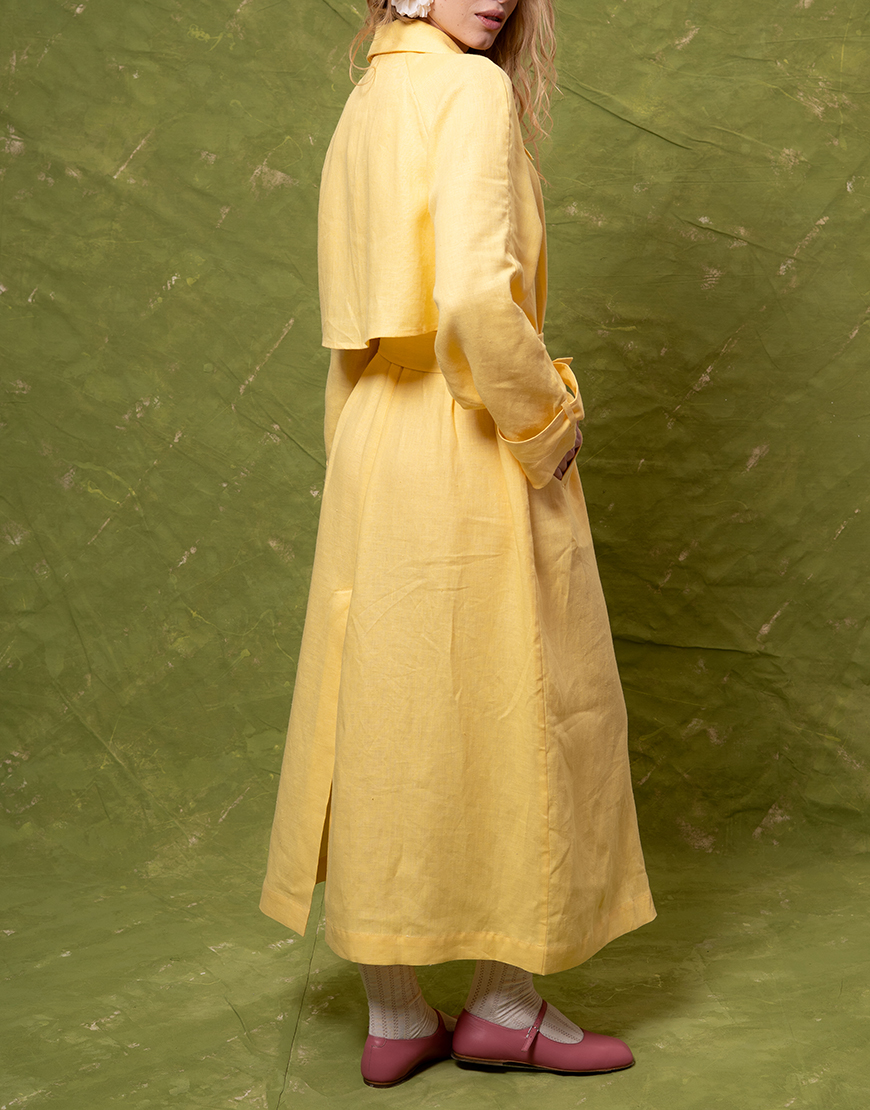 Лляний тренч вільного крою з паском та кишенями