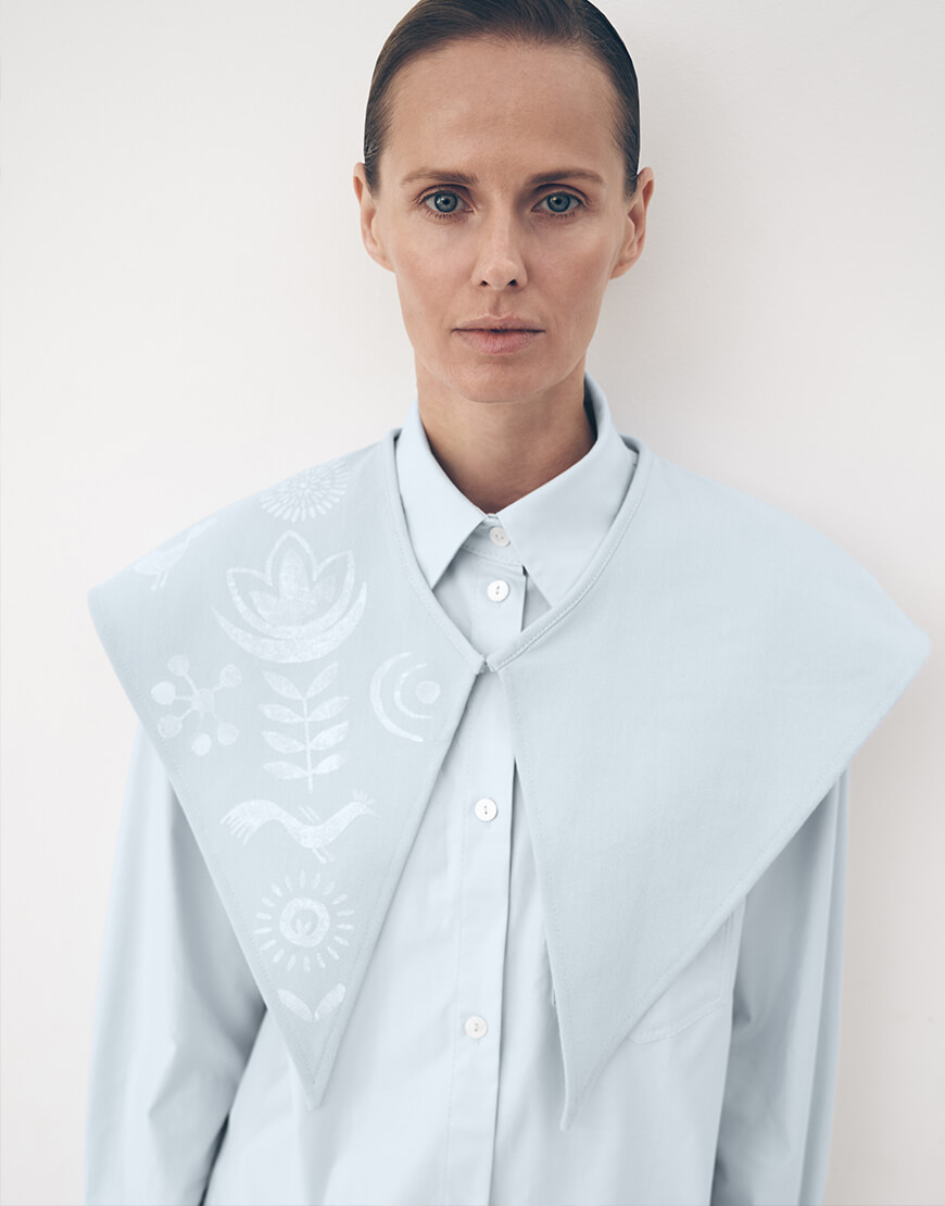 Великий декоративний комір з бавовни з ручною вибойкою, яка є орнаментом оздоблювання українських хат 1980х років.