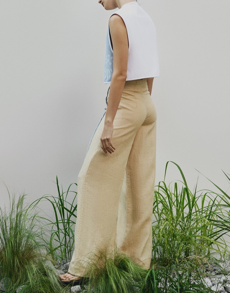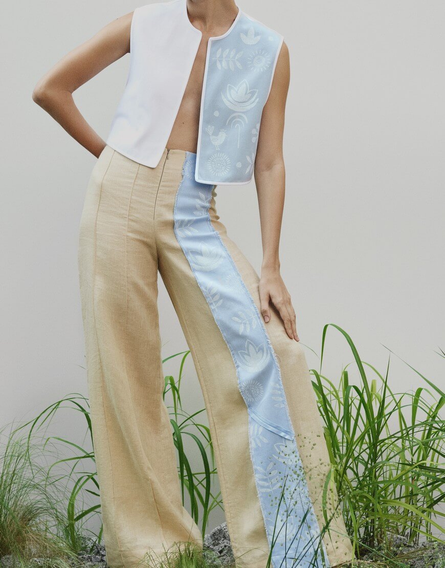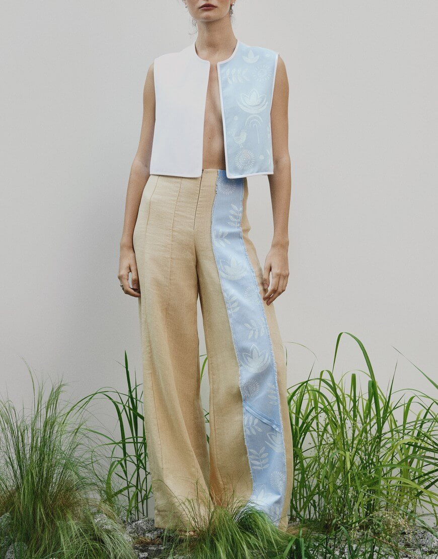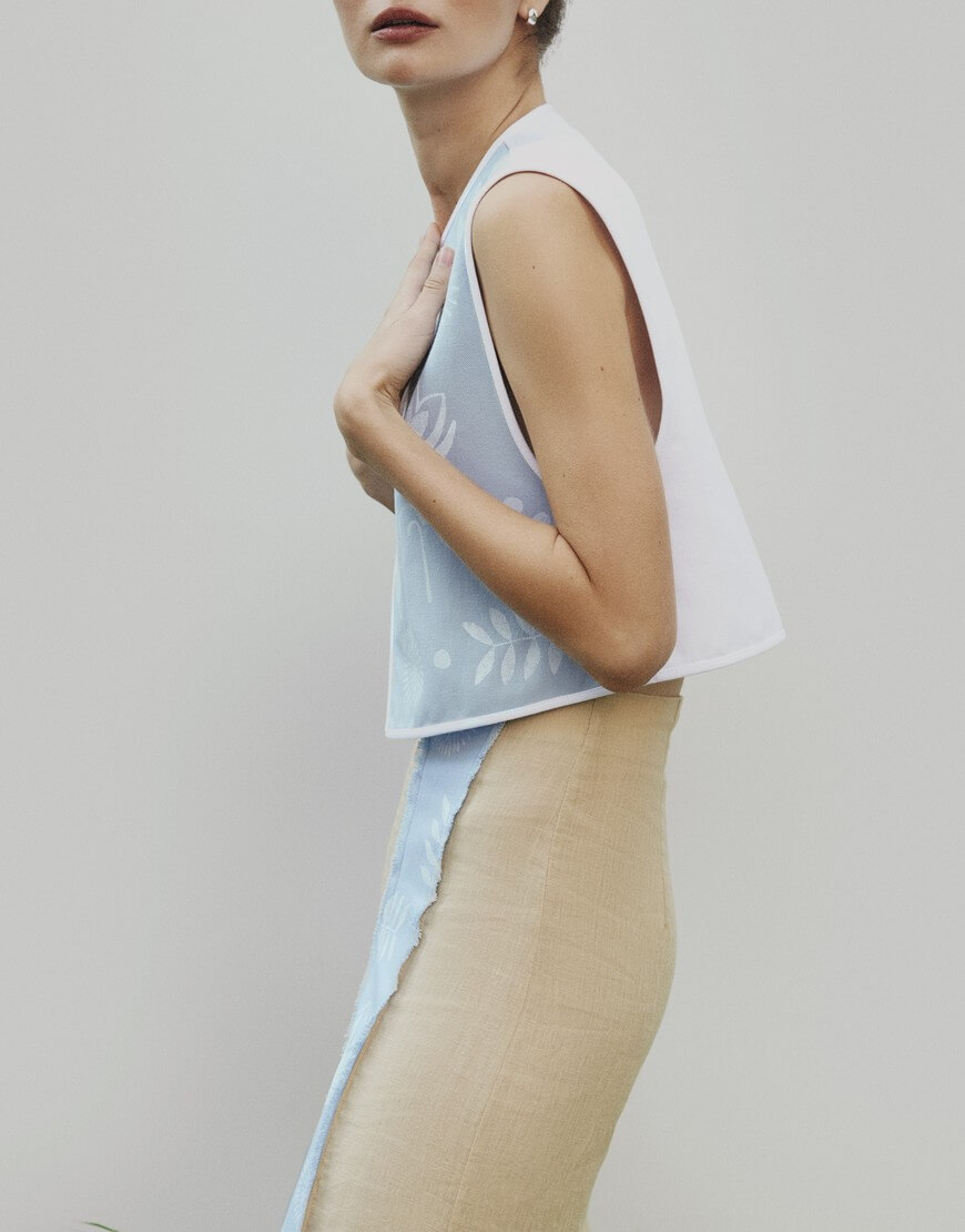 Двостороння декоративна жилетка біло-блакитного кольору. З однієї сторони є ручна вибійка, яка є орнаментом оздоблення українських хат 1980-х років. Баововна, без застібки.
