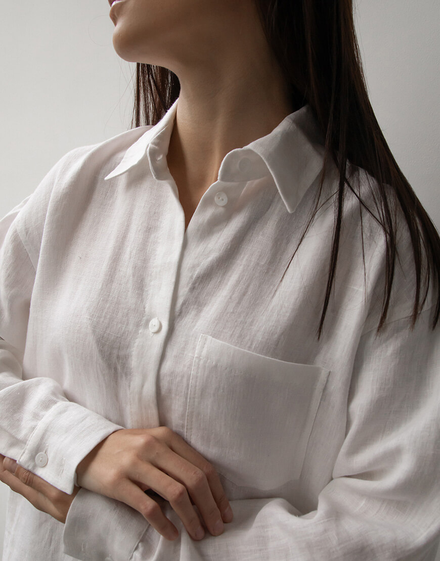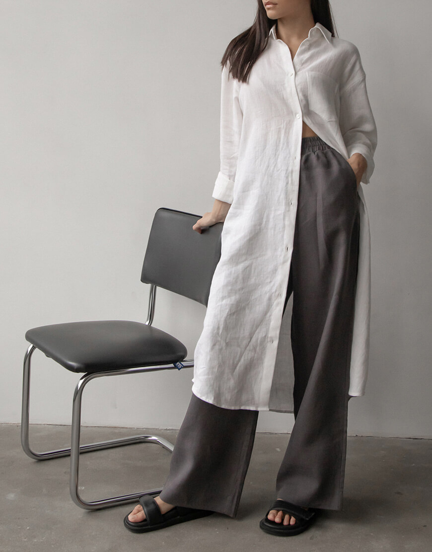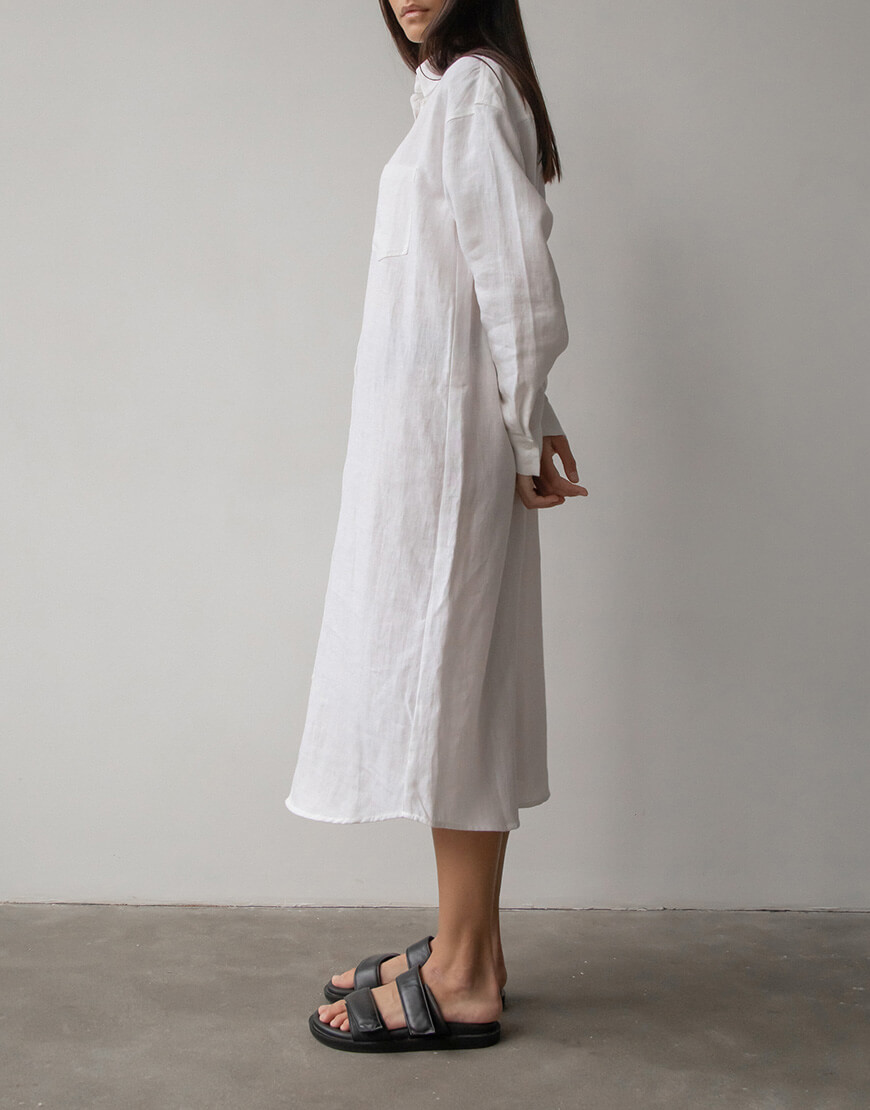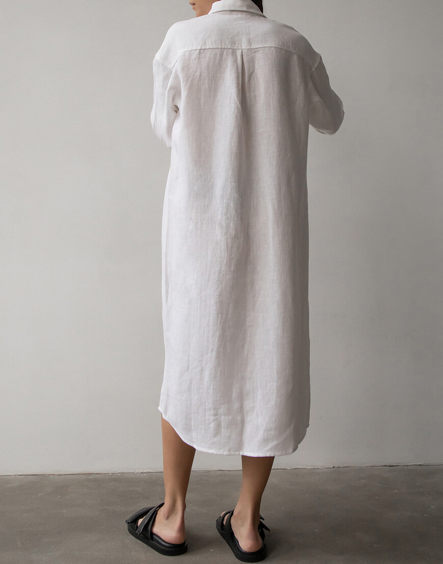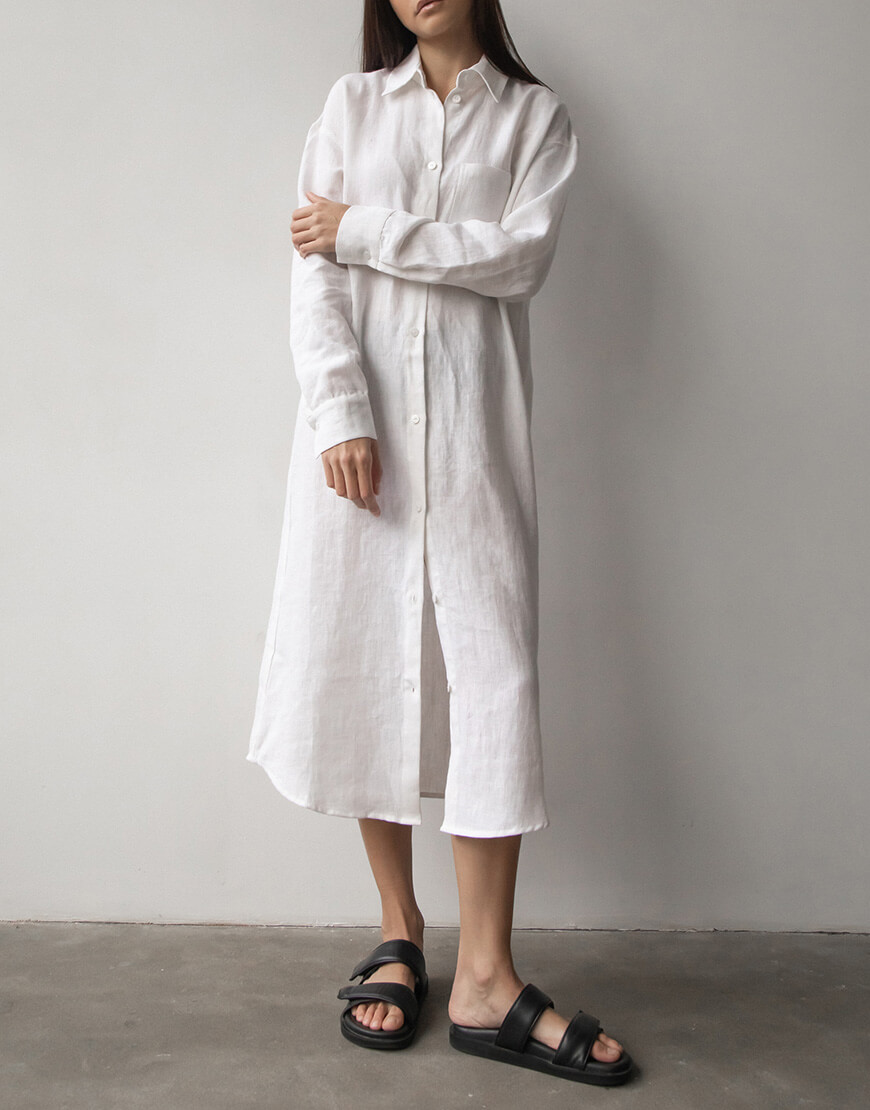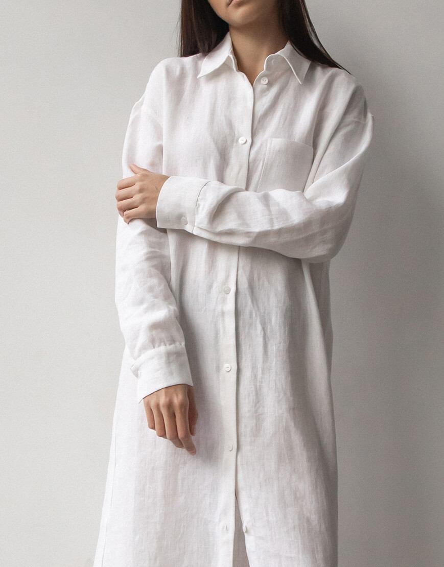 Лляна сукня-сорочка з льону вільного крою з коміром та манжетами. Гудзики зі 100% мушлі