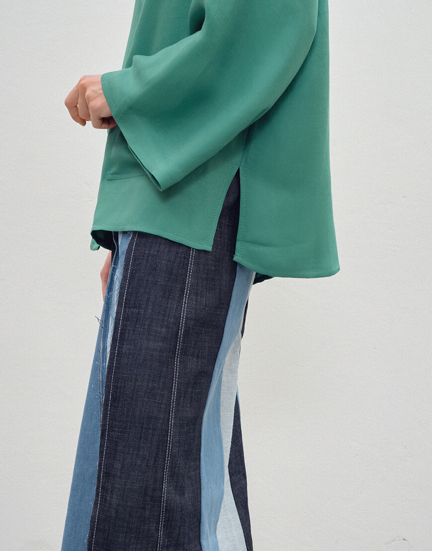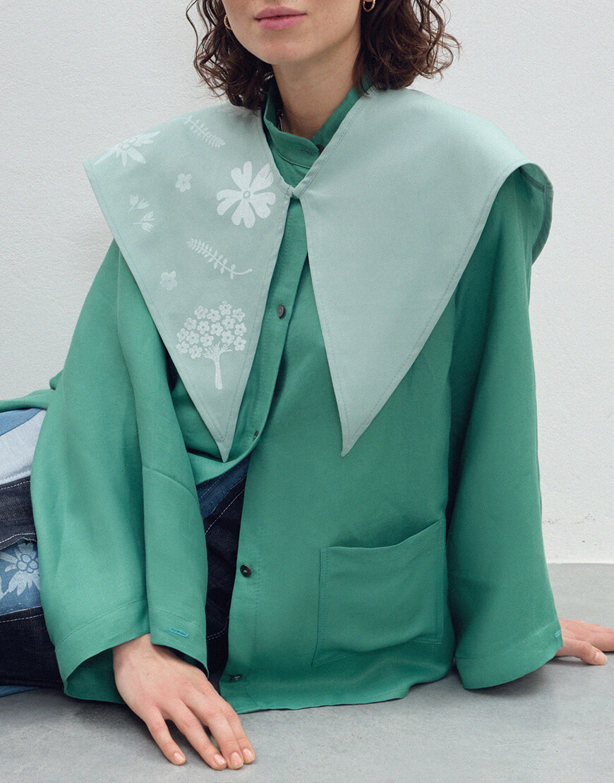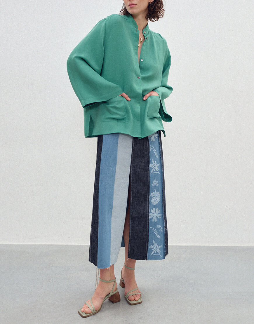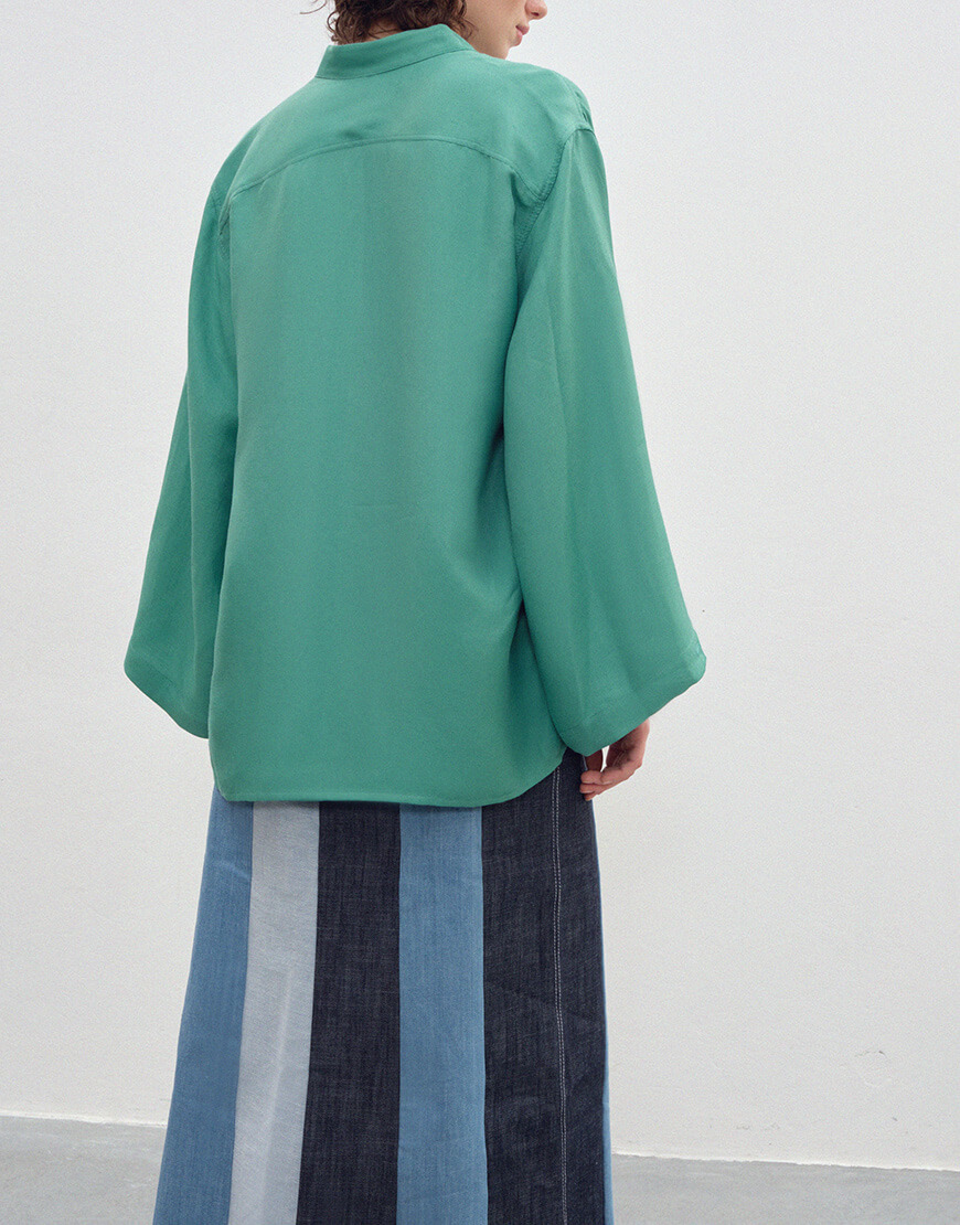 Сорочка зі стійкою та широкими рукавами з льону та віскози. Дві кишені