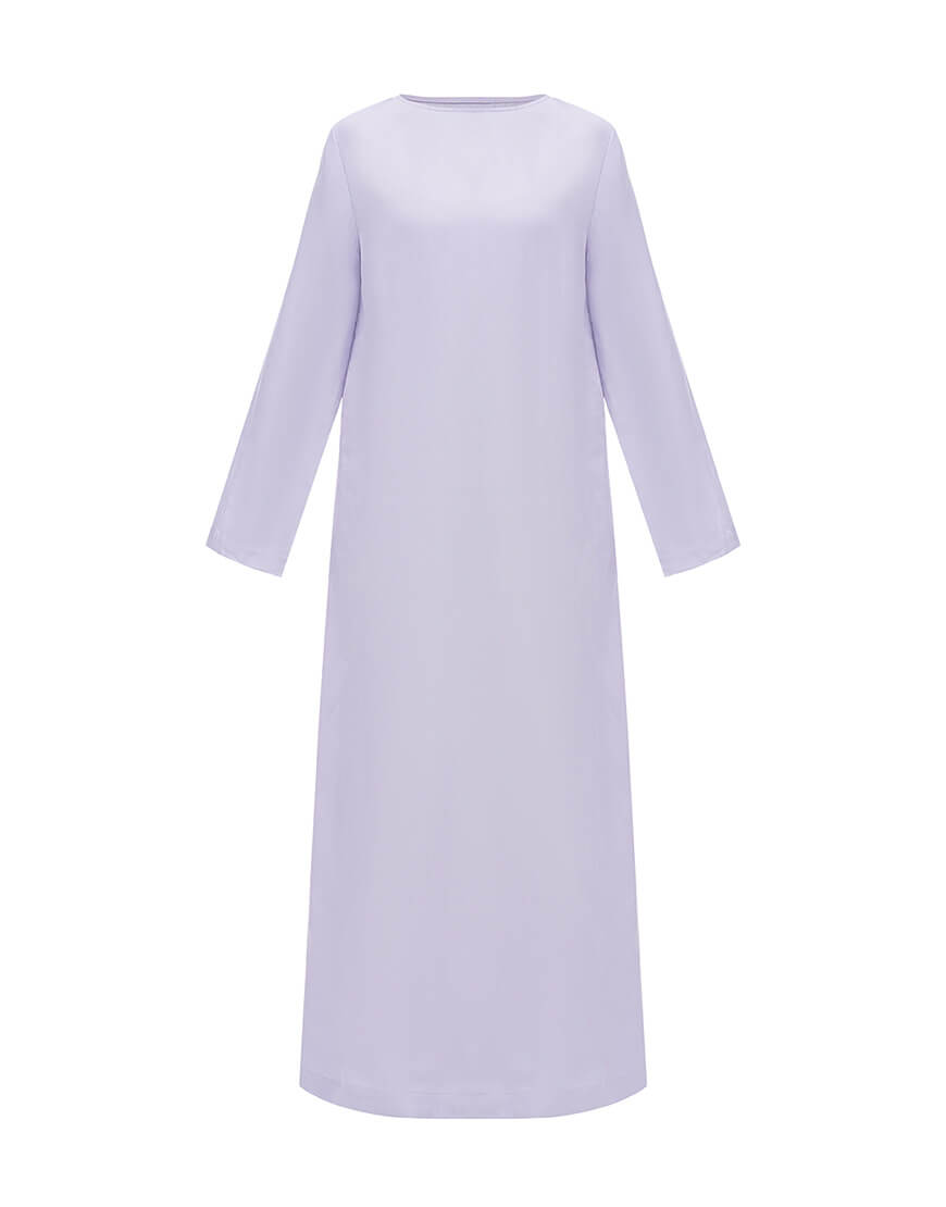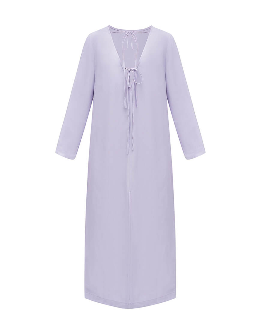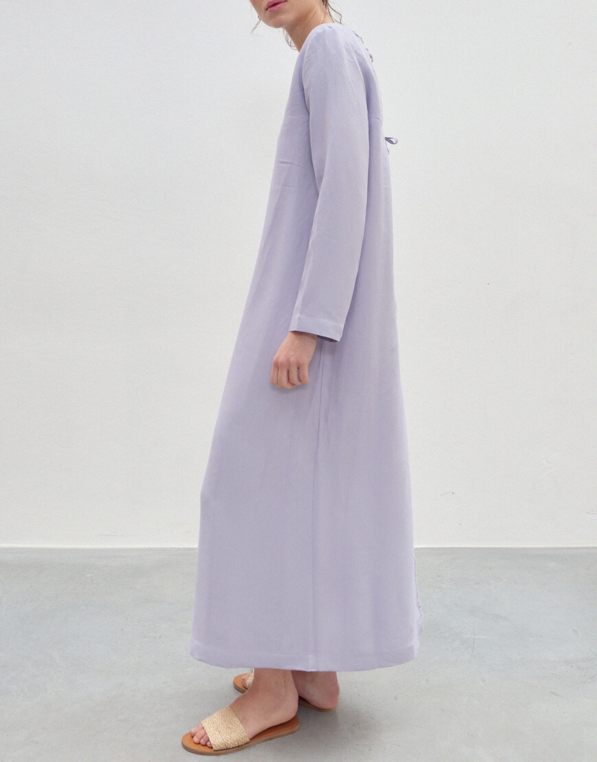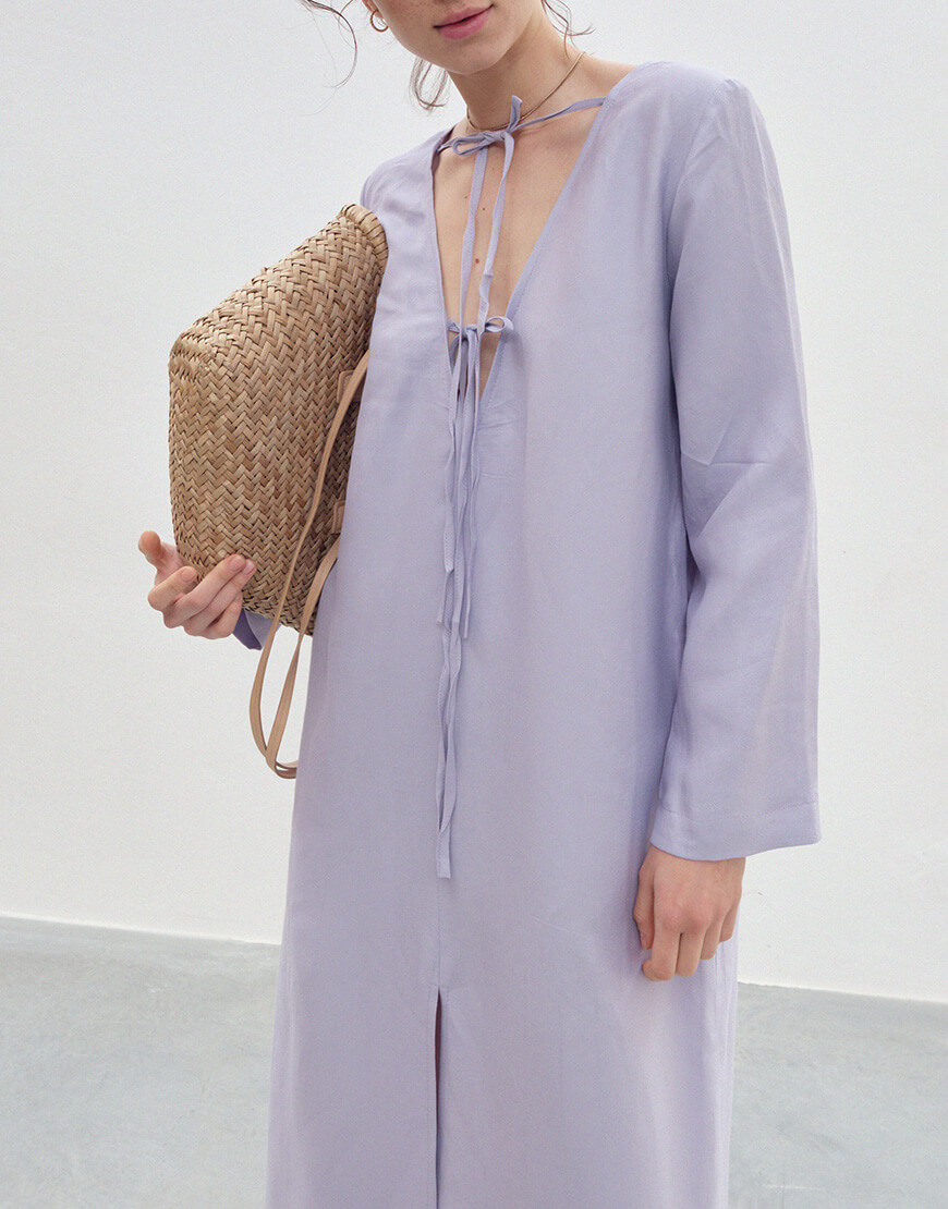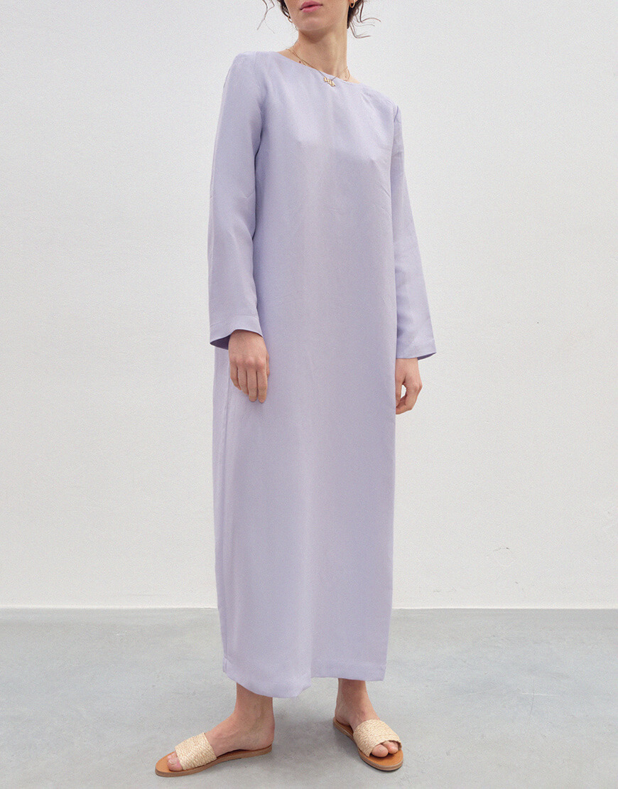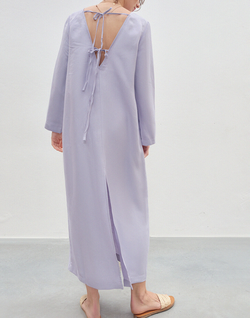 Сукня бузкового кольору з довгими рукавами та розрізом на спині. Двостороння – з однієї сторони виріз лодочка, з іншої V виріз на зав’язках.