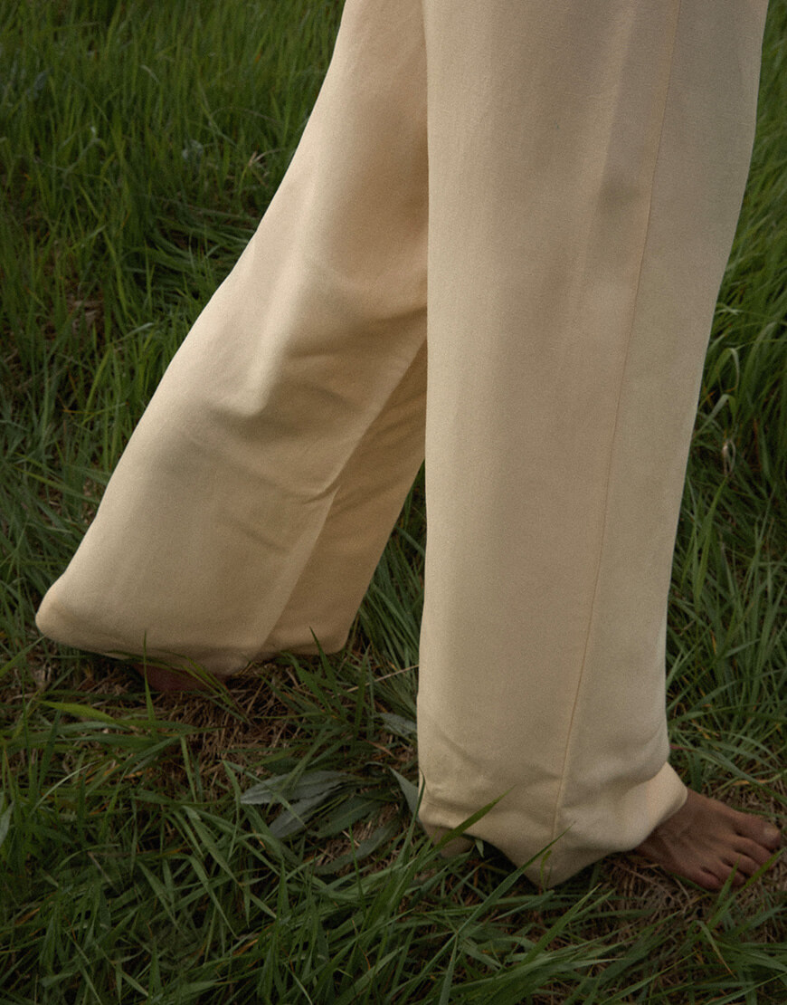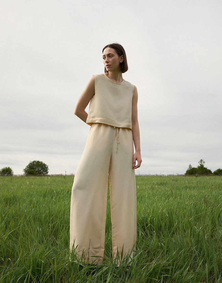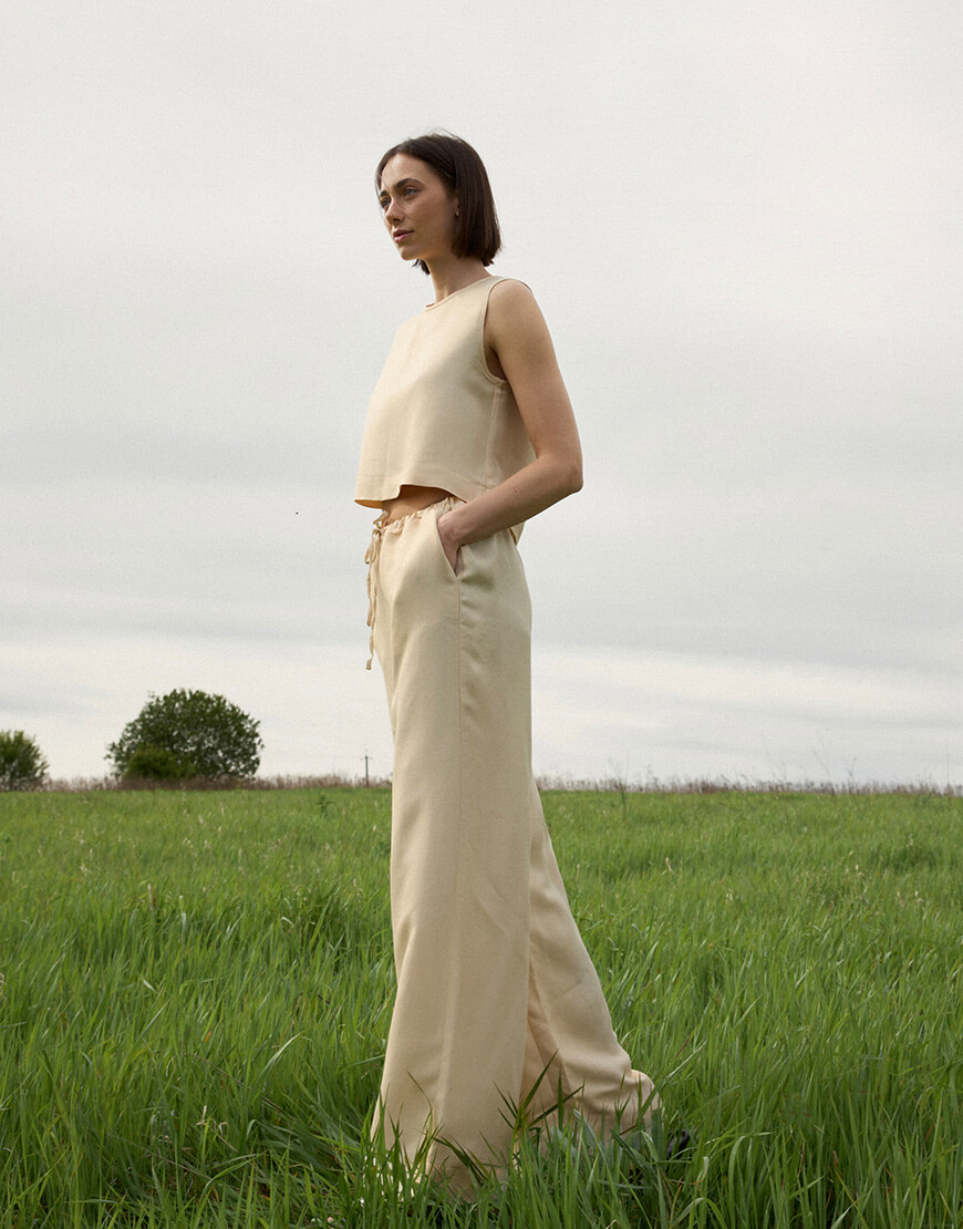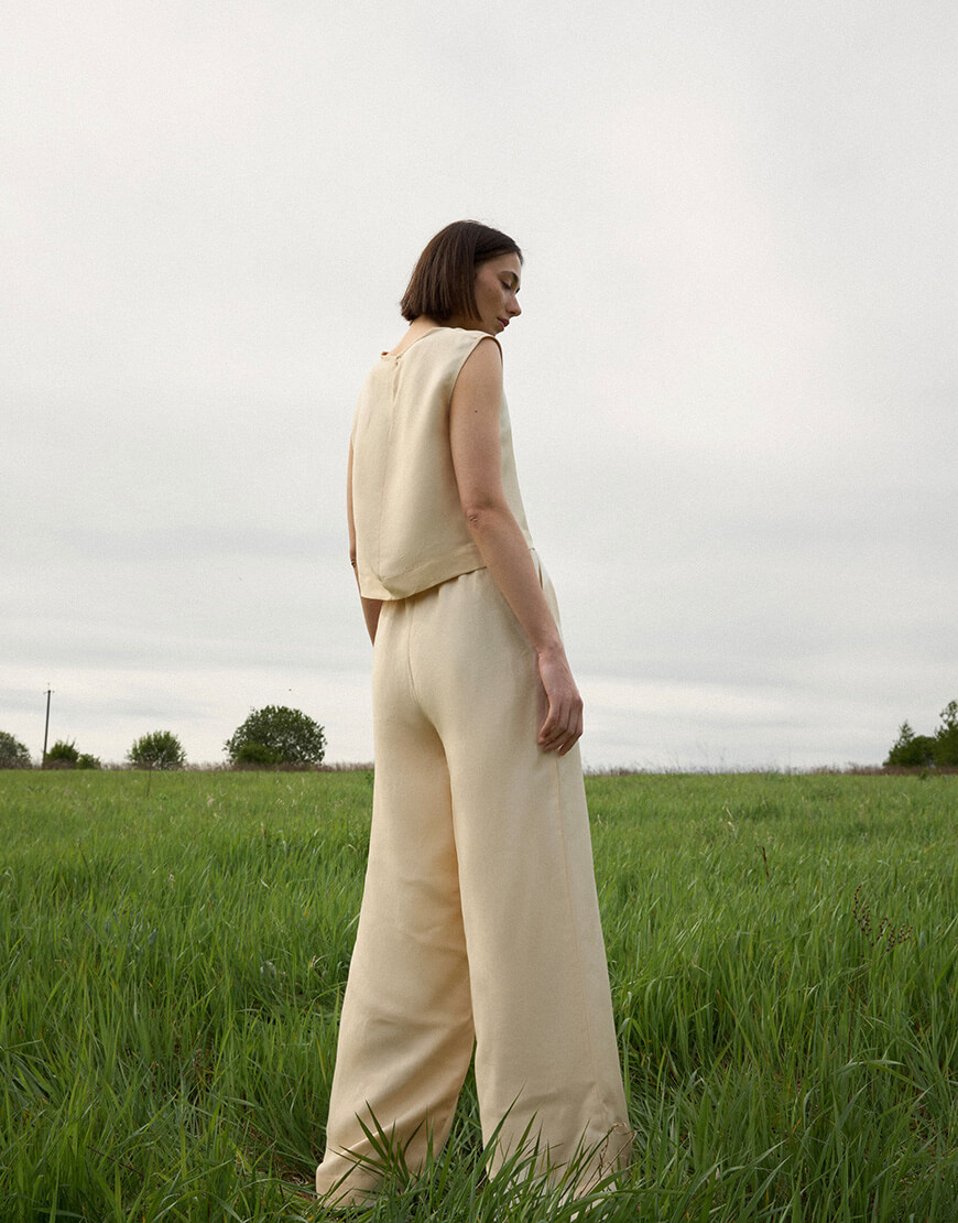 Костюм з натуральної тканини льон-віскози. Палаццо вільного крою на зав’язіці з кишенями. Вільний топ вкорочений