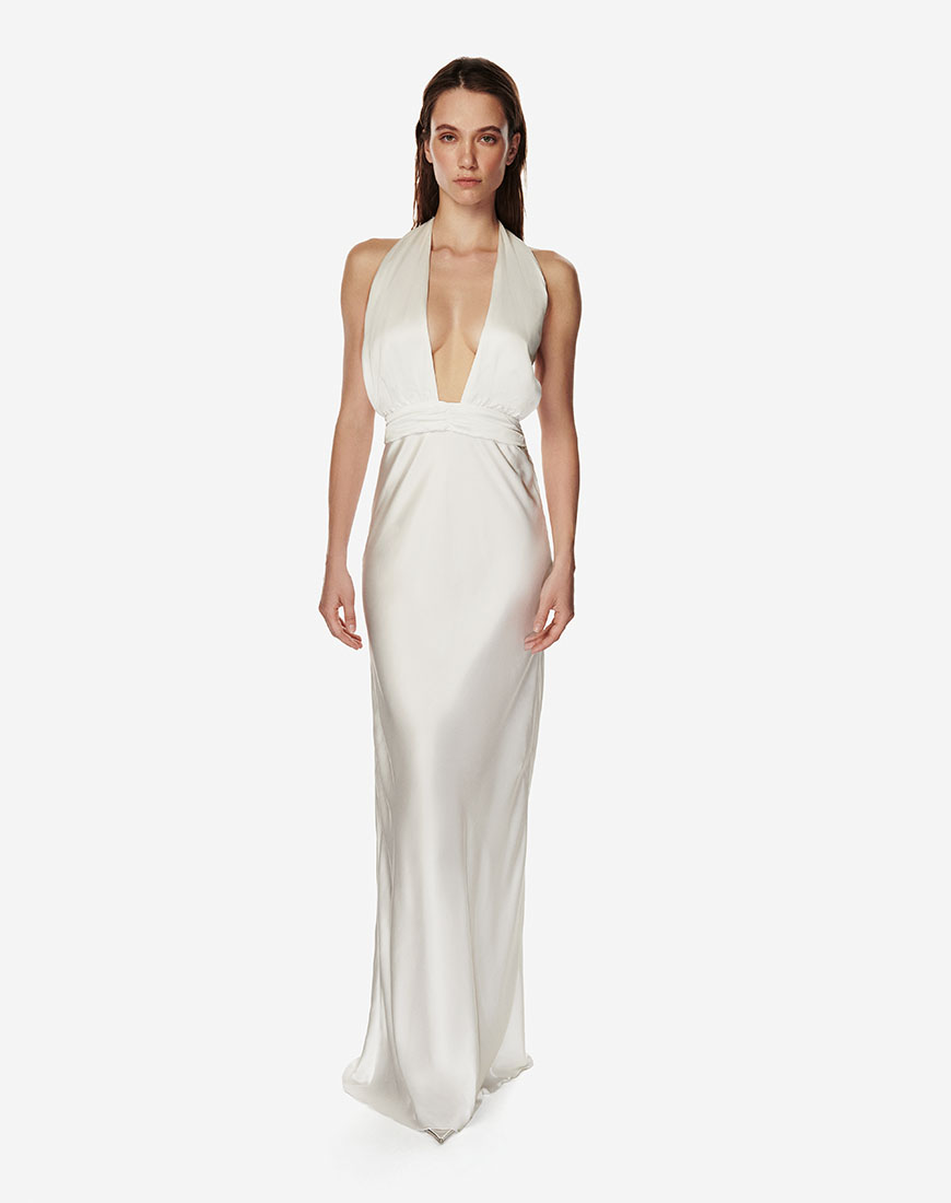Доставка впродовж 2-5 робочих днівДовга сатинова сукня зі схованою блискавкою збоку, глибоким V-вирізом, тонкою регульованою бретеллю ззаду та непомітним розрізом для зручності руху. Стримана, але чуттєва. Мінімалістична вишуканість, яка виглядає бездоганно на вечір.